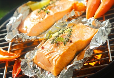 Pourquoi ne pas profiter de votre feu de camp pour y cuire votre souper? Le saumon, comme plusieurs poissons, cuit rapidement et n’a pas besoin de beaucoup de préparation. Choisissez un beau filet et assaisonnez-le d’une vinaigrette; utilisez-en une du commerce ou préparez vous-même une vinaigrette de base: huile d’olive, jus de citron, sel et poivre. Enveloppez le saumon dans un grand papier d’aluminium, en y ajoutant des légumes si vous le désirez, et placez le tout directement dans les braises, pendant une dizaine de minutes. Pas de vaisselle à laver, et la saveur est inégalée !