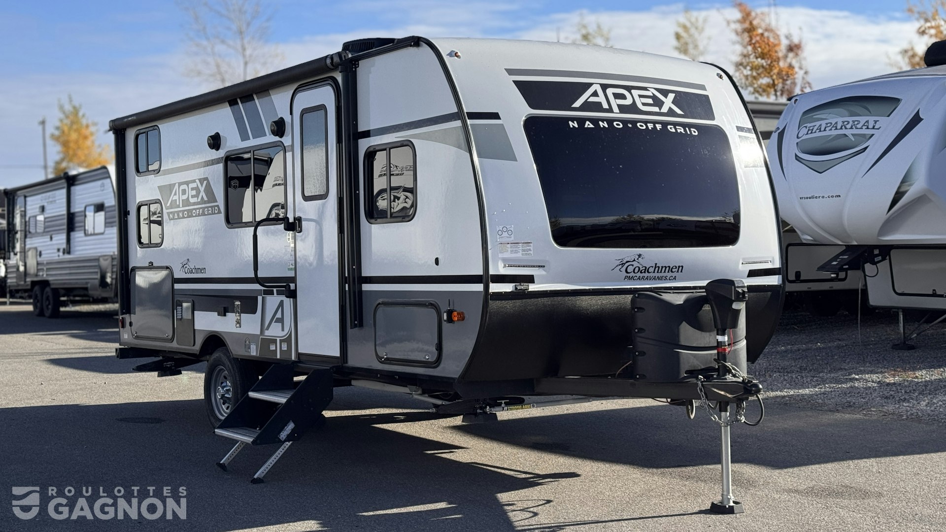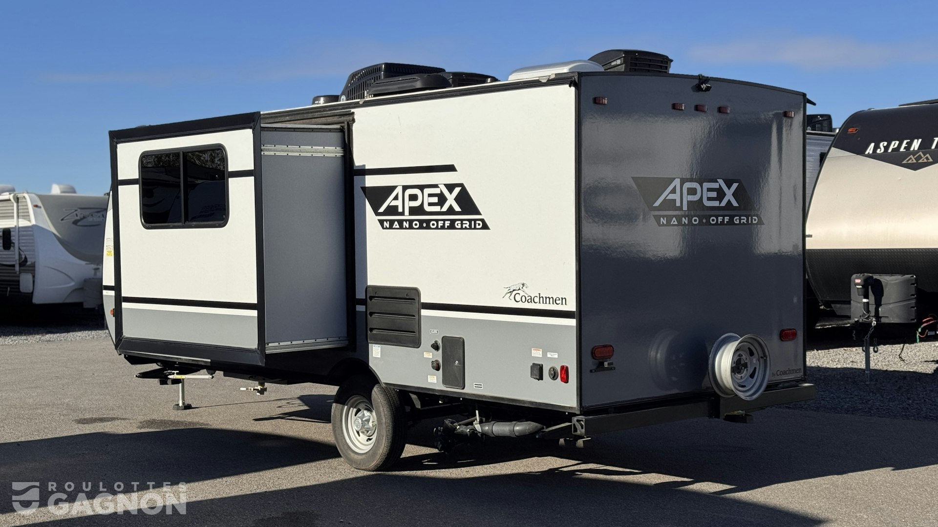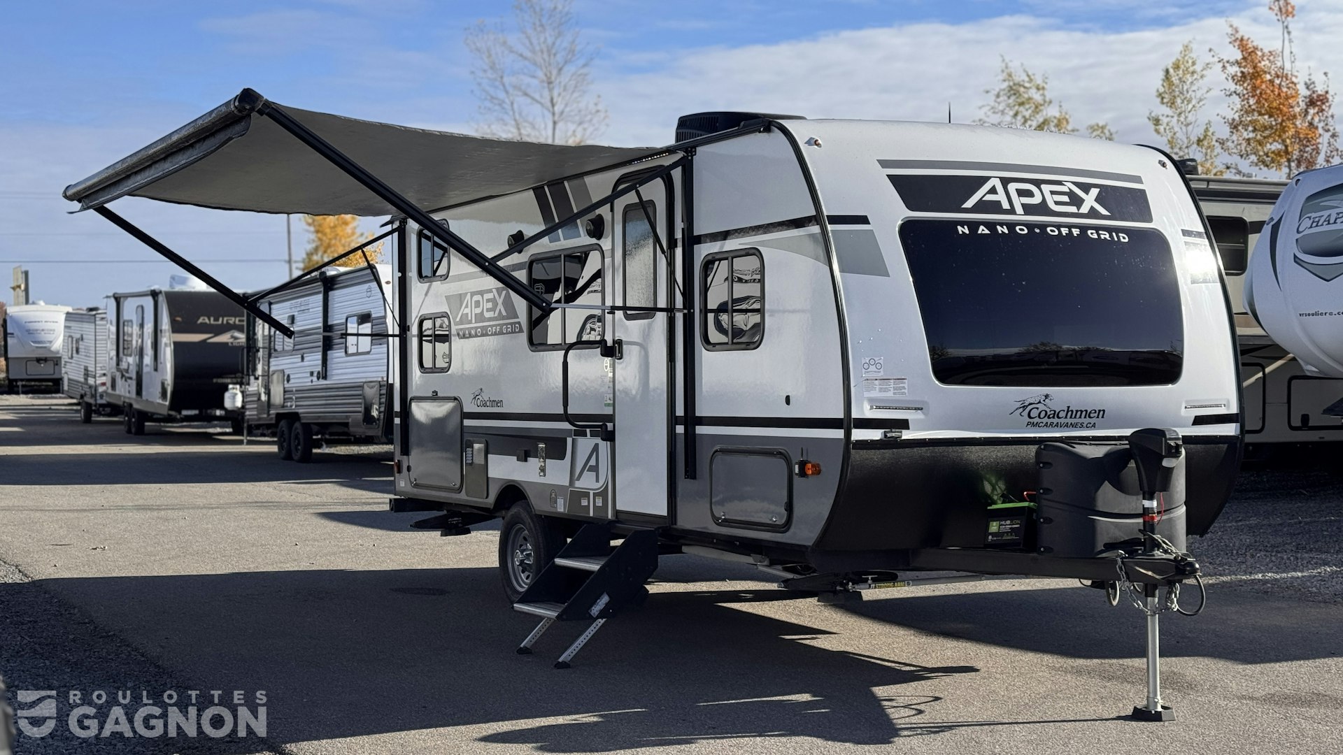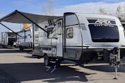 Roulotte Apex 194 BHS 2022 usagée à vendre. Cette roulotte de voyage fabriquée par Coachmen est idéale pour un couple et peut coucher jusqu’à 6 personnes. La Apex 194 BHS mesure 22 pieds et pèse 3 850 lb, son revêtement est en aluminium et les options suivantes sont incluses : vérins stabilisateurs électriques, caméra de recul incluse, auvent électrique, marche pied en un bloc (solid step), prise câble ou satellite, prise pour panneau solaire, prise USB, téléviseur, radio, hauts parleurs extérieurs, éclairage au DEL, cuisinette extérieure, climatiseur, puits de lumière, douche extérieure, aspirateur central et caméra sur les deux côtés.