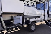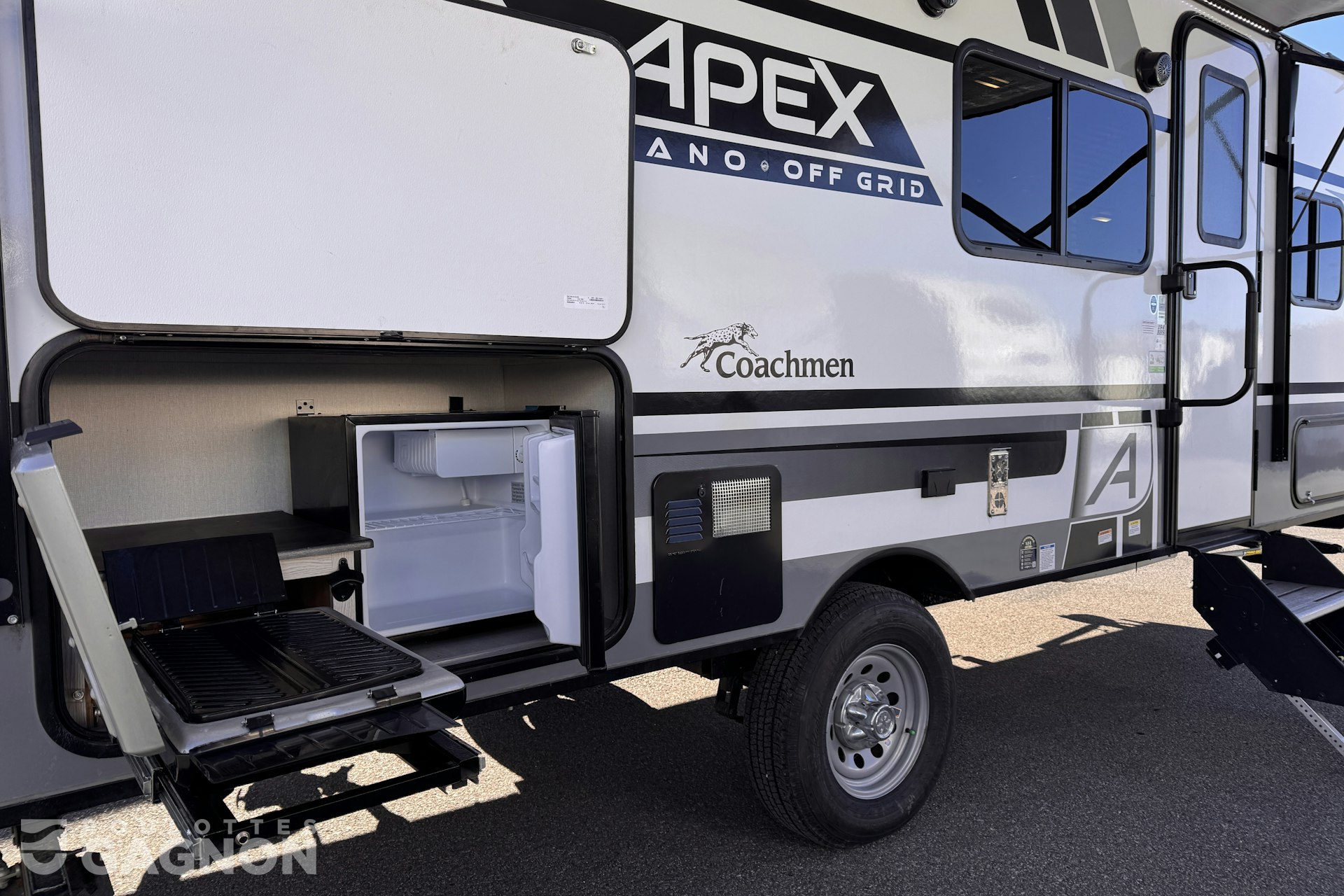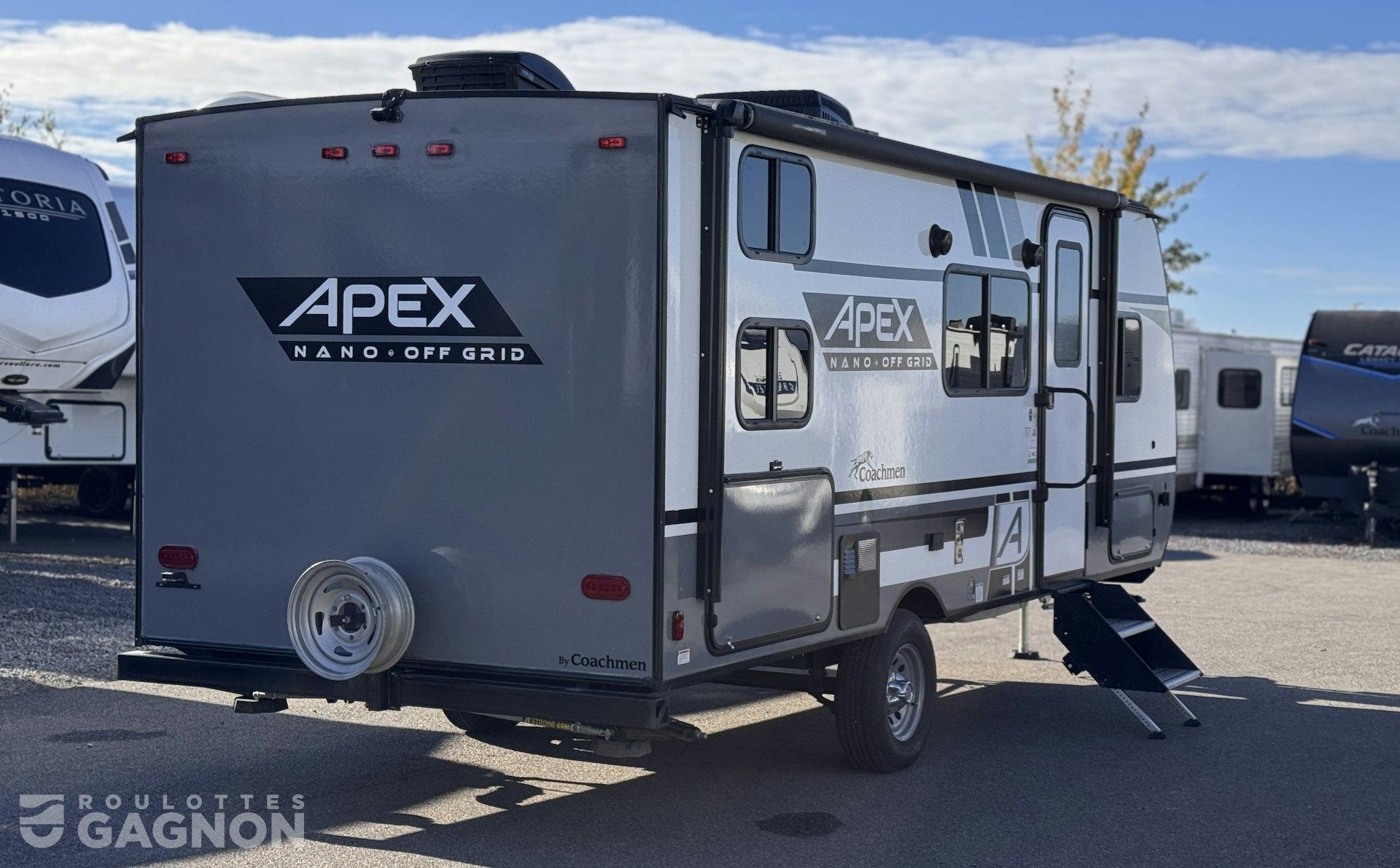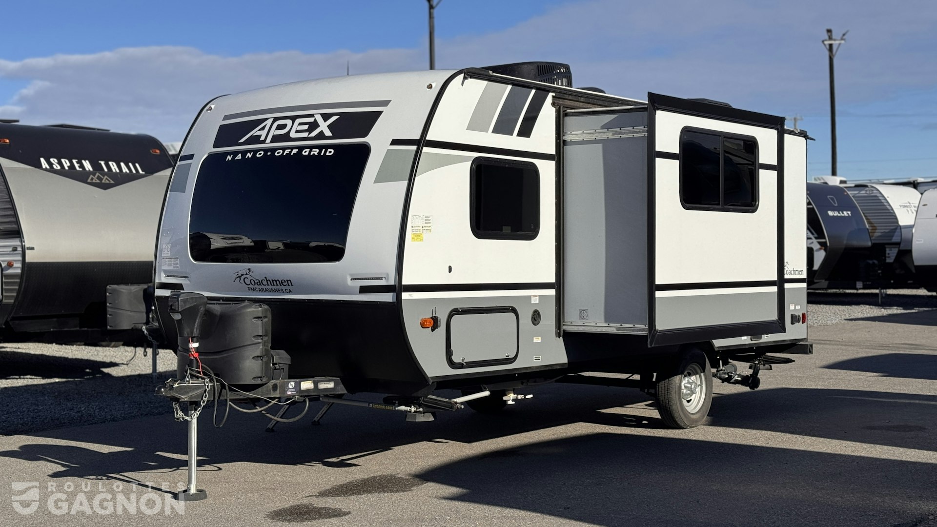 Roulotte Apex 194 BHS 2022 usagée à vendre. Cette roulotte de voyage fabriquée par Coachmen est idéale pour un couple et peut coucher jusqu’à 6 personnes. La Apex 194 BHS mesure 22 pieds et pèse 3 850 lb, son revêtement est en aluminium et les options suivantes sont incluses : vérins stabilisateurs électriques, caméra de recul incluse, auvent électrique, marche pied en un bloc (solid step), prise câble ou satellite, prise pour panneau solaire, prise USB, téléviseur, radio, hauts parleurs extérieurs, éclairage au DEL, cuisinette extérieure, climatiseur, puits de lumière, douche extérieure, aspirateur central et caméra sur les deux côtés.