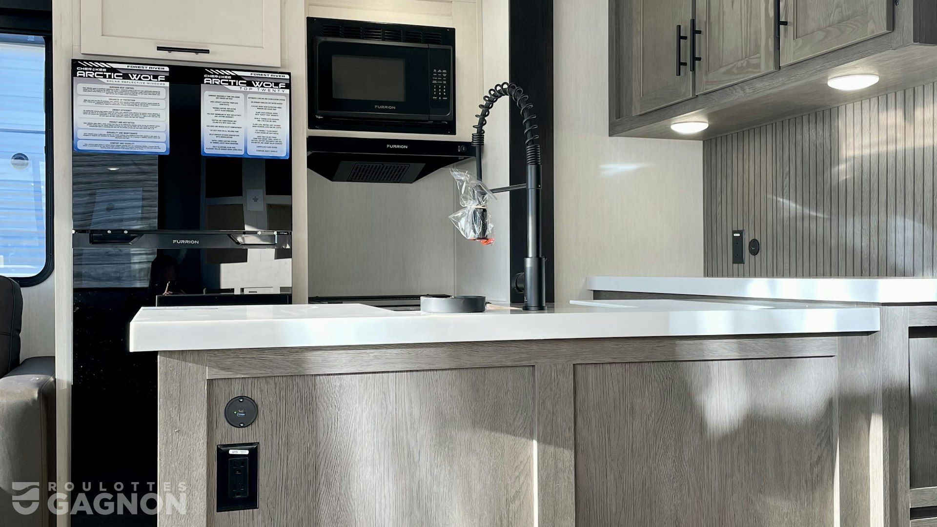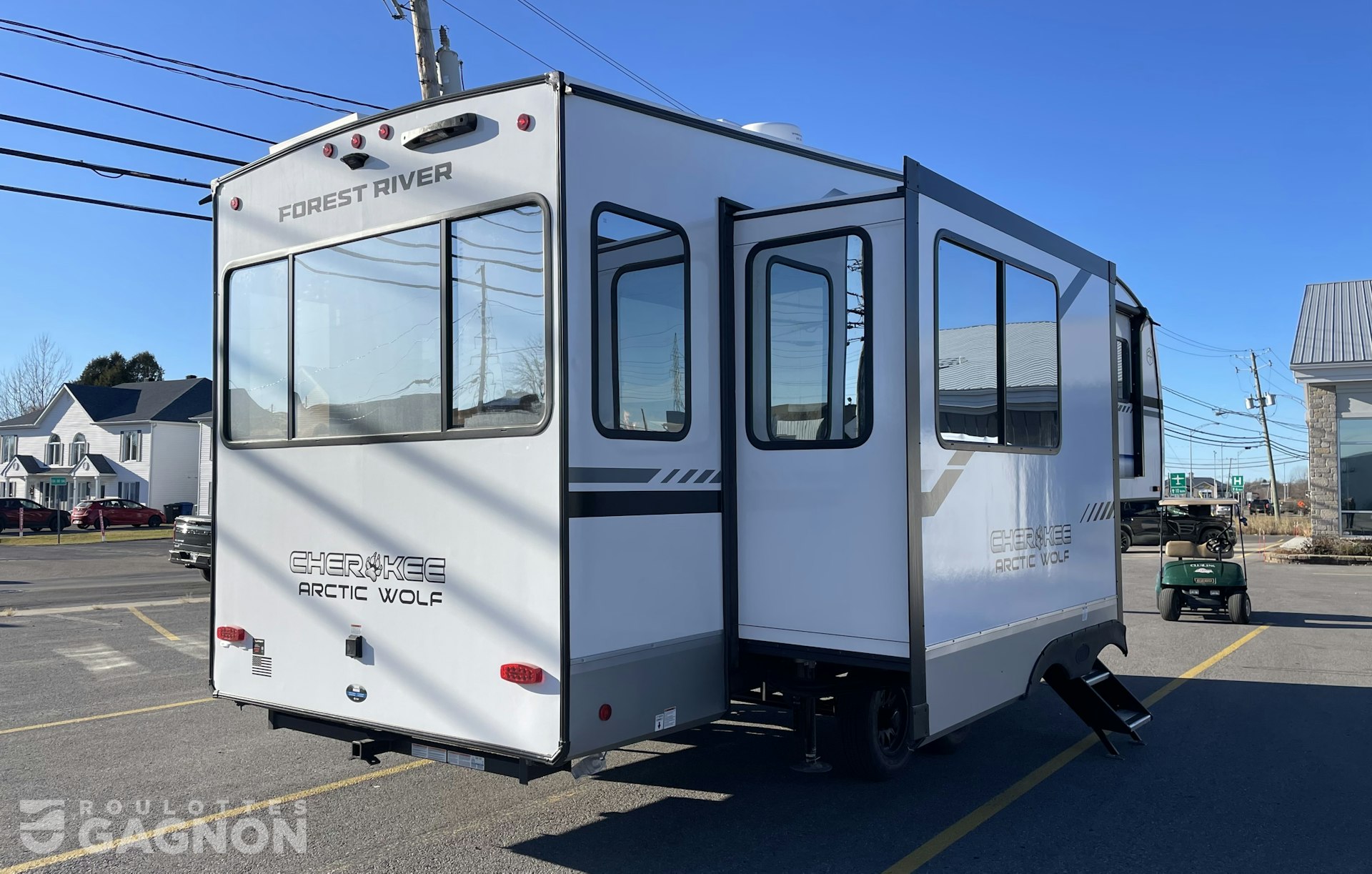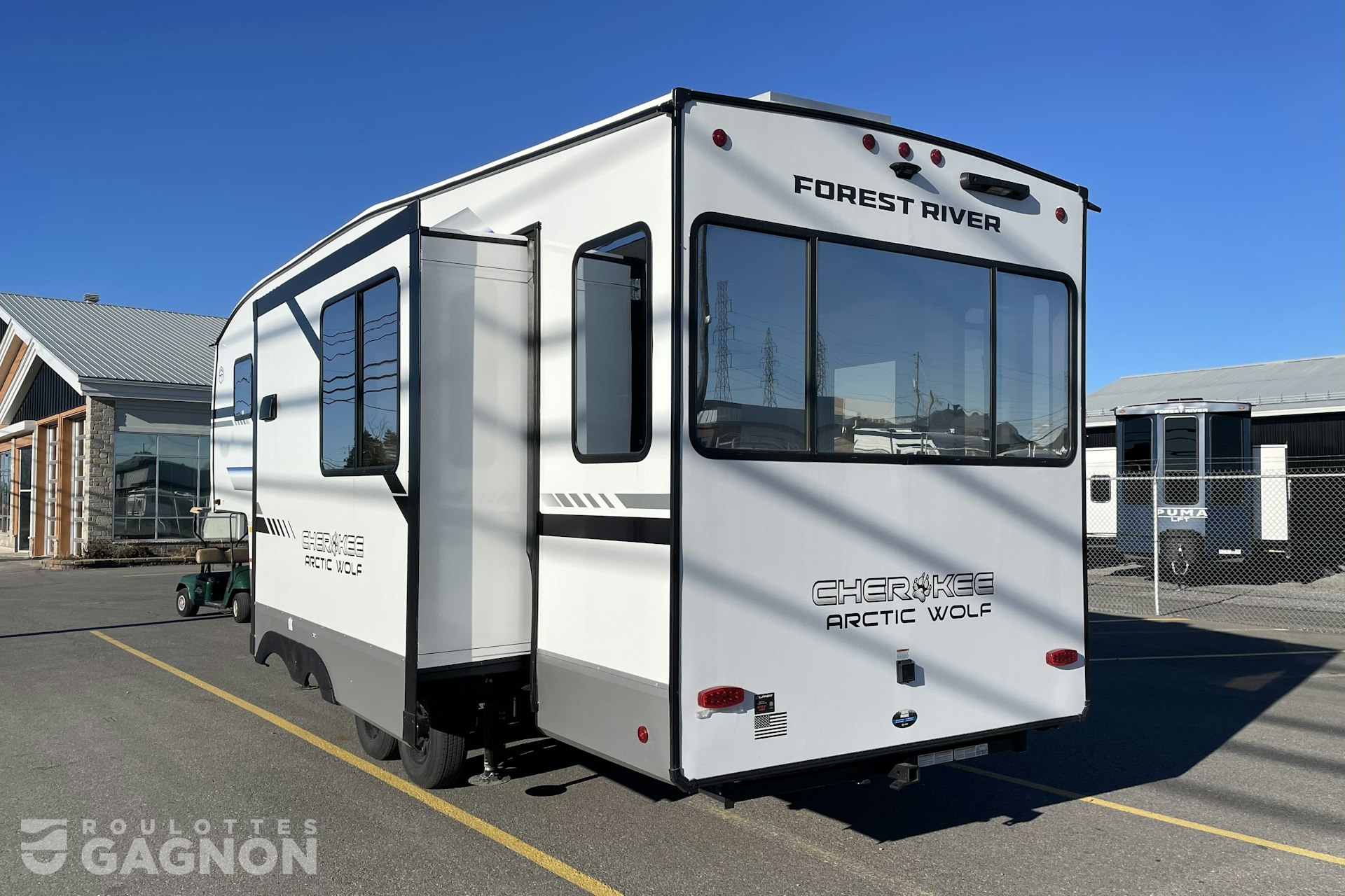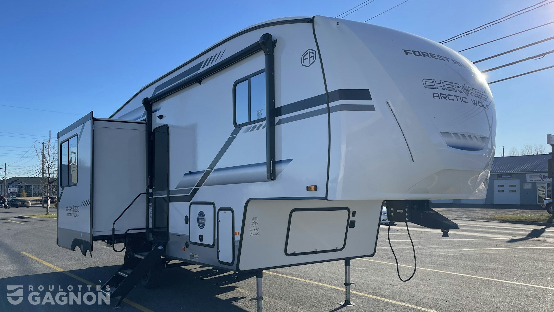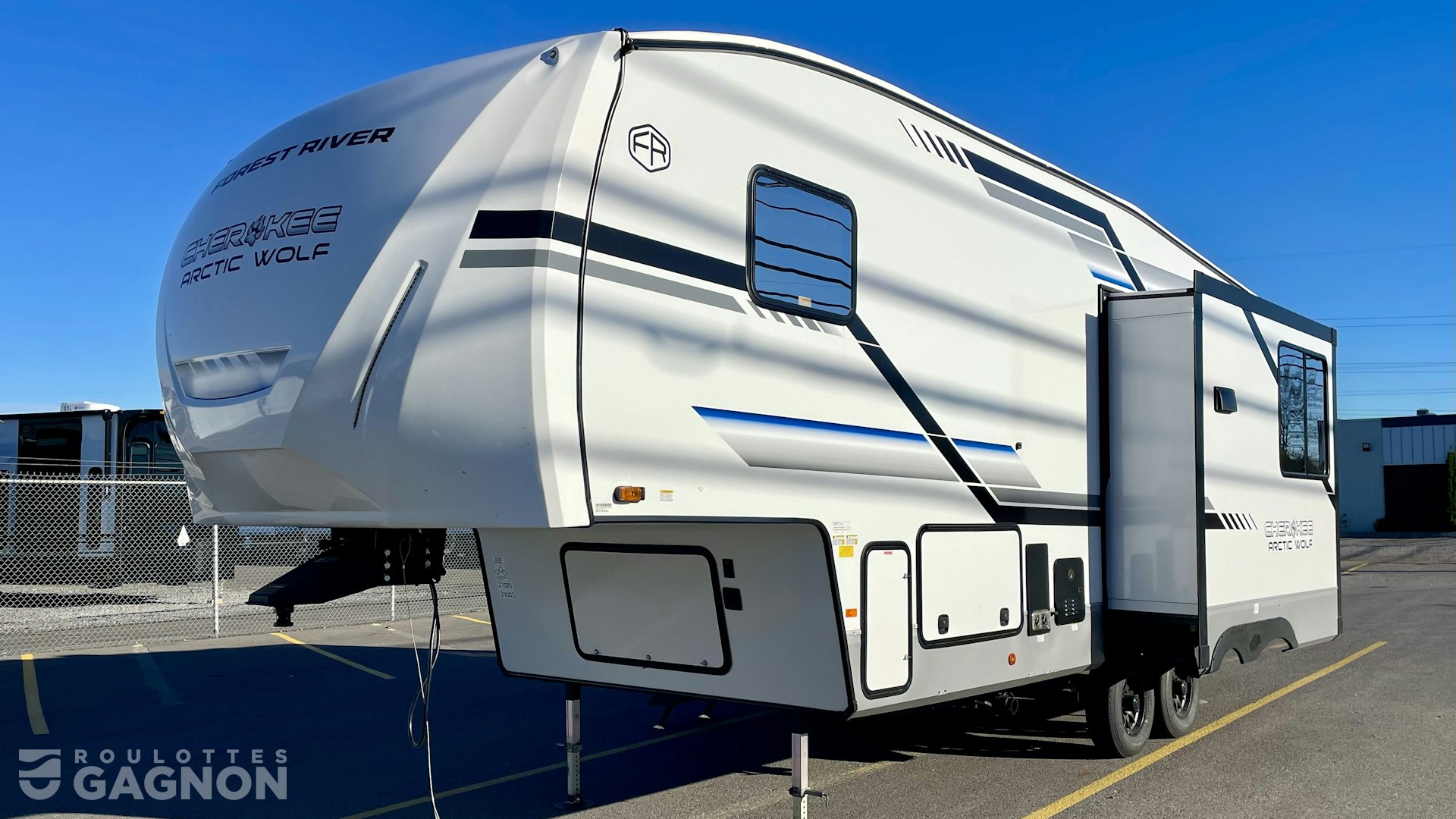 Roulotte Arctic Wolf 27 SGS 2025 neuve à vendre. Cette fifth wheel fabriquée par Forest River est idéale pour un couple et peut coucher jusqu’à 4 personnes. La Arctic Wolf 27 SGS mesure 29,1 pieds et pèse 8 075 lb, son revêtement est en fibre de verre sur Azdel et les options suivantes sont incluses : jack de pole électrique, vérins stabilisateurs auto-nivelants, préparation pour caméra de recul, auvent électrique, marche pied en un bloc (solid step), prise câble ou satellite, prise USB, éclairage au DEL, climatiseur, puits de lumière, douche extérieure, mags, chauffe-eau instantané, éclairage à intensité variable, panneau solaire, foyer électrique, prises usb c, balayeuse centrale, préparation pour caméra au dessus de la porte, hitch arrière et verre énergétique réfléchissant.