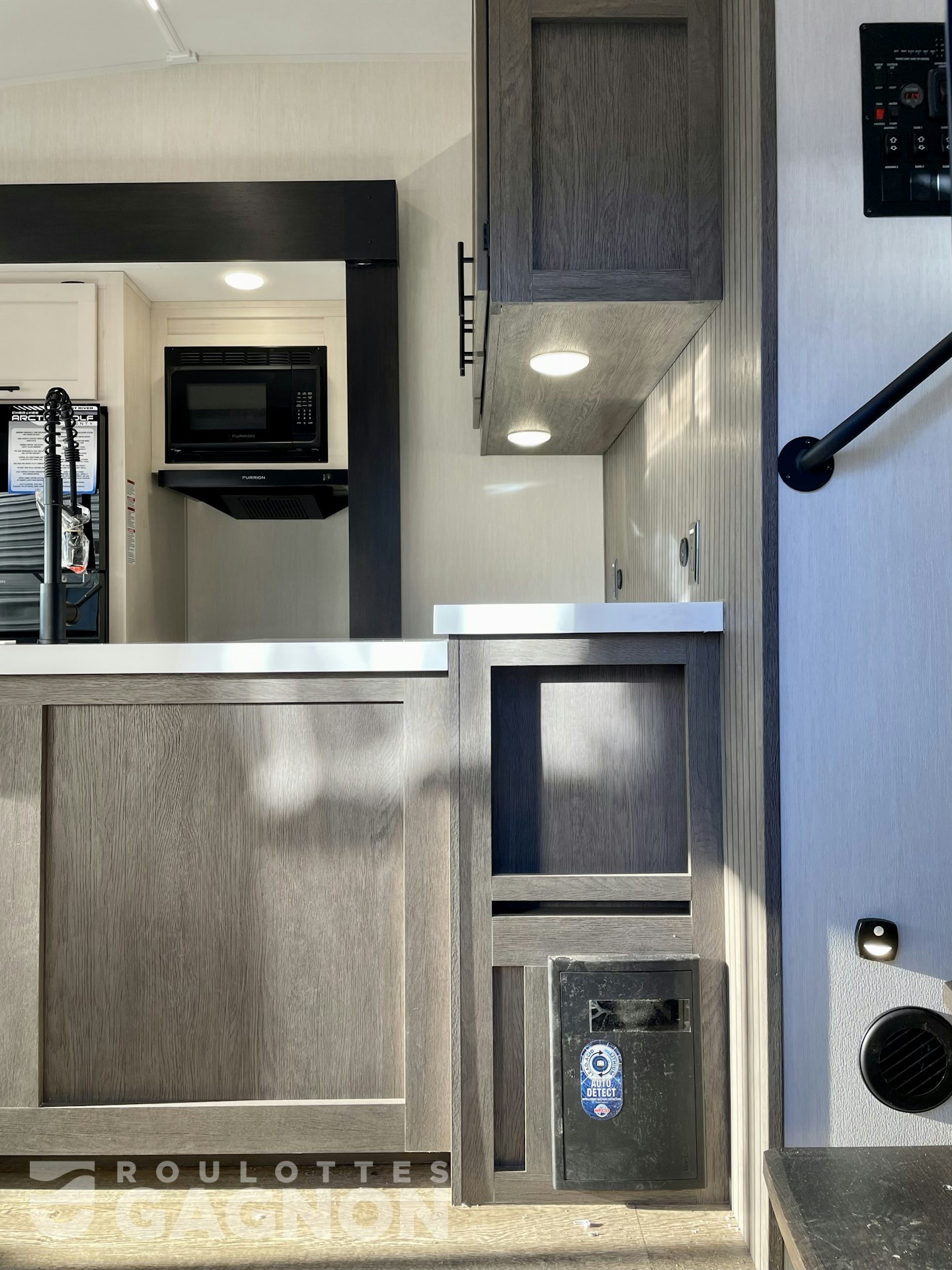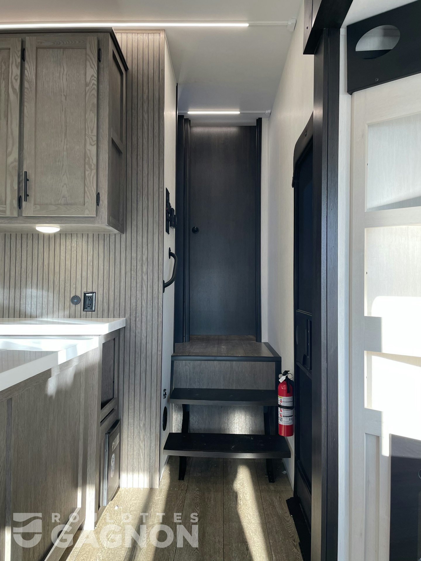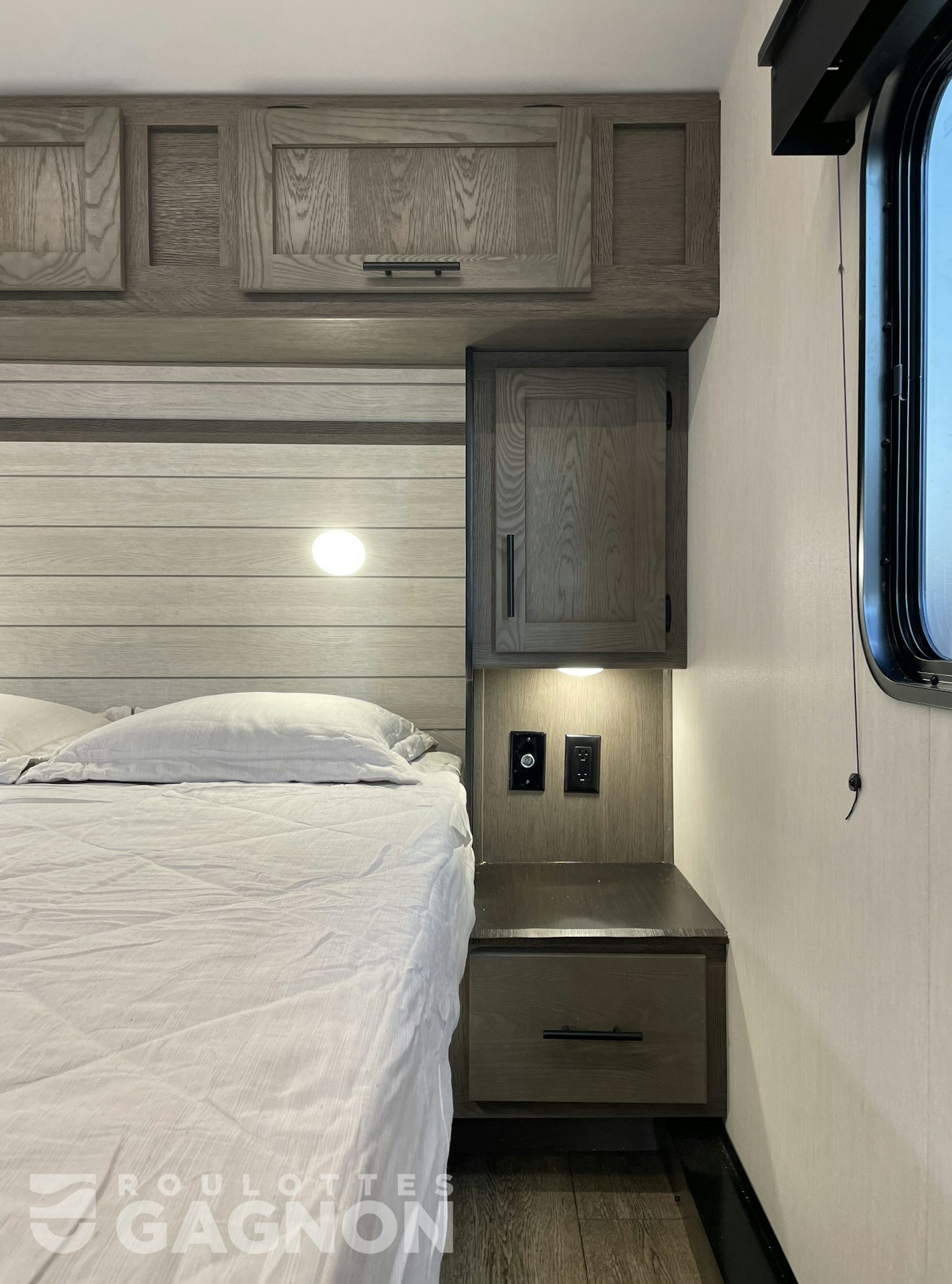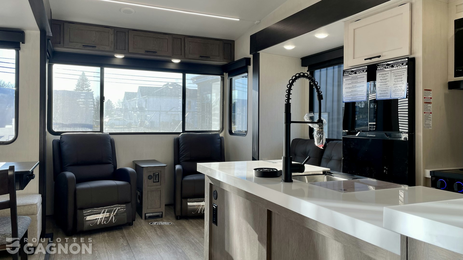 Roulotte Arctic Wolf 27 SGS 2025 neuve à vendre. Cette fifth wheel fabriquée par Forest River est idéale pour un couple et peut coucher jusqu’à 4 personnes. La Arctic Wolf 27 SGS mesure 29,1 pieds et pèse 8 075 lb, son revêtement est en fibre de verre sur Azdel et les options suivantes sont incluses : jack de pole électrique, vérins stabilisateurs auto-nivelants, préparation pour caméra de recul, auvent électrique, marche pied en un bloc (solid step), prise câble ou satellite, prise USB, éclairage au DEL, climatiseur, puits de lumière, douche extérieure, mags, chauffe-eau instantané, éclairage à intensité variable, panneau solaire, foyer électrique, prises usb c, balayeuse centrale, préparation pour caméra au dessus de la porte, hitch arrière et verre énergétique réfléchissant.