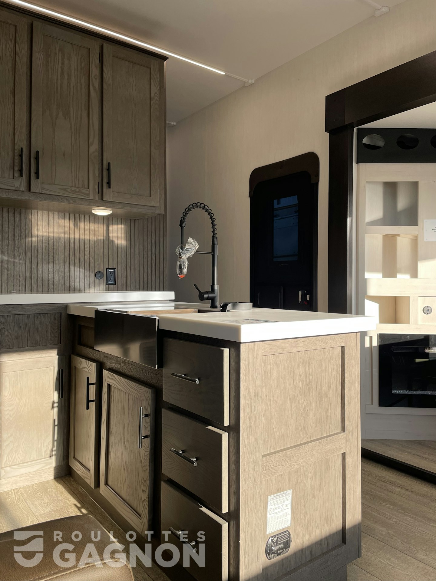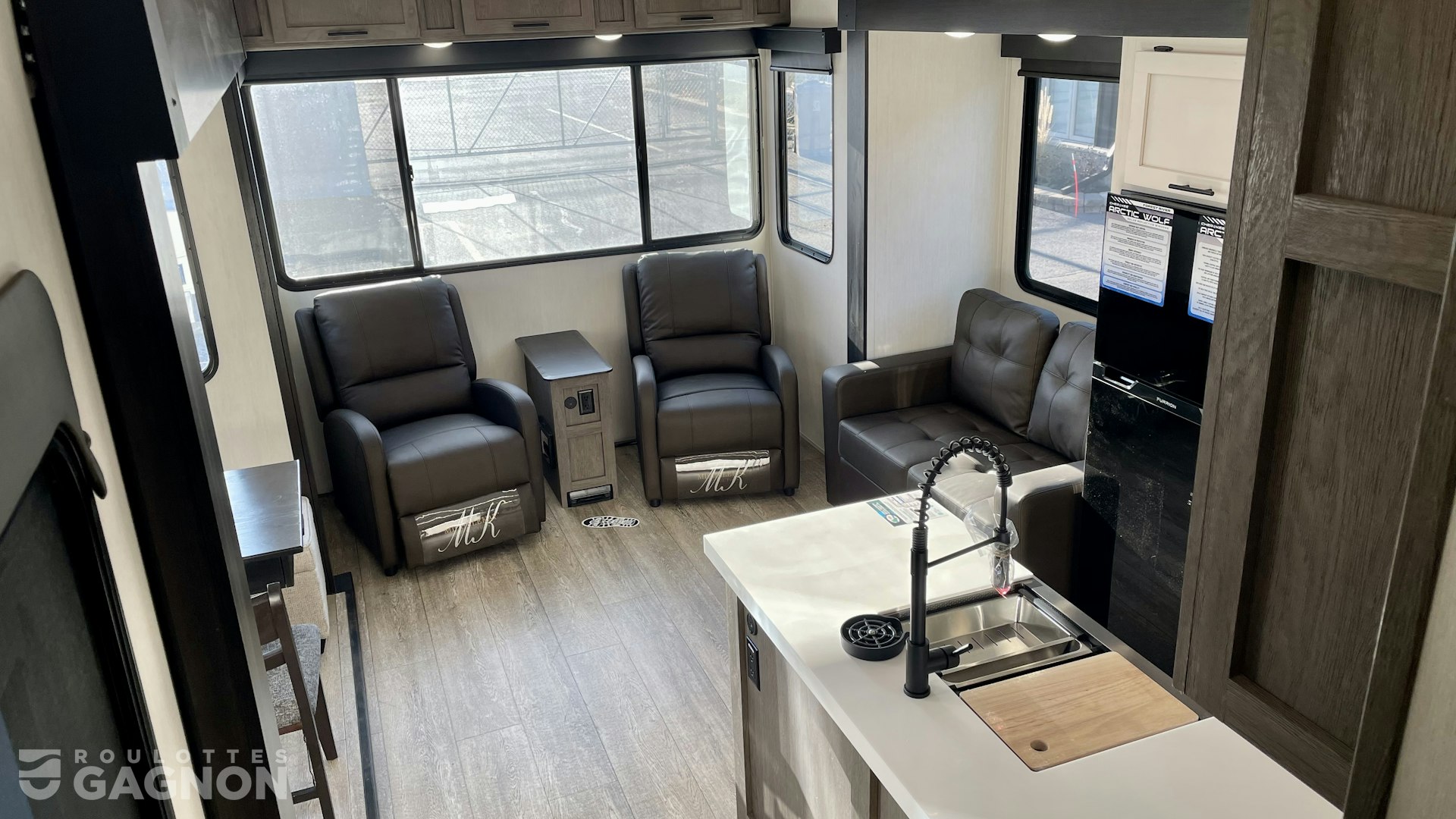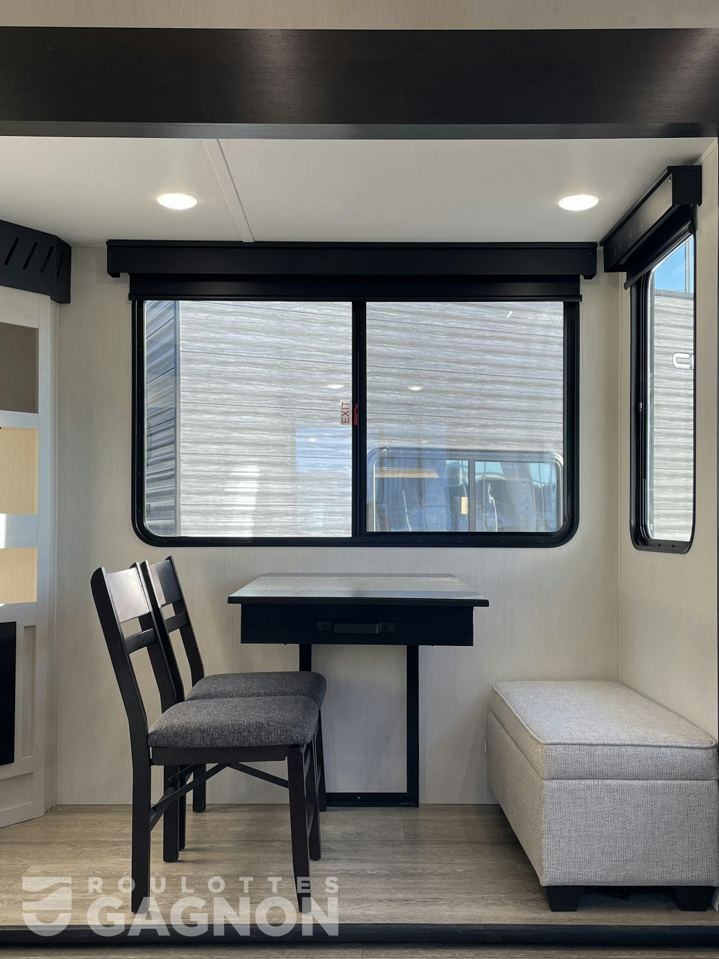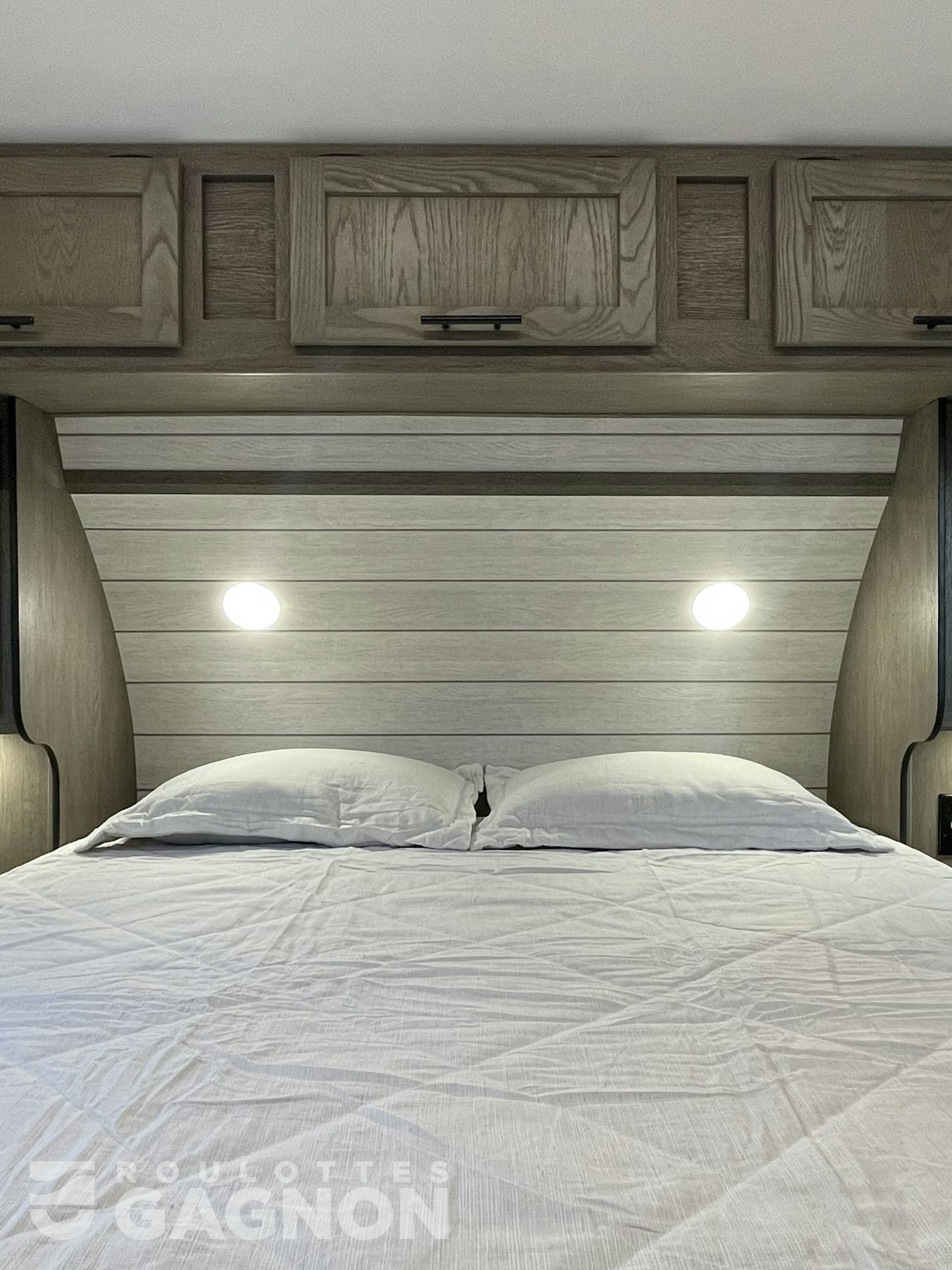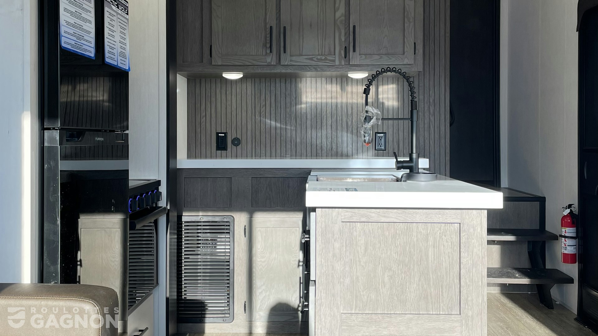Roulotte Arctic Wolf 27 SGS 2025 neuve à vendre. Cette fifth wheel fabriquée par Forest River est idéale pour un couple et peut coucher jusqu’à 4 personnes. La Arctic Wolf 27 SGS mesure 29,1 pieds et pèse 8 075 lb, son revêtement est en fibre de verre sur Azdel et les options suivantes sont incluses : jack de pole électrique, vérins stabilisateurs auto-nivelants, préparation pour caméra de recul, auvent électrique, marche pied en un bloc (solid step), prise câble ou satellite, prise USB, éclairage au DEL, climatiseur, puits de lumière, douche extérieure, mags, chauffe-eau instantané, éclairage à intensité variable, panneau solaire, foyer électrique, prises usb c, balayeuse centrale, préparation pour caméra au dessus de la porte, hitch arrière et verre énergétique réfléchissant.