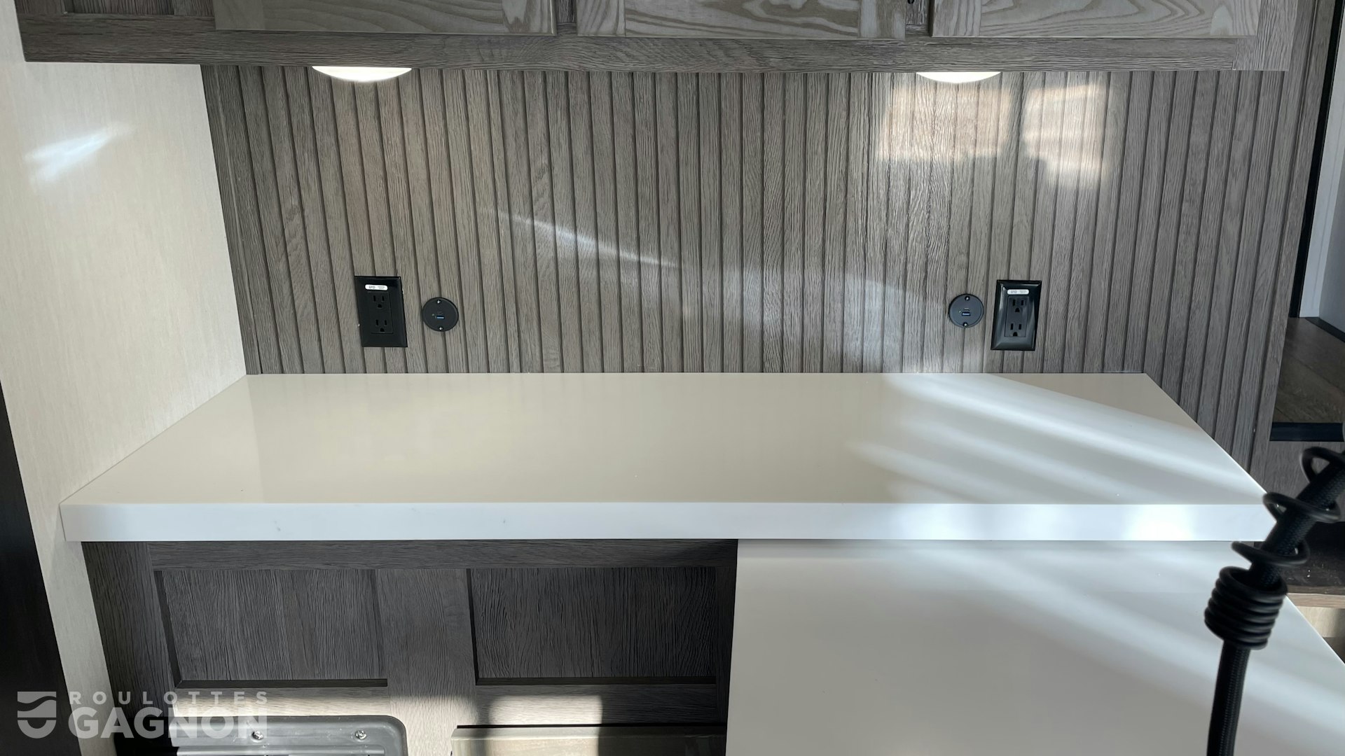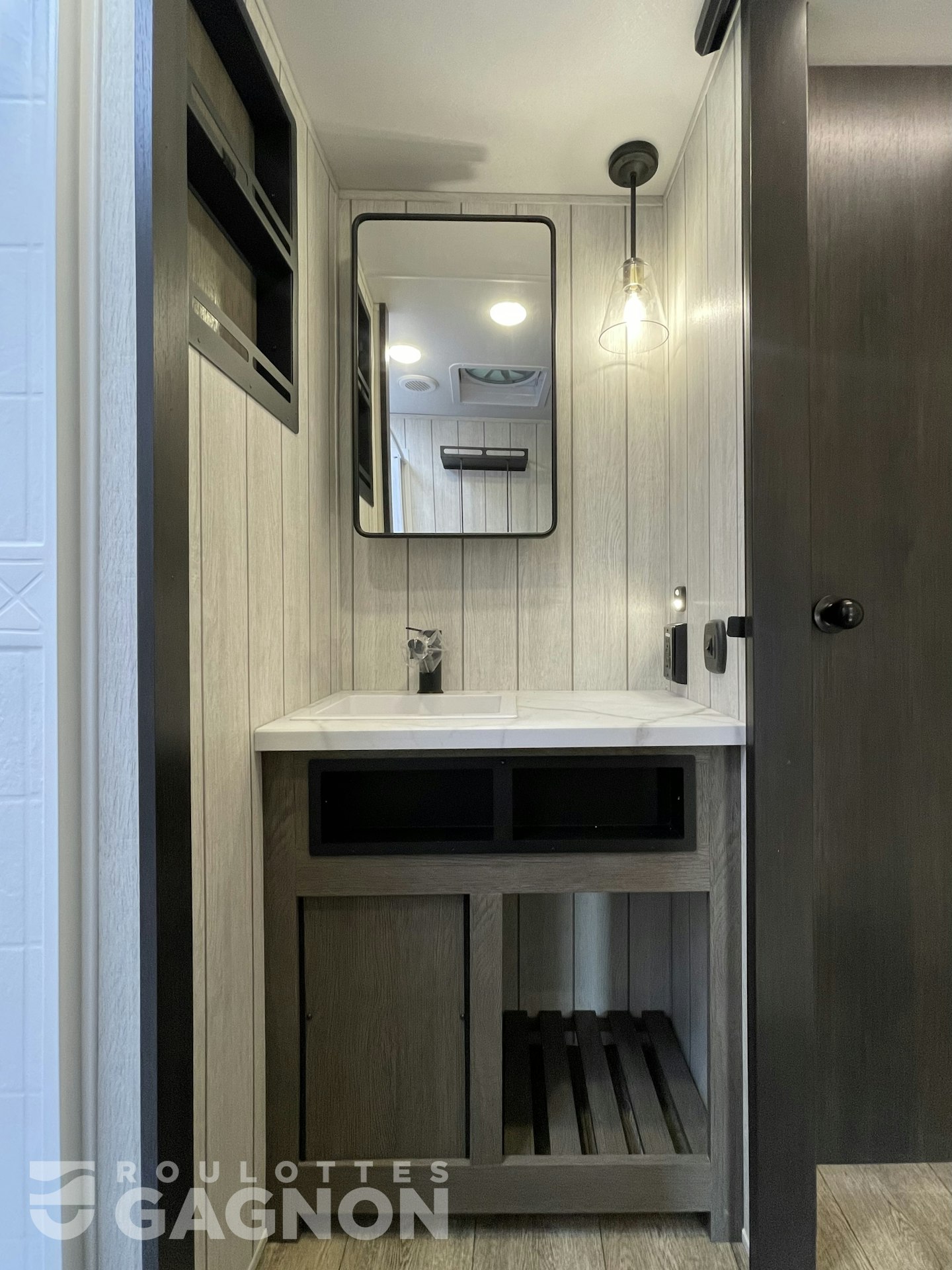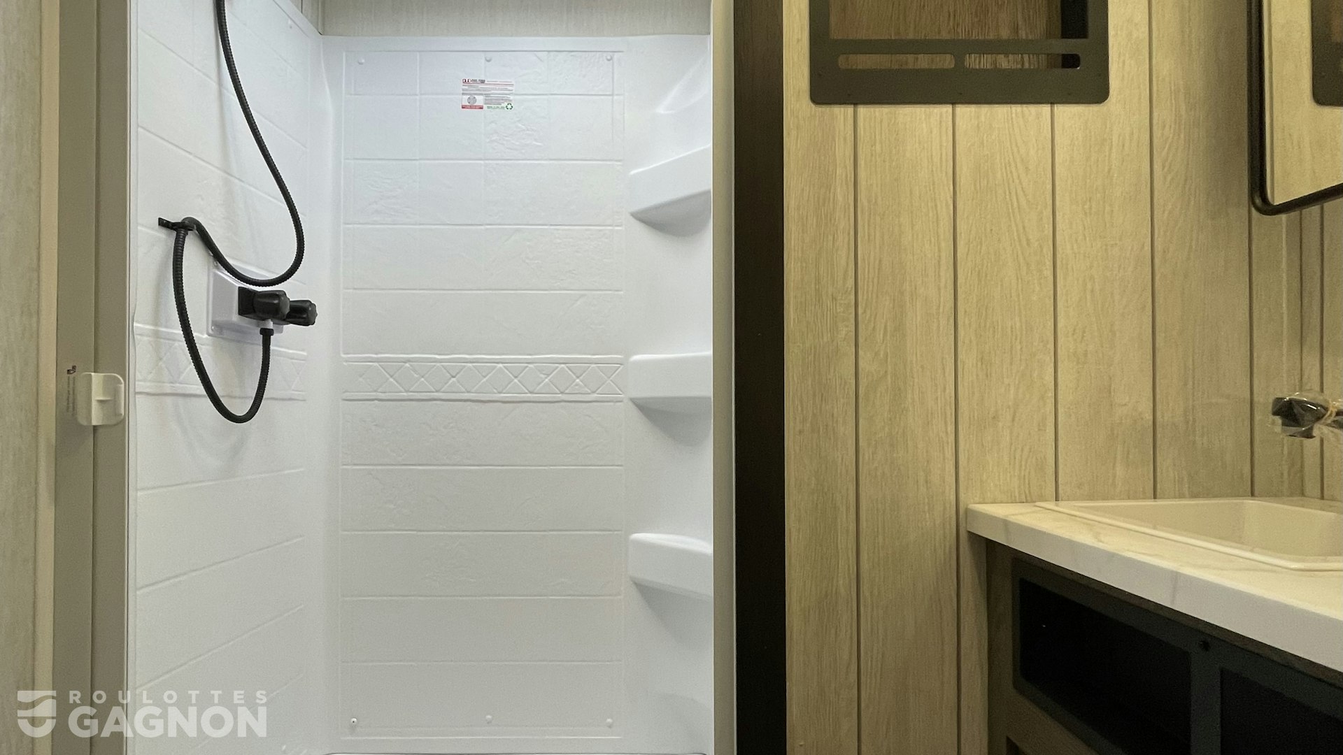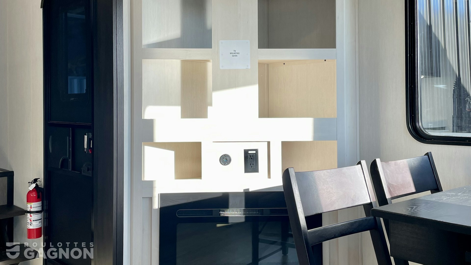 Roulotte Arctic Wolf 27 SGS 2025 neuve à vendre. Cette fifth wheel fabriquée par Forest River est idéale pour un couple et peut coucher jusqu’à 4 personnes. La Arctic Wolf 27 SGS mesure 29,1 pieds et pèse 8 075 lb, son revêtement est en fibre de verre sur Azdel et les options suivantes sont incluses : jack de pole électrique, vérins stabilisateurs auto-nivelants, préparation pour caméra de recul, auvent électrique, marche pied en un bloc (solid step), prise câble ou satellite, prise USB, éclairage au DEL, climatiseur, puits de lumière, douche extérieure, mags, chauffe-eau instantané, éclairage à intensité variable, panneau solaire, foyer électrique, prises usb c, balayeuse centrale, préparation pour caméra au dessus de la porte, hitch arrière et verre énergétique réfléchissant.