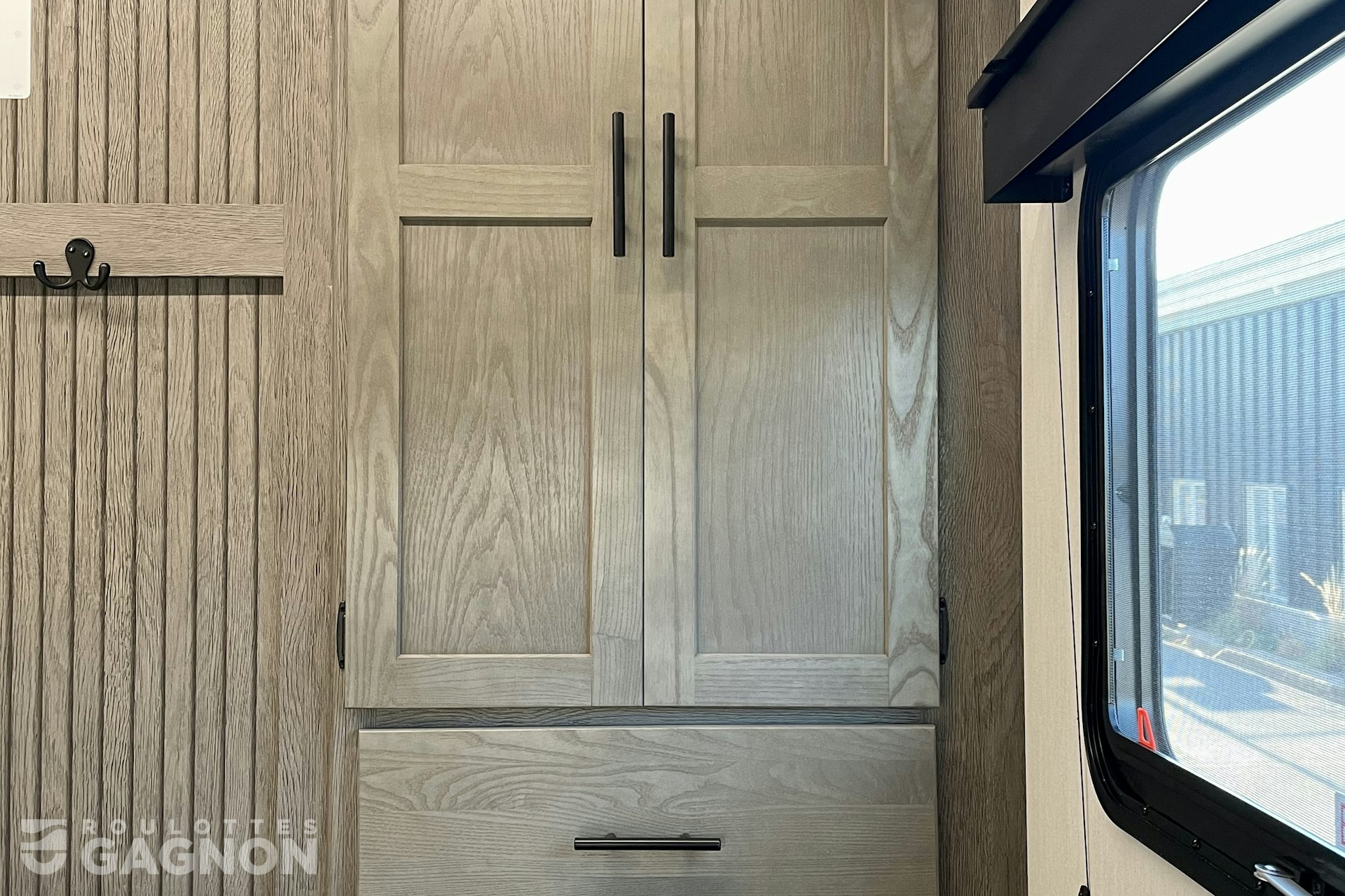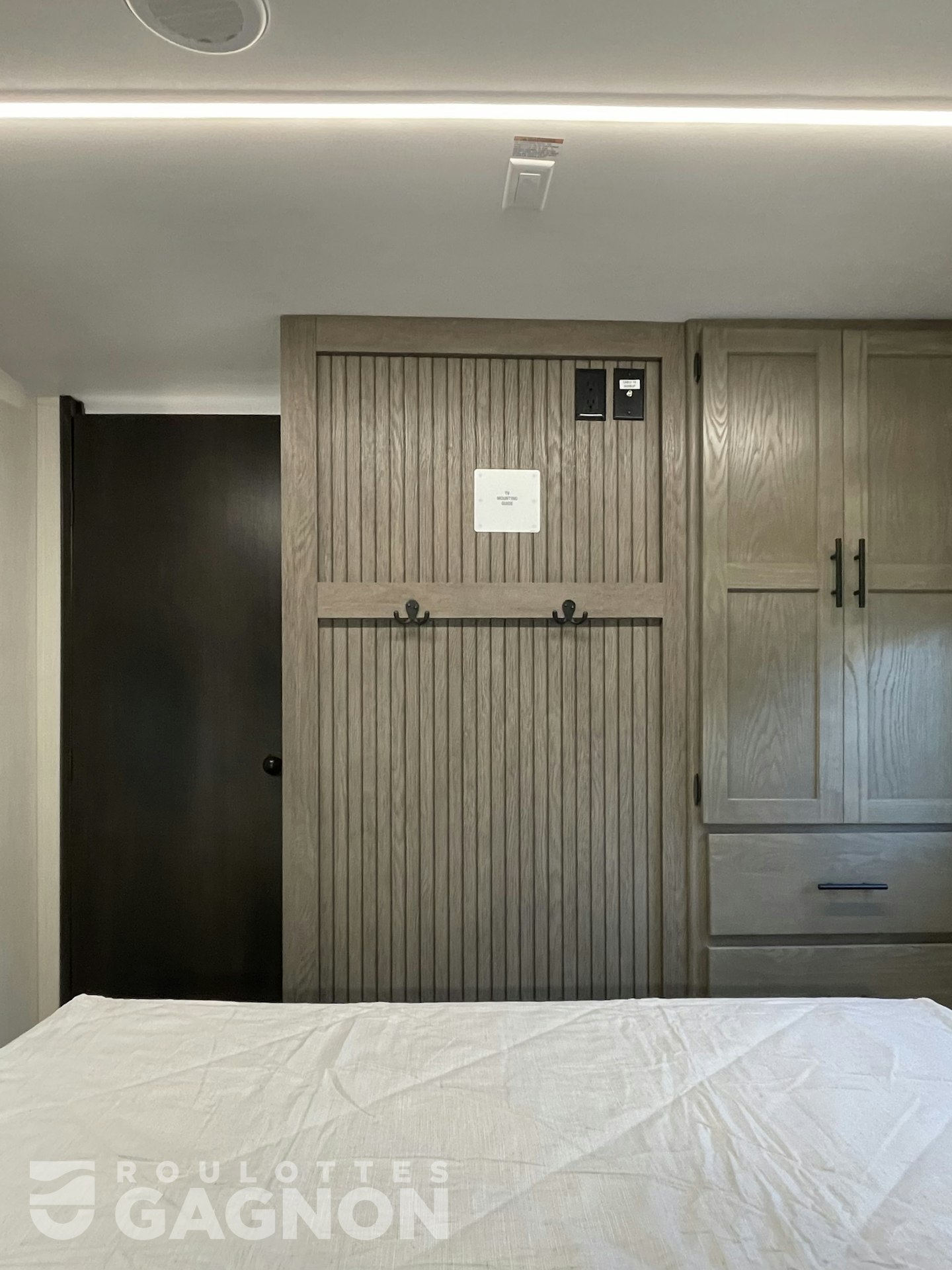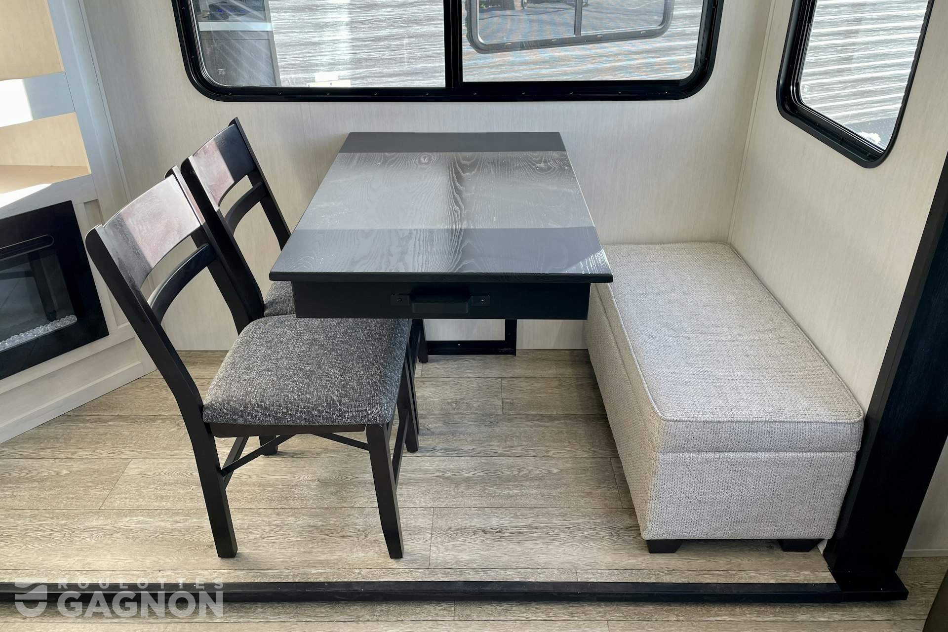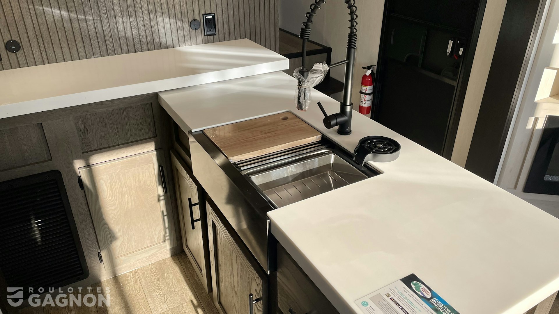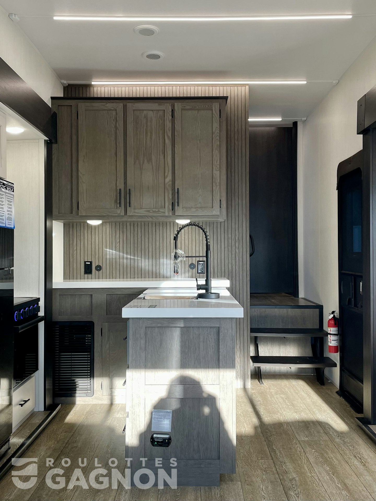 Roulotte Arctic Wolf 27 SGS 2025 neuve à vendre. Cette fifth wheel fabriquée par Forest River est idéale pour un couple et peut coucher jusqu’à 4 personnes. La Arctic Wolf 27 SGS mesure 29,1 pieds et pèse 8 075 lb, son revêtement est en fibre de verre sur Azdel et les options suivantes sont incluses : jack de pole électrique, vérins stabilisateurs auto-nivelants, préparation pour caméra de recul, auvent électrique, marche pied en un bloc (solid step), prise câble ou satellite, prise USB, éclairage au DEL, climatiseur, puits de lumière, douche extérieure, mags, chauffe-eau instantané, éclairage à intensité variable, panneau solaire, foyer électrique, prises usb c, balayeuse centrale, préparation pour caméra au dessus de la porte, hitch arrière et verre énergétique réfléchissant.