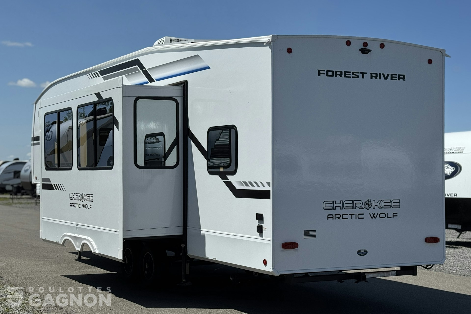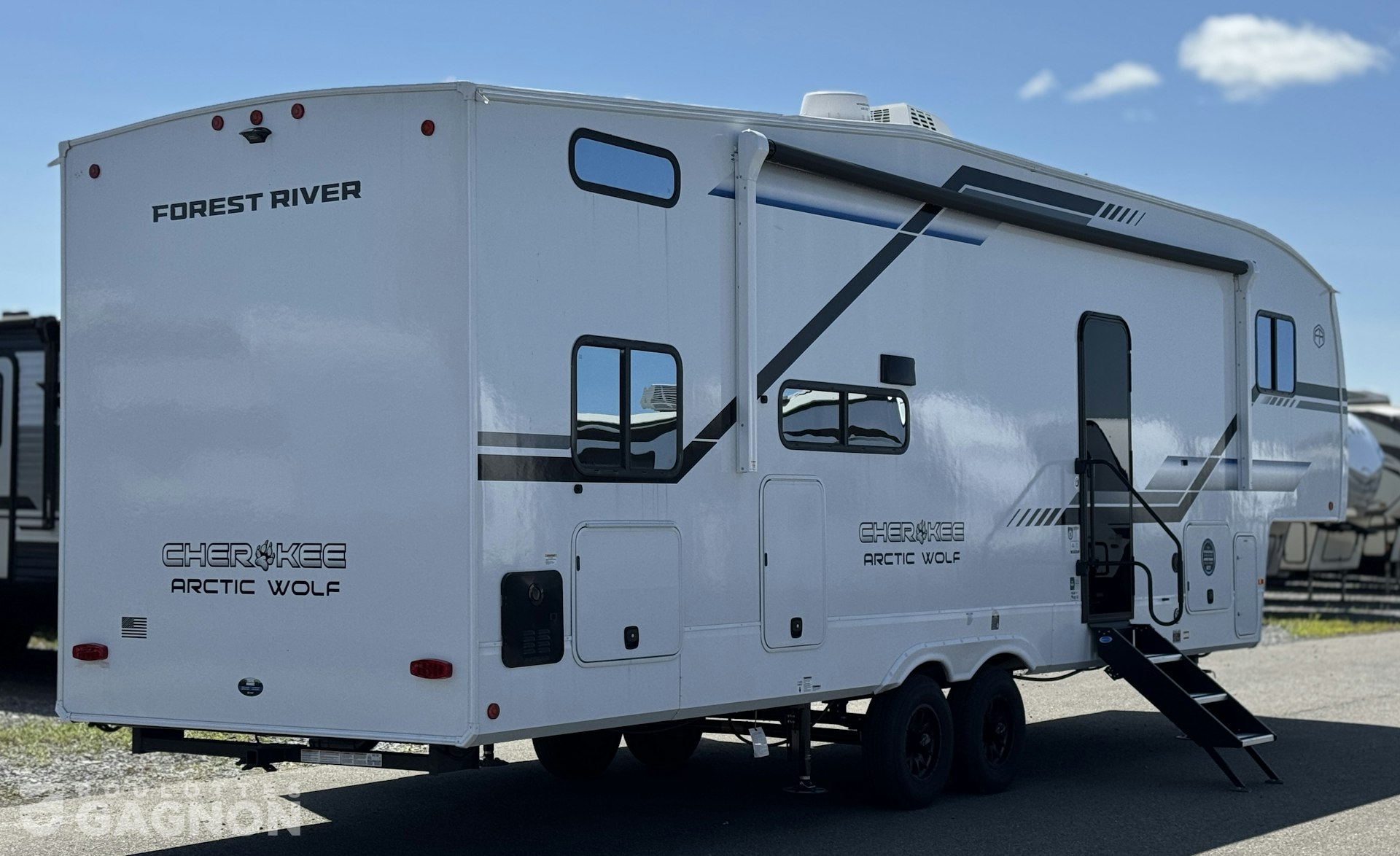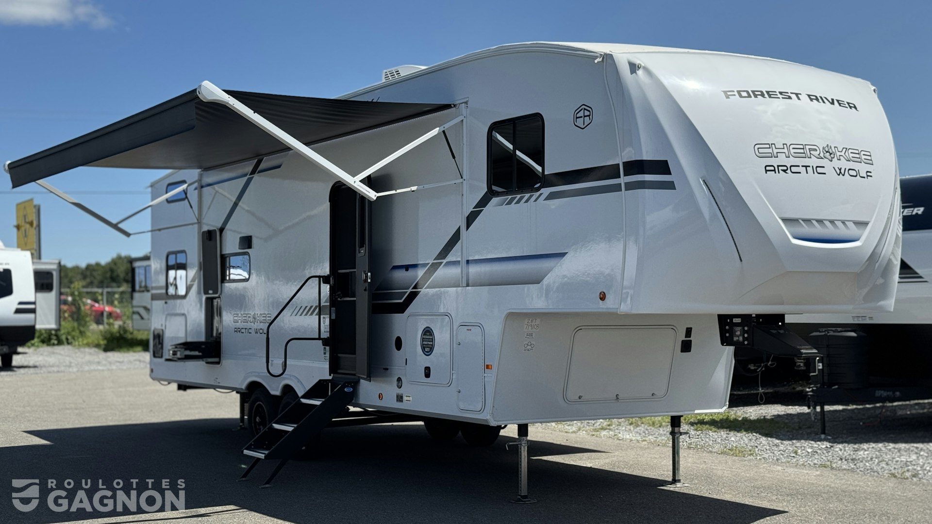 Roulotte Arctic Wolf 287 BH 2026 neuve à vendre. Cette fifth wheel fabriquée par Forest River est idéale pour une famille et peut coucher jusqu’à 10 personnes. La Arctic Wolf 287 BH mesure 35,2 pieds et pèse 8 330 lb, son revêtement est en gel coat et les options suivantes sont incluses : jack de pole électrique, vérins stabilisateurs auto-nivelants, préparation pour caméra de recul, auvent électrique, marche pied en un bloc (solid step), prise câble ou satellite, prise USB, téléviseur, éclairage au DEL, cuisinette extérieure, climatiseur, puits de lumière, douche extérieure, mags, hitch arrière, panneau solaire, fenêtres à verre énergétique réfléchissant, chauffe-eau instantané, prises usb c, balayeuse centrale, foyer électrique et éclairage à intensité variable.
