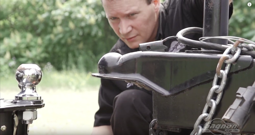 3-À l’aide du vérin, descendez la main sur la boule jusqu’à ce que vous soyez capable d’enclencher la barrure d’attache sans forcer. Enclencher la main du VR sur la boule