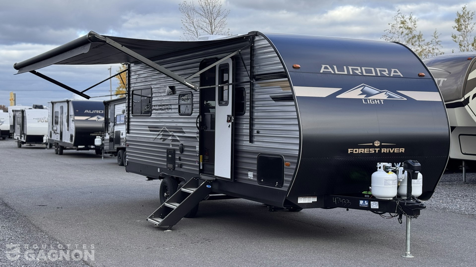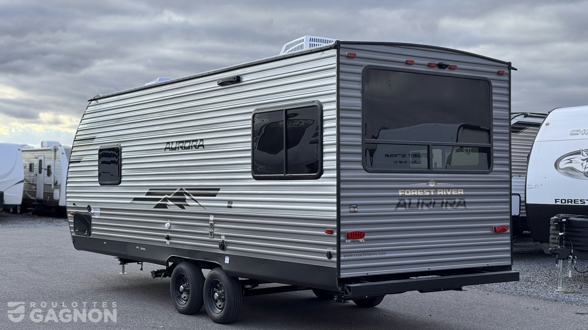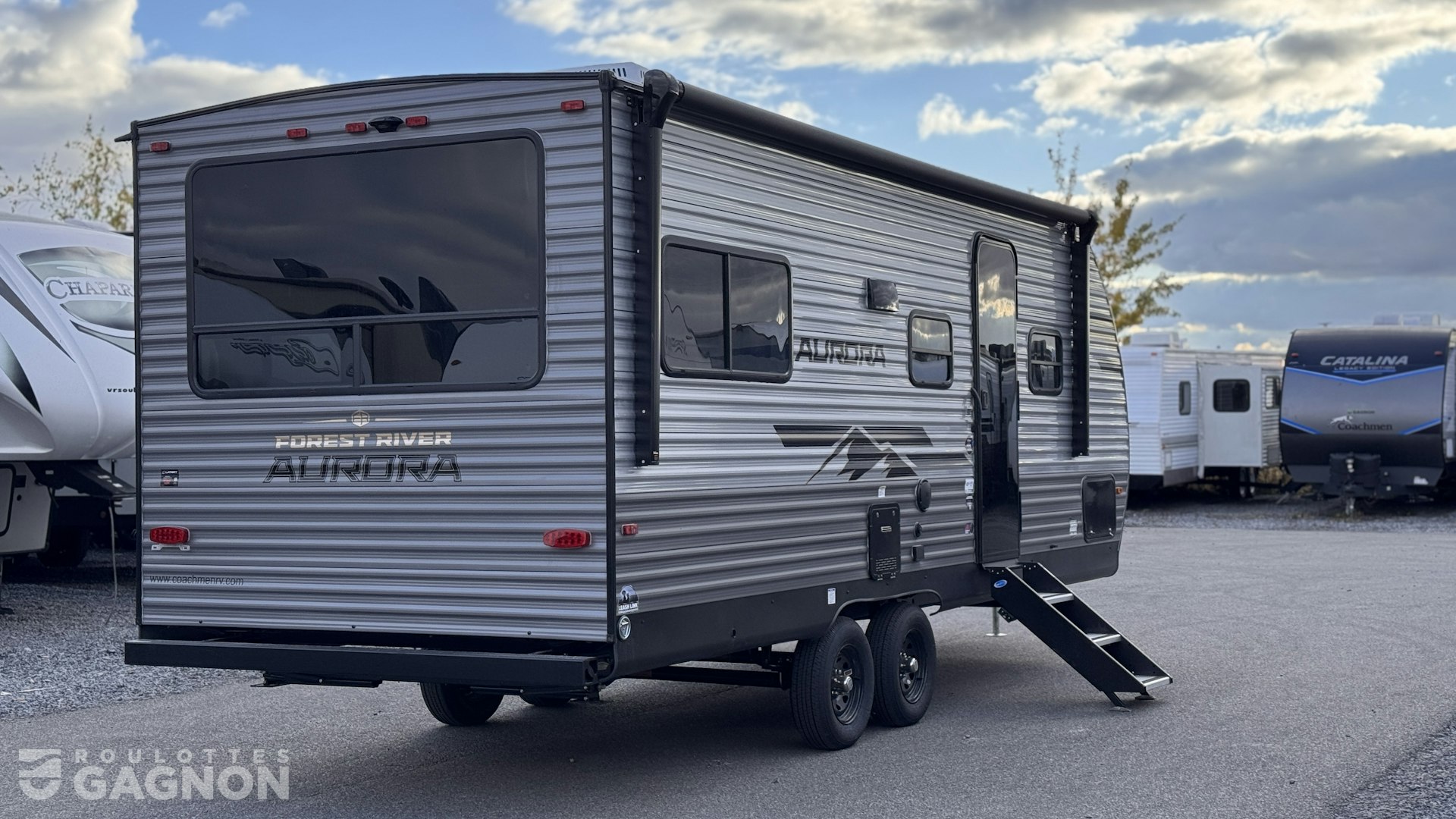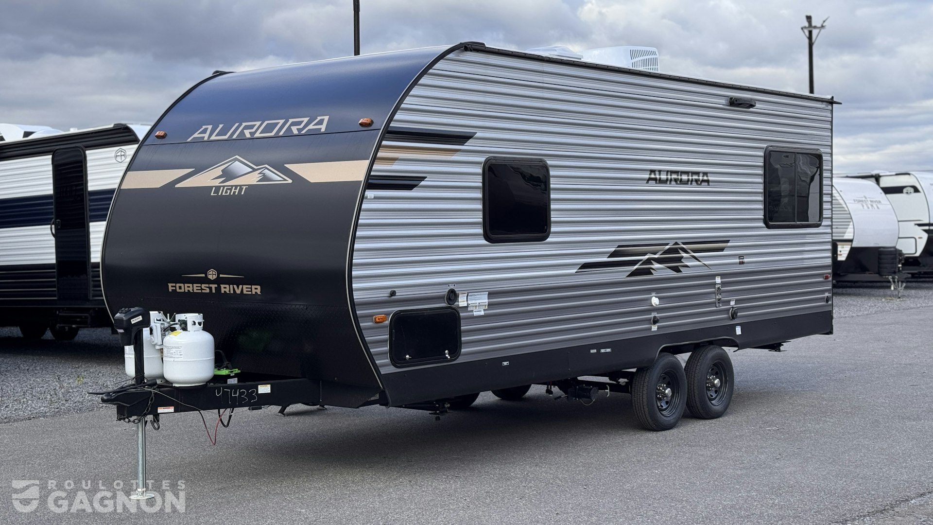 Roulotte Aurora 22 EPIC 2026 neuve à vendre. Cette roulotte de voyage fabriquée par Forest River est idéale pour un couple et peut coucher jusqu’à 5 personnes. La Aurora 22 EPIC mesure 25,9 pieds et pèse 4 670 lb, son revêtement est en aluminium et les options suivantes sont incluses : jack de pole électrique, vérins stabilisateurs manuels, préparation pour caméra de recul, auvent électrique, prise câble ou satellite, bluetooth, prise USB, radio, hauts parleurs extérieurs, éclairage au DEL, climatiseur, puits de lumière, chauffe-eau instantané, prises usb c et panneau solaire.