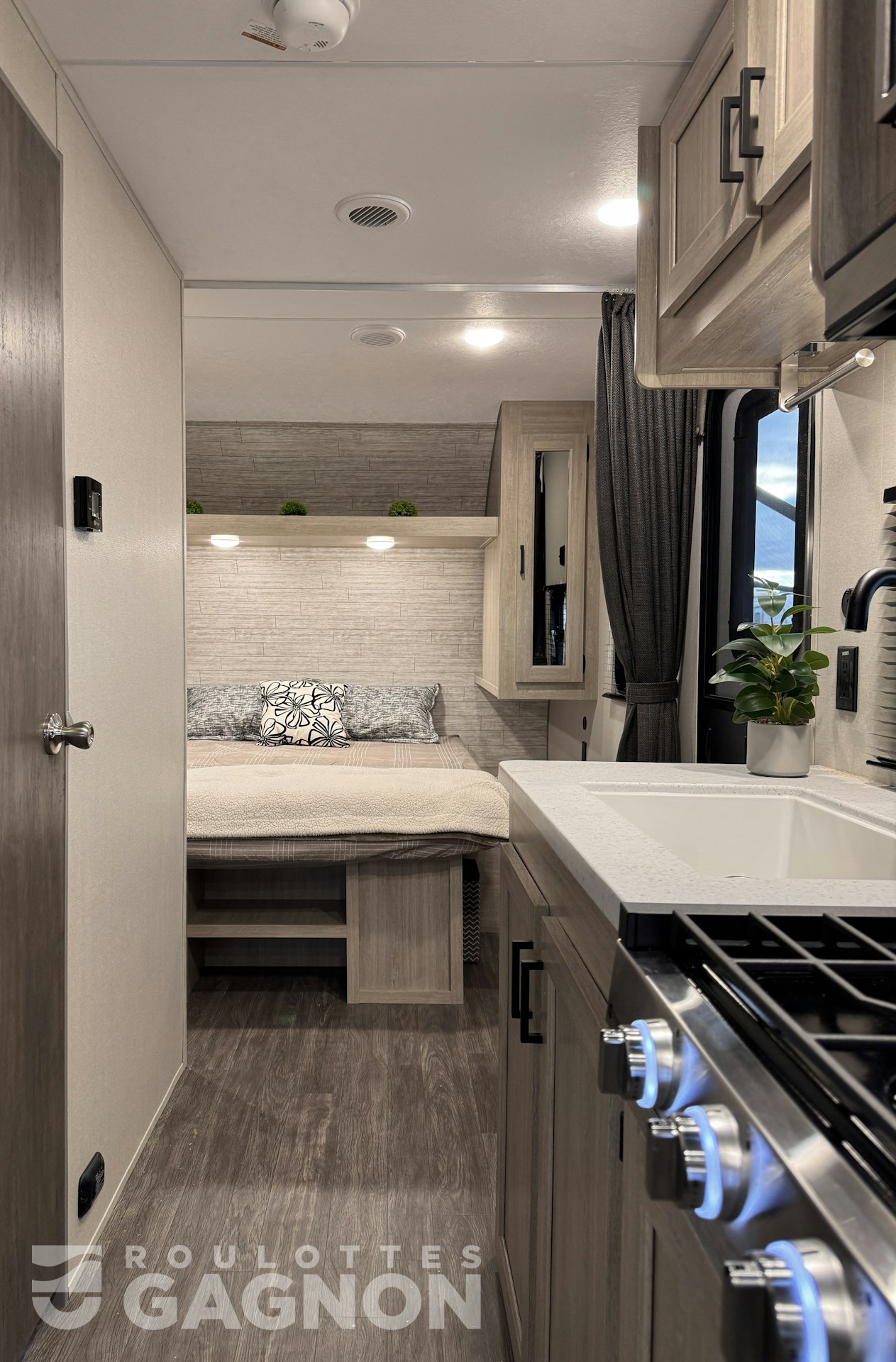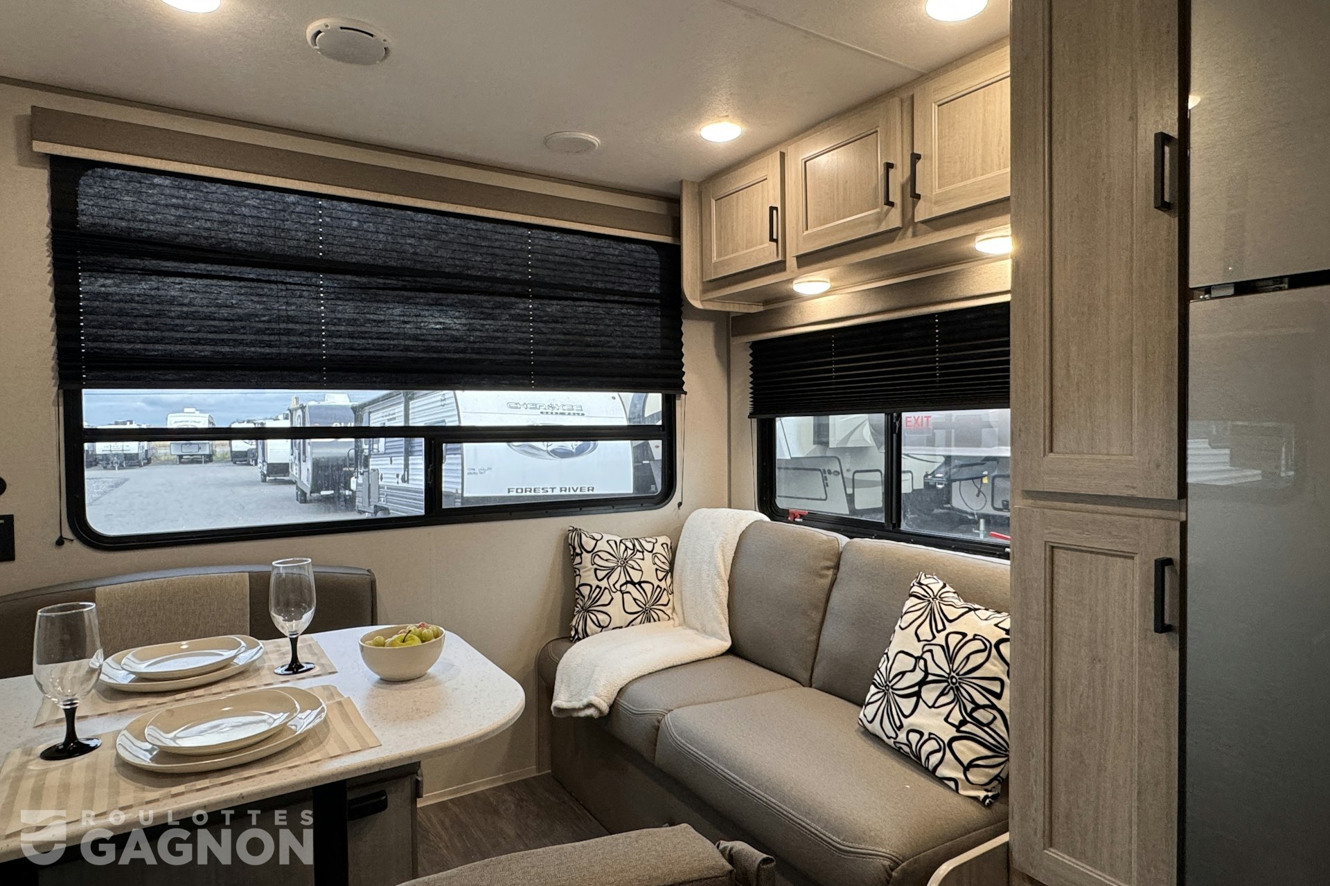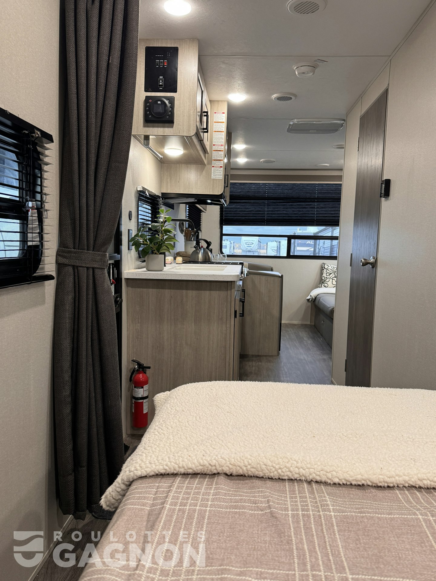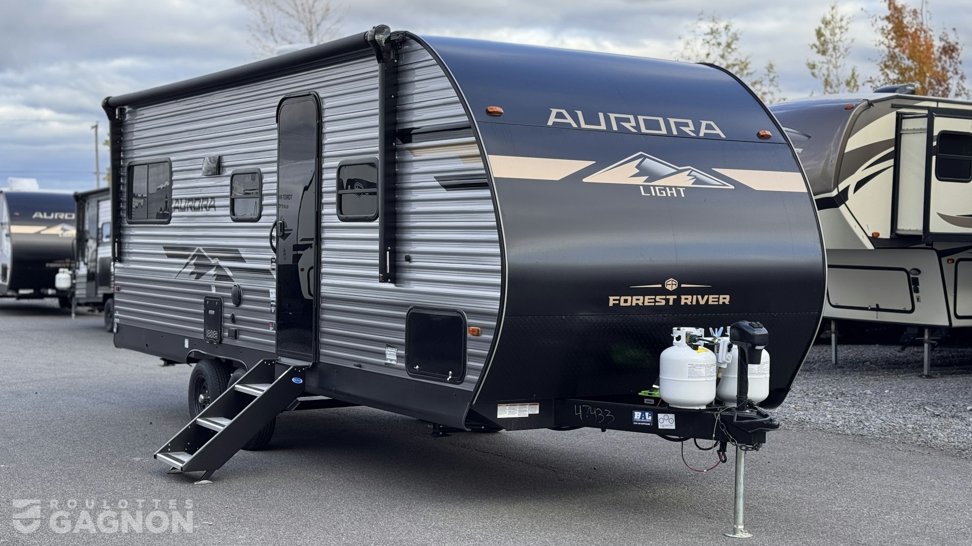 Roulotte Aurora 22 EPIC 2026 neuve à vendre. Cette roulotte de voyage fabriquée par Forest River est idéale pour un couple et peut coucher jusqu’à 5 personnes. La Aurora 22 EPIC mesure 25,9 pieds et pèse 4 670 lb, son revêtement est en aluminium et les options suivantes sont incluses : jack de pole électrique, vérins stabilisateurs manuels, préparation pour caméra de recul, auvent électrique, prise câble ou satellite, bluetooth, prise USB, radio, hauts parleurs extérieurs, éclairage au DEL, climatiseur, puits de lumière, chauffe-eau instantané, prises usb c et panneau solaire.