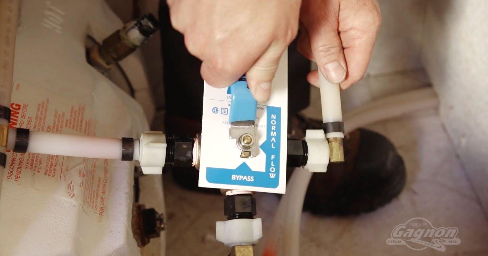 Comme votre chauffe eau est en position estivale, mettez votre chauffe eau en position bypass. Dans ce cas-ci. Il s’agit simplement de tourner la valve sur la position by-pass.