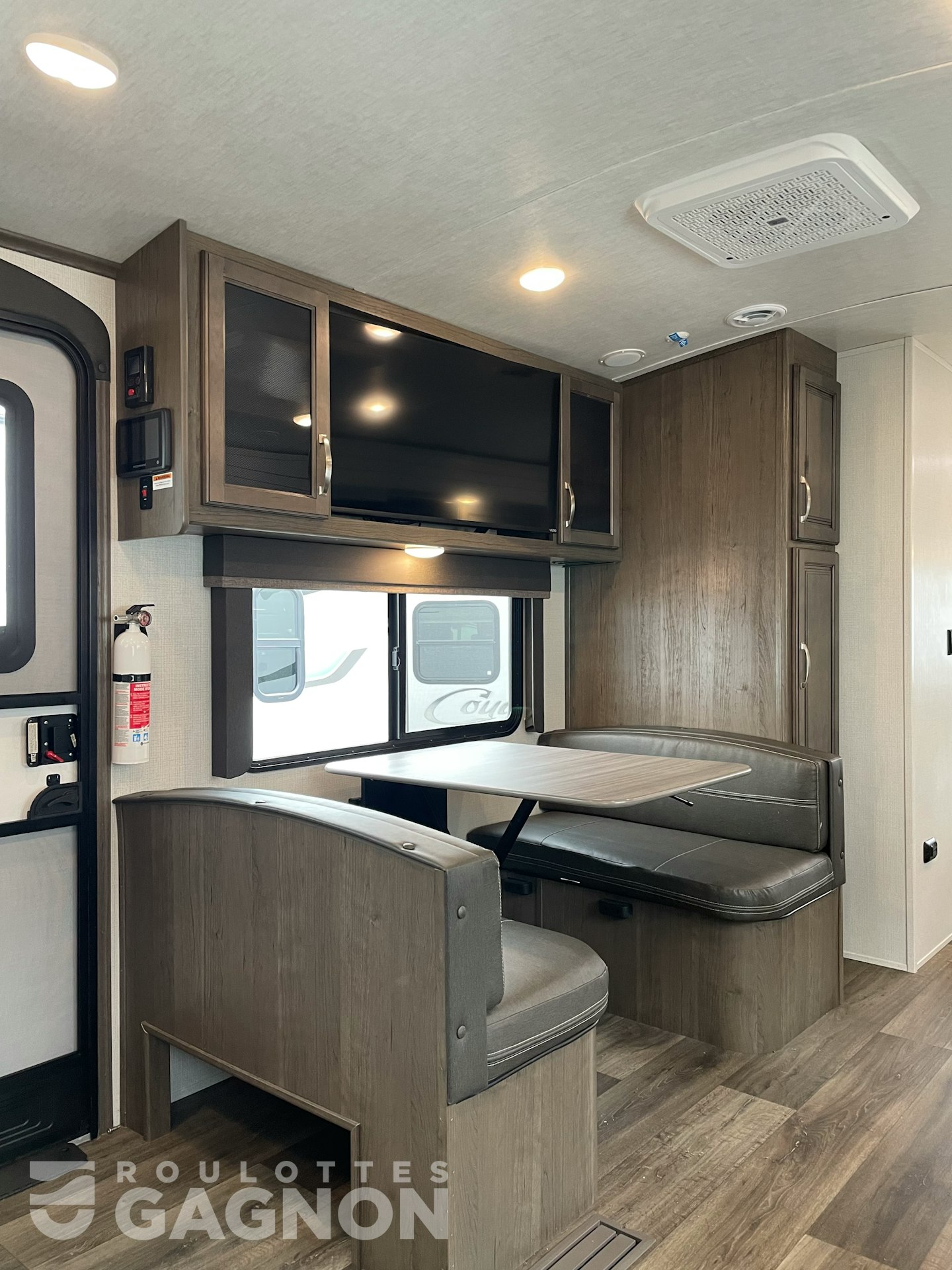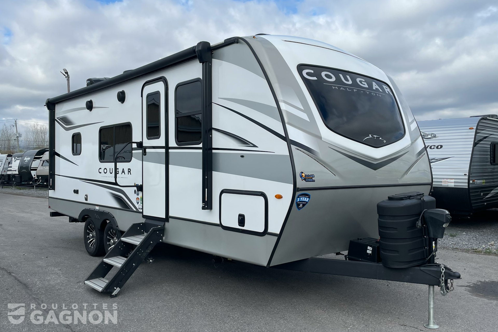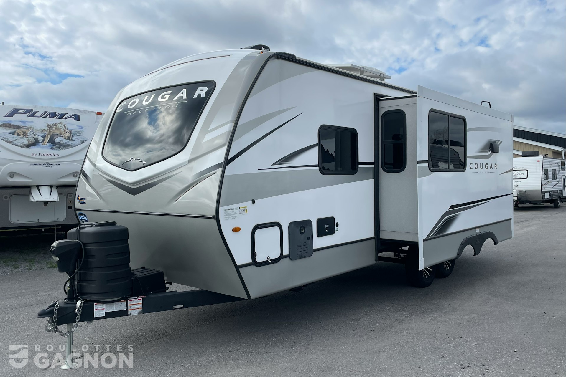 Roulotte Cougar 22 MLS 2023 usagée à vendre. Cette roulotte de voyage fabriquée par Keystone est idéale pour un couple et peut coucher jusqu’à 4 personnes. La Cougar 22 MLS mesure 26.9 pieds et pèse 5827 lb, et les options suivantes sont incluses : jack de pole électrique, vérins stabilisateurs électriques, préparation pour caméra de recul, échelle, auvent électrique, marche pied en un bloc (solid step), prise câble ou satellite, prise pour panneau solaire, bluetooth, prise USB, téléviseur, radio, hauts parleurs extérieurs, éclairage au DEL, climatiseur, puits de lumière, douche extérieure, mags, prises usb c, panneau solaire et chauffe-eau instantané.
