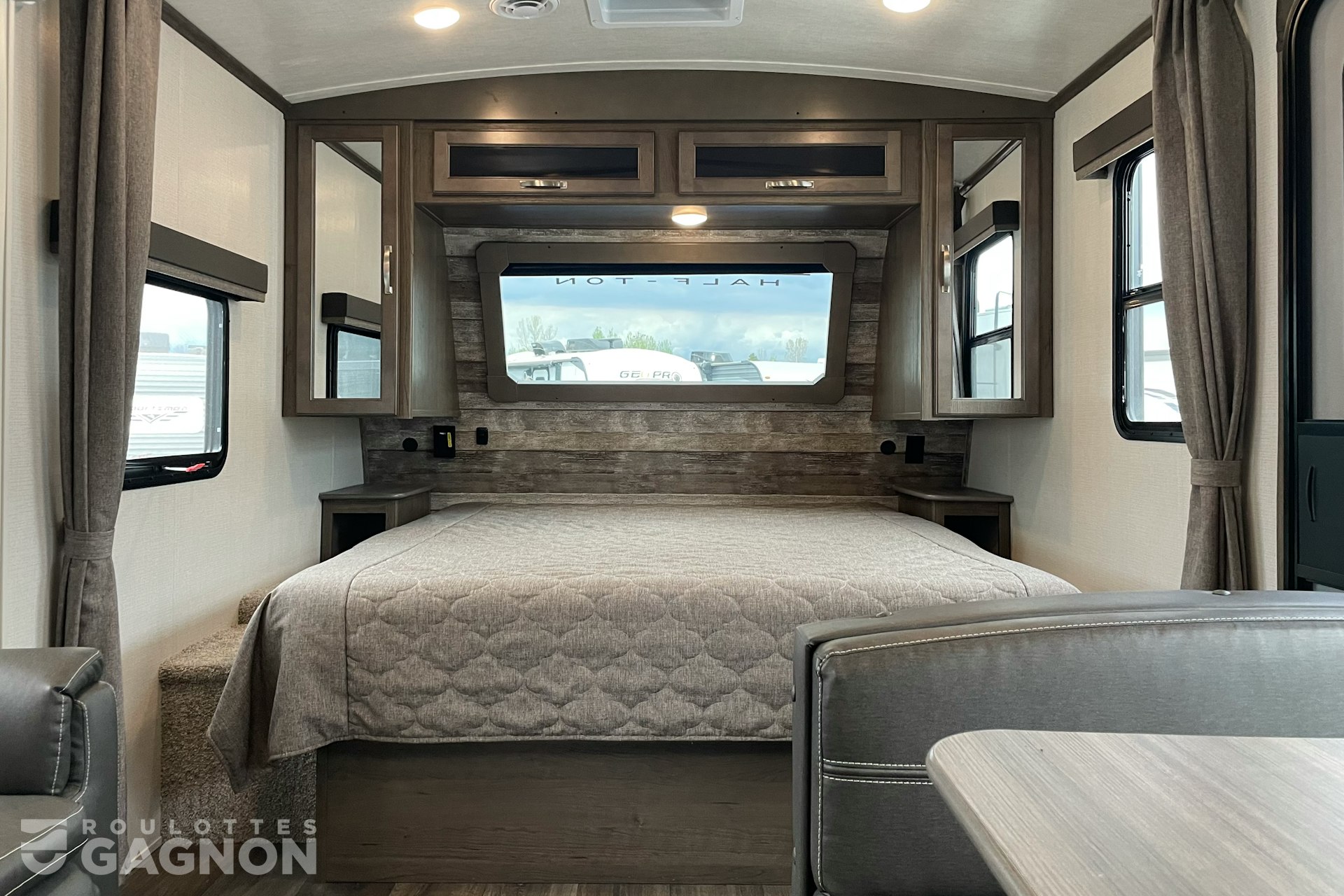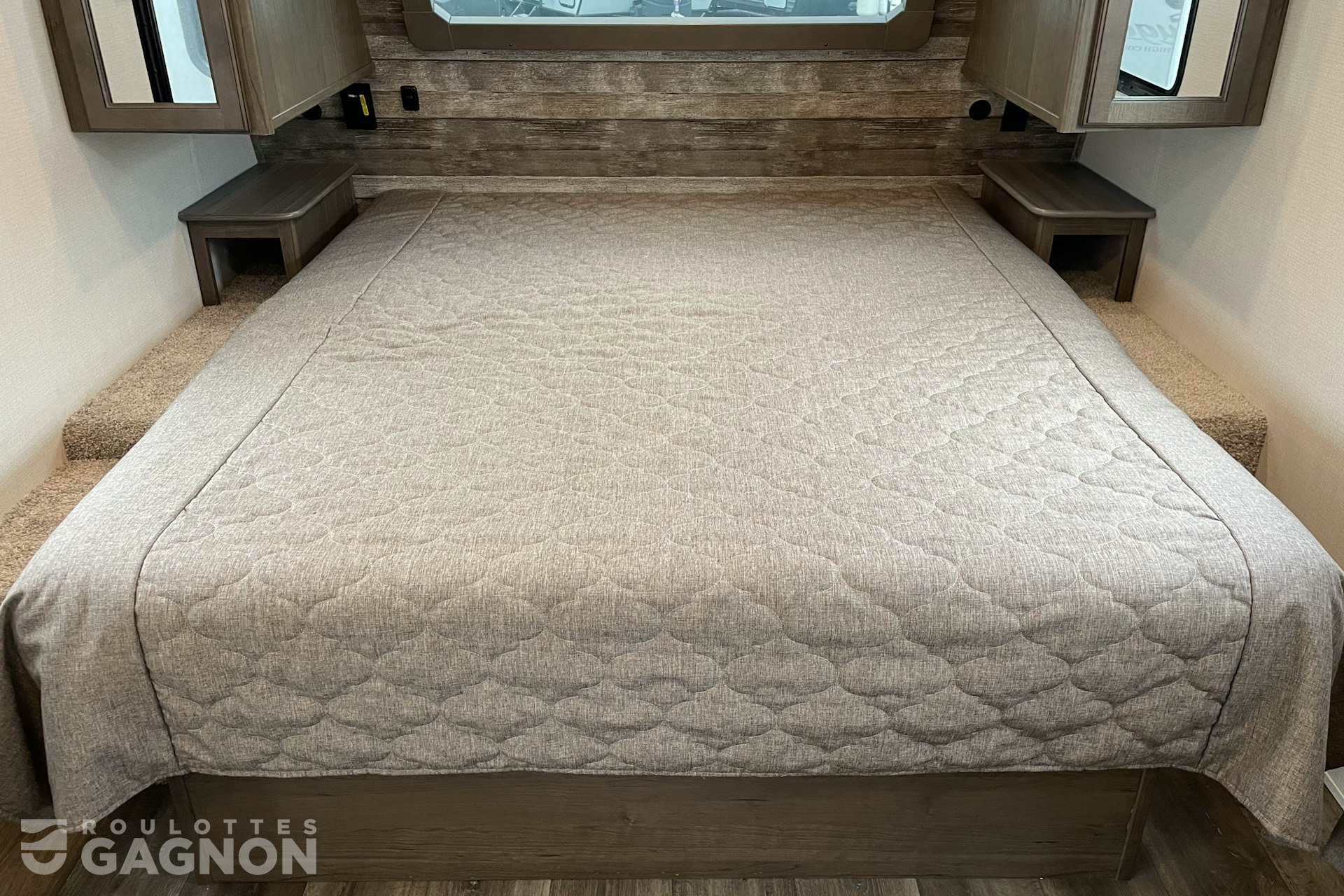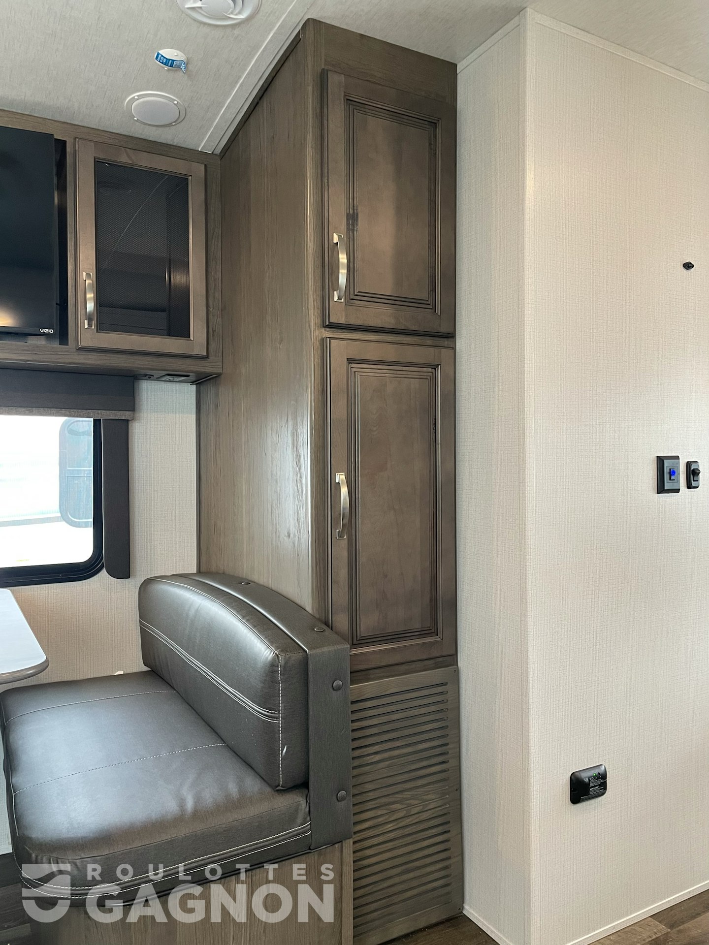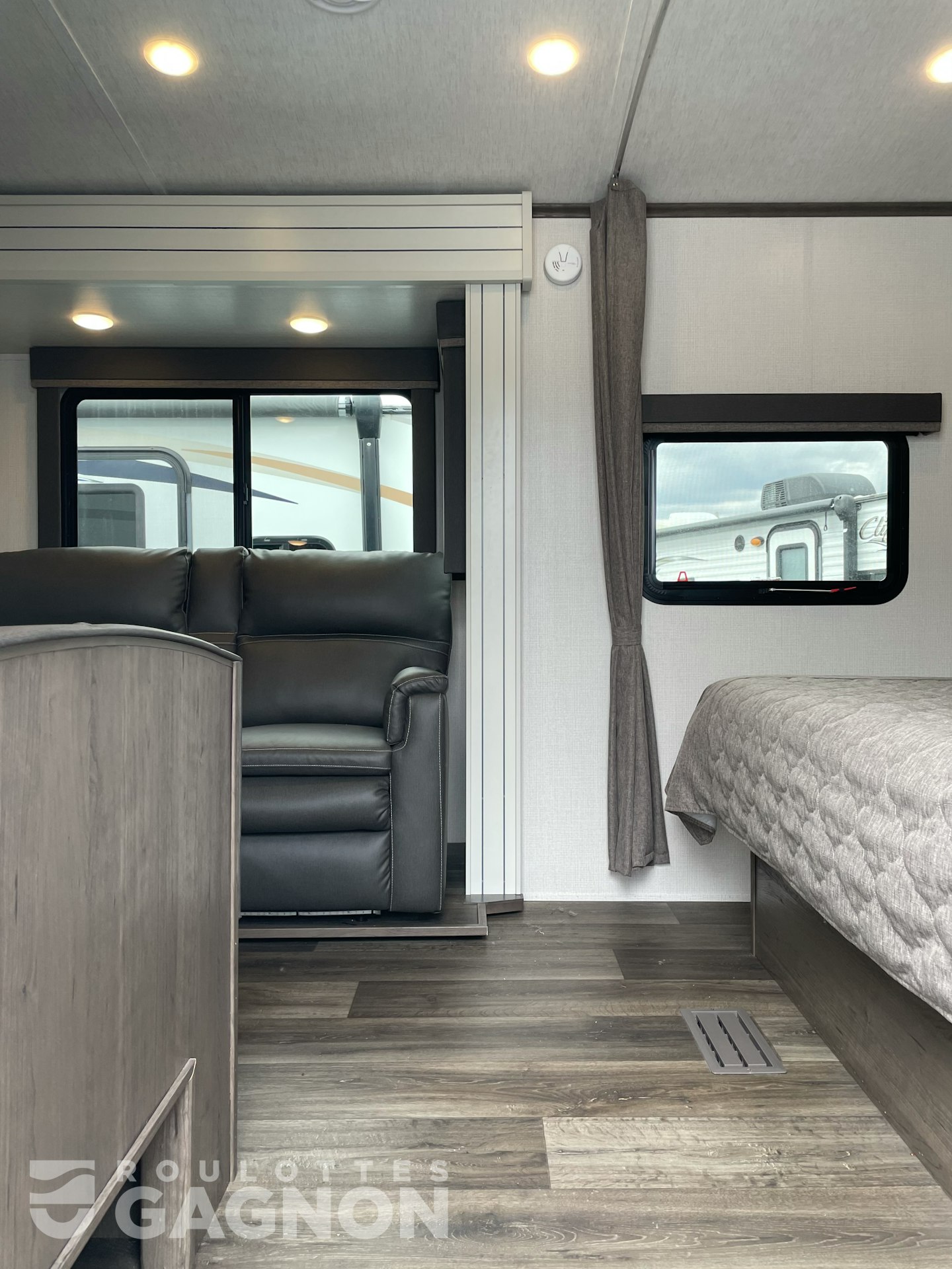 Roulotte Cougar 22 MLS 2023 usagée à vendre. Cette roulotte de voyage fabriquée par Keystone est idéale pour un couple et peut coucher jusqu’à 4 personnes. La Cougar 22 MLS mesure 26.9 pieds et pèse 5827 lb, et les options suivantes sont incluses : jack de pole électrique, vérins stabilisateurs électriques, préparation pour caméra de recul, échelle, auvent électrique, marche pied en un bloc (solid step), prise câble ou satellite, prise pour panneau solaire, bluetooth, prise USB, téléviseur, radio, hauts parleurs extérieurs, éclairage au DEL, climatiseur, puits de lumière, douche extérieure, mags, prises usb c, panneau solaire et chauffe-eau instantané.