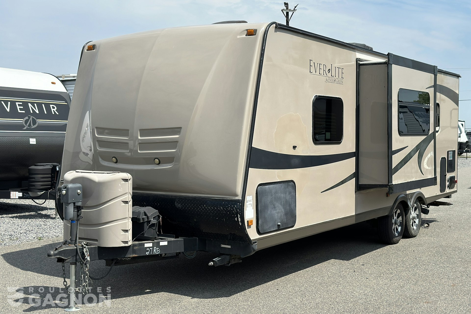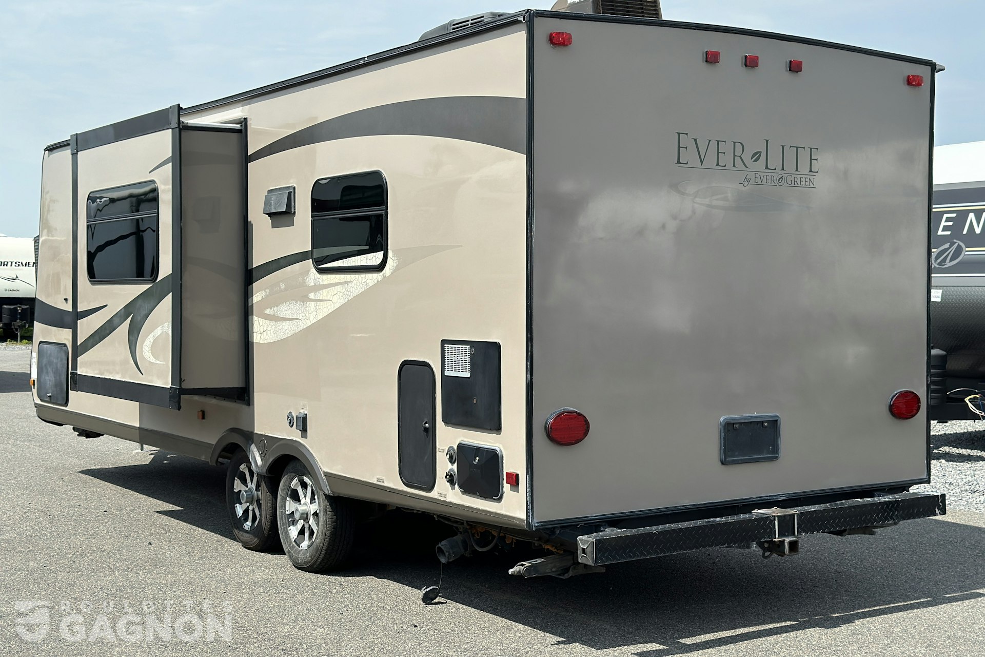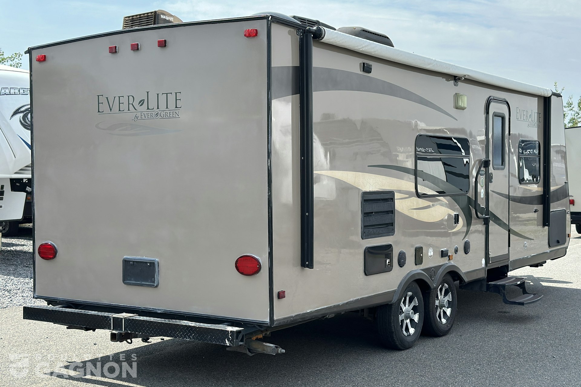 Roulotte Ever-Lite 27 RB 2012 usagée à vendre. Cette roulotte de voyage fabriquée par EverGreen RV est idéale pour un couple et peut coucher jusqu’à 5 personnes. La Ever-Lite 27 RB mesure 27,6 pieds et pèse 4 987 lb, son revêtement est en fibre de verre et les options suivantes sont incluses : jack de pole électrique, vérins stabilisateurs manuels, auvent électrique, prise câble ou satellite, téléviseur, radio, hauts parleurs extérieurs, climatiseur, puits de lumière, douche extérieure et mags.