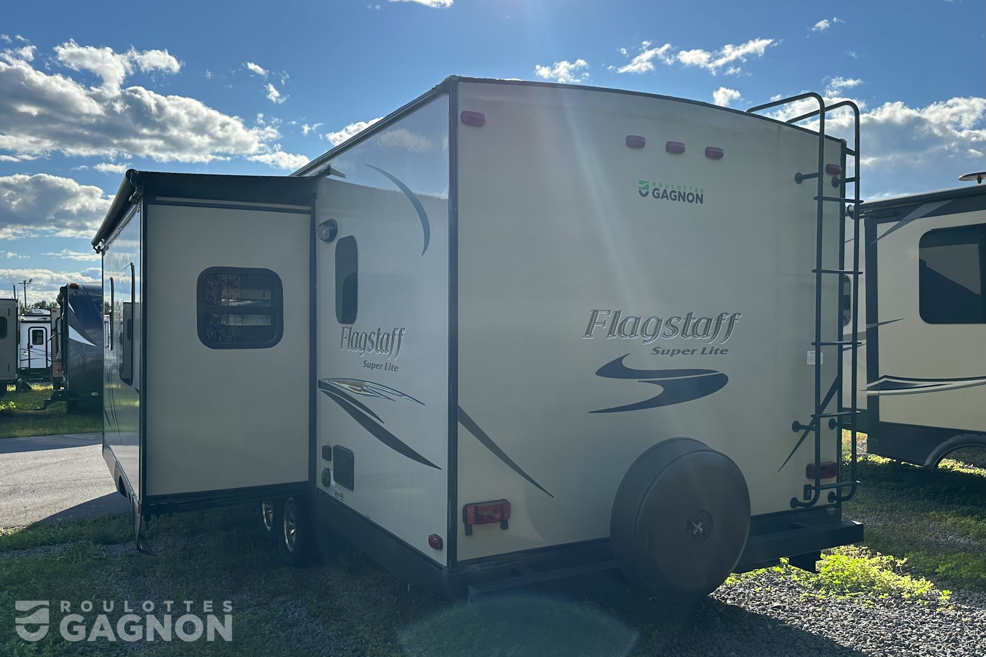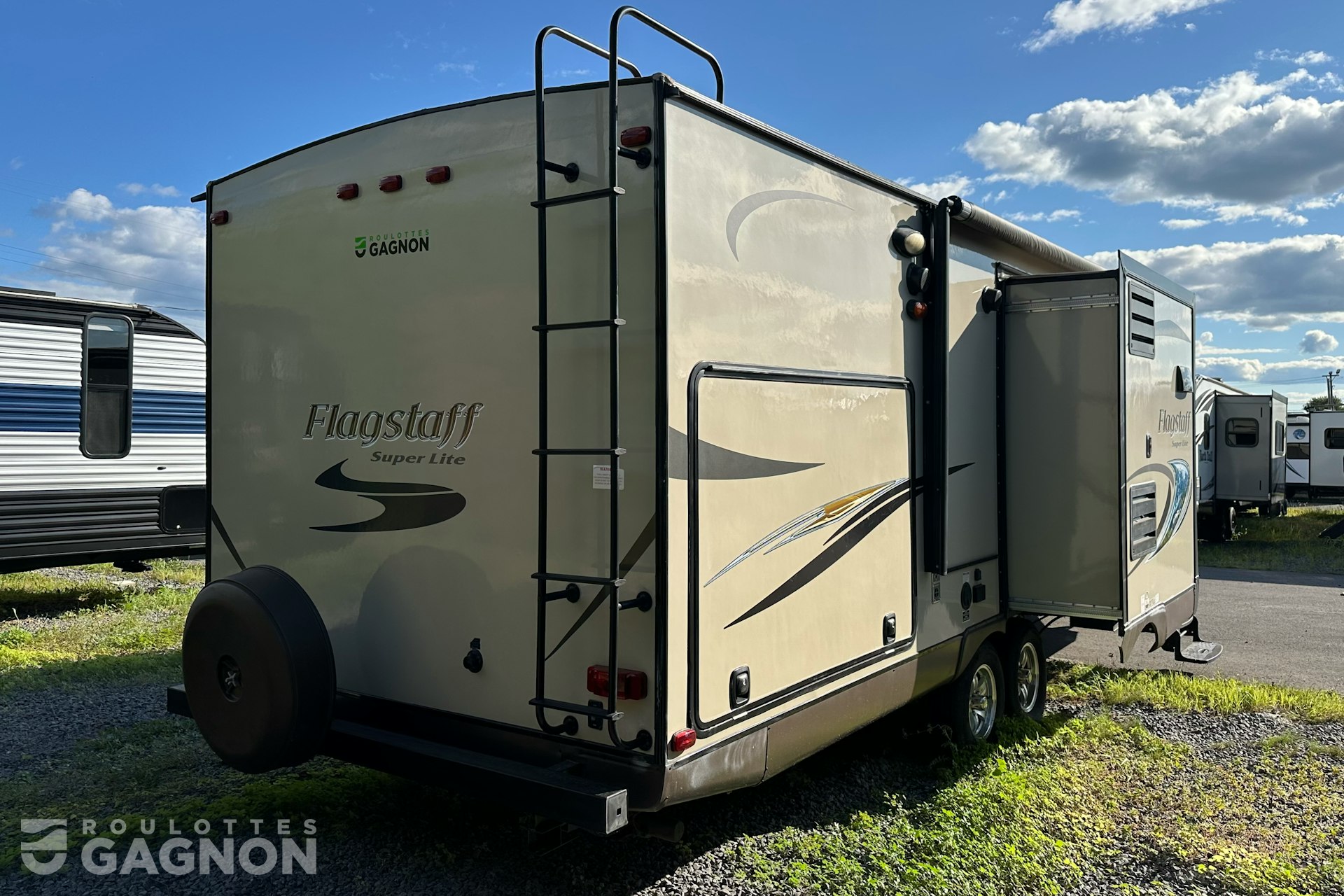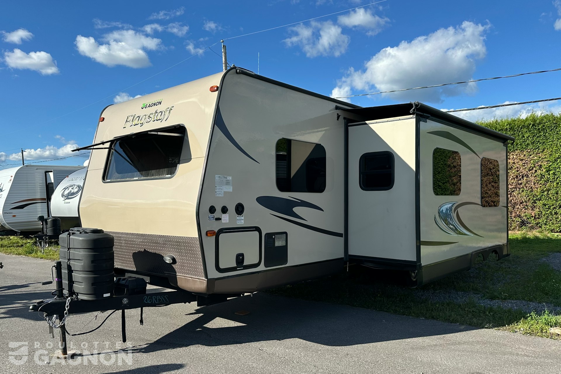 Roulotte Flagstaff 26 RBSS 2015 usagée à vendre. Cette roulotte de voyage fabriquée par Forest River est idéale pour un couple et peut coucher jusqu’à 4 personnes. La Flagstaff 26 RBSS mesure 31 pieds et pèse 5933 lb, son revêtement est en fibre de verre et les options suivantes sont incluses : vérins stabilisateurs électriques, échelle, auvent électrique, prise câble ou satellite, prise USB, téléviseur, radio, éclairage au DEL, cuisinette extérieure, climatiseur, puits de lumière, douche extérieure, mags, slide topper et prise 12v.