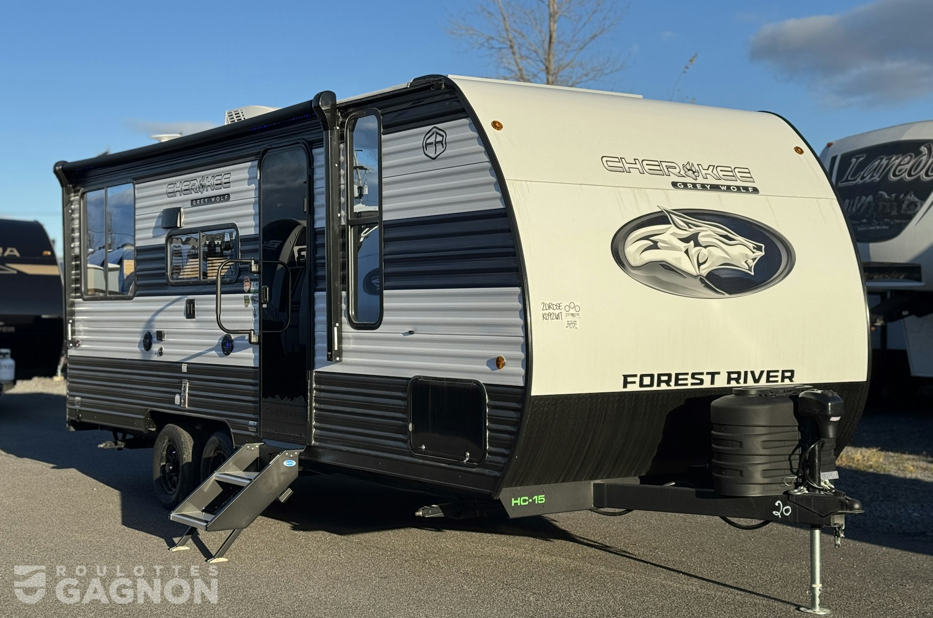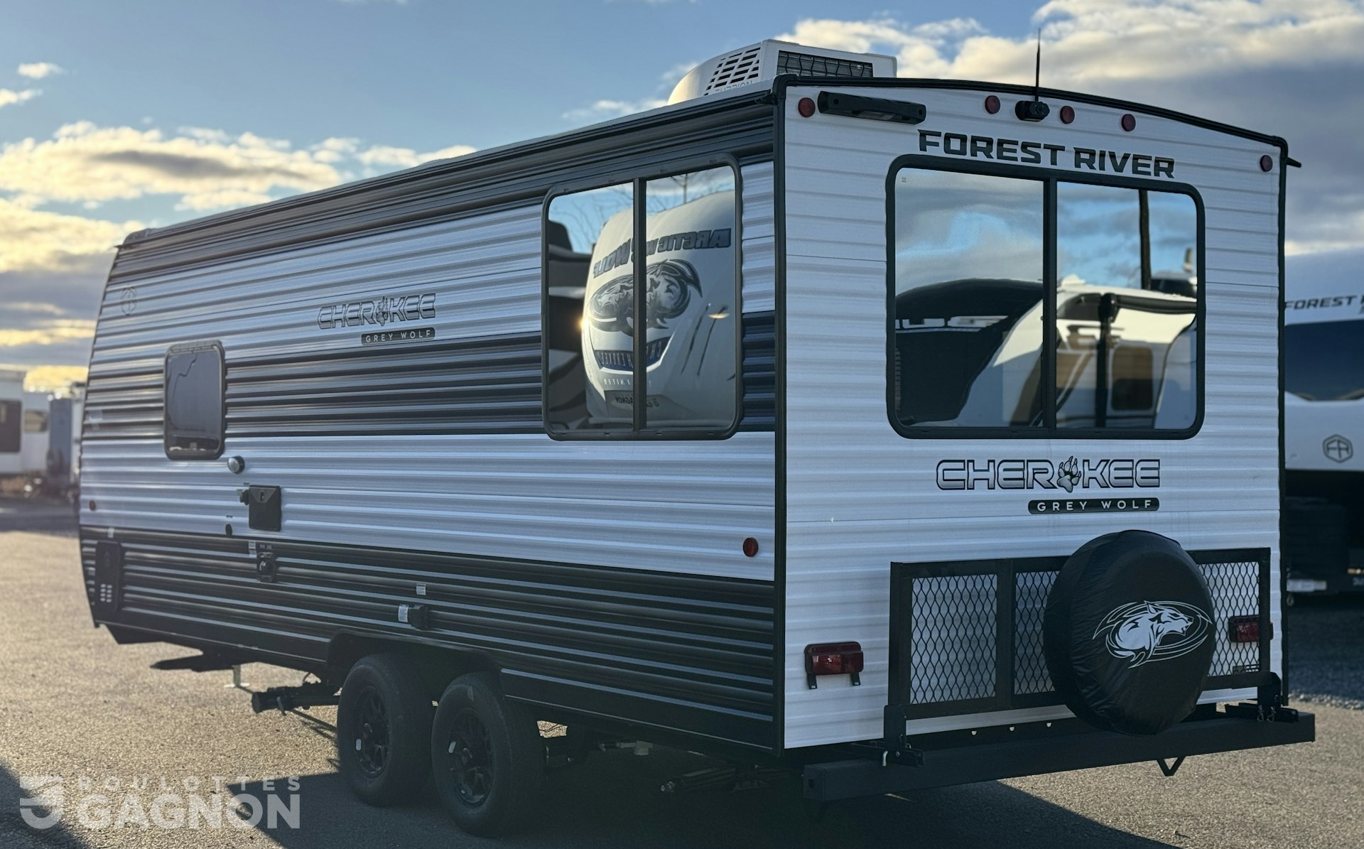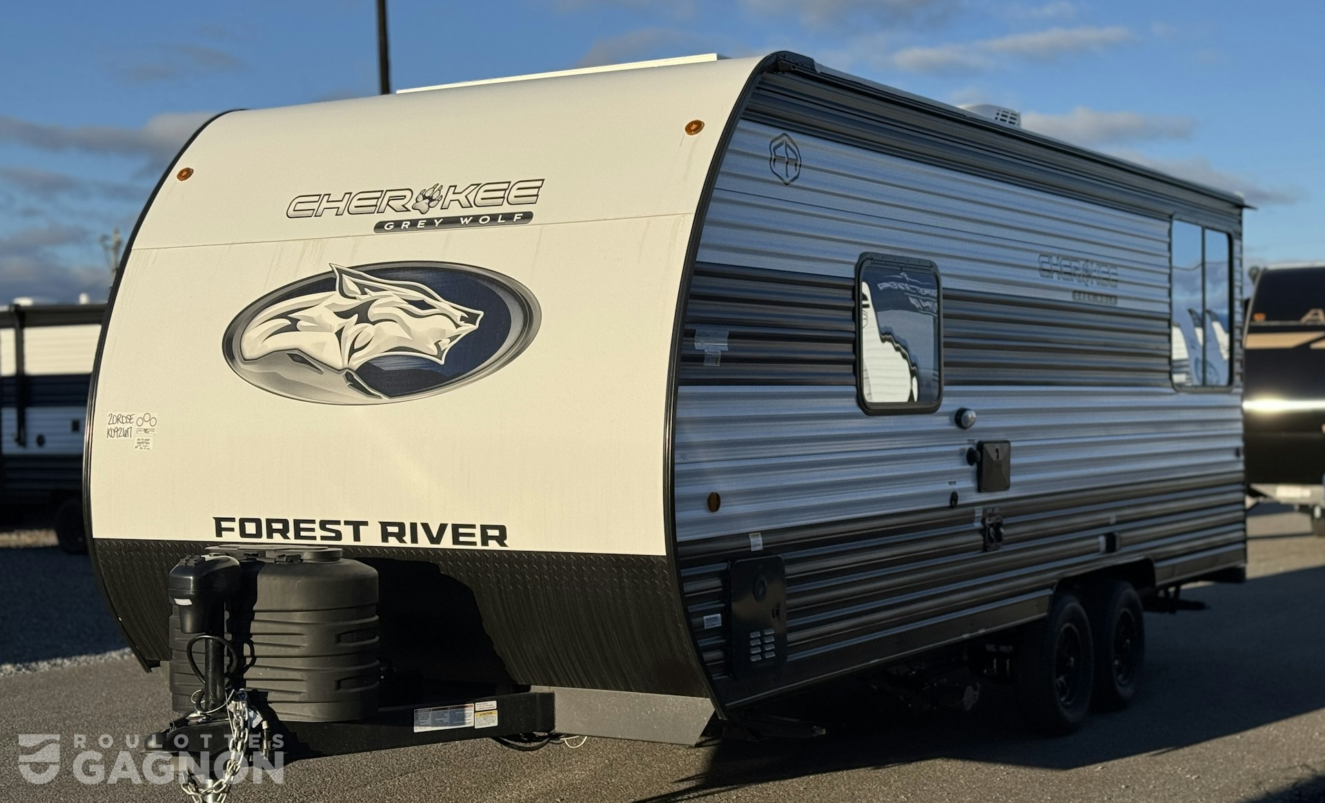 Roulotte Grey Wolf 20 RD SE 2026 neuve à vendre. Cette roulotte de voyage fabriquée par Forest River est idéale pour un couple et peut coucher jusqu’à 4 personnes. La Grey Wolf 20 RD SE mesure 25.4 pieds et pèse 4015 lb, son revêtement est en aluminium et les options suivantes sont incluses : jack de pole électrique, vérins stabilisateurs manuels, préparation pour caméra de recul, caméra de recul incluse, plateforme cargo, auvent électrique, marche pied en un bloc (solid step), prise câble ou satellite, bluetooth, prise USB, radio, hauts parleurs extérieurs, éclairage au DEL, climatiseur, puits de lumière, douche extérieure et mags.