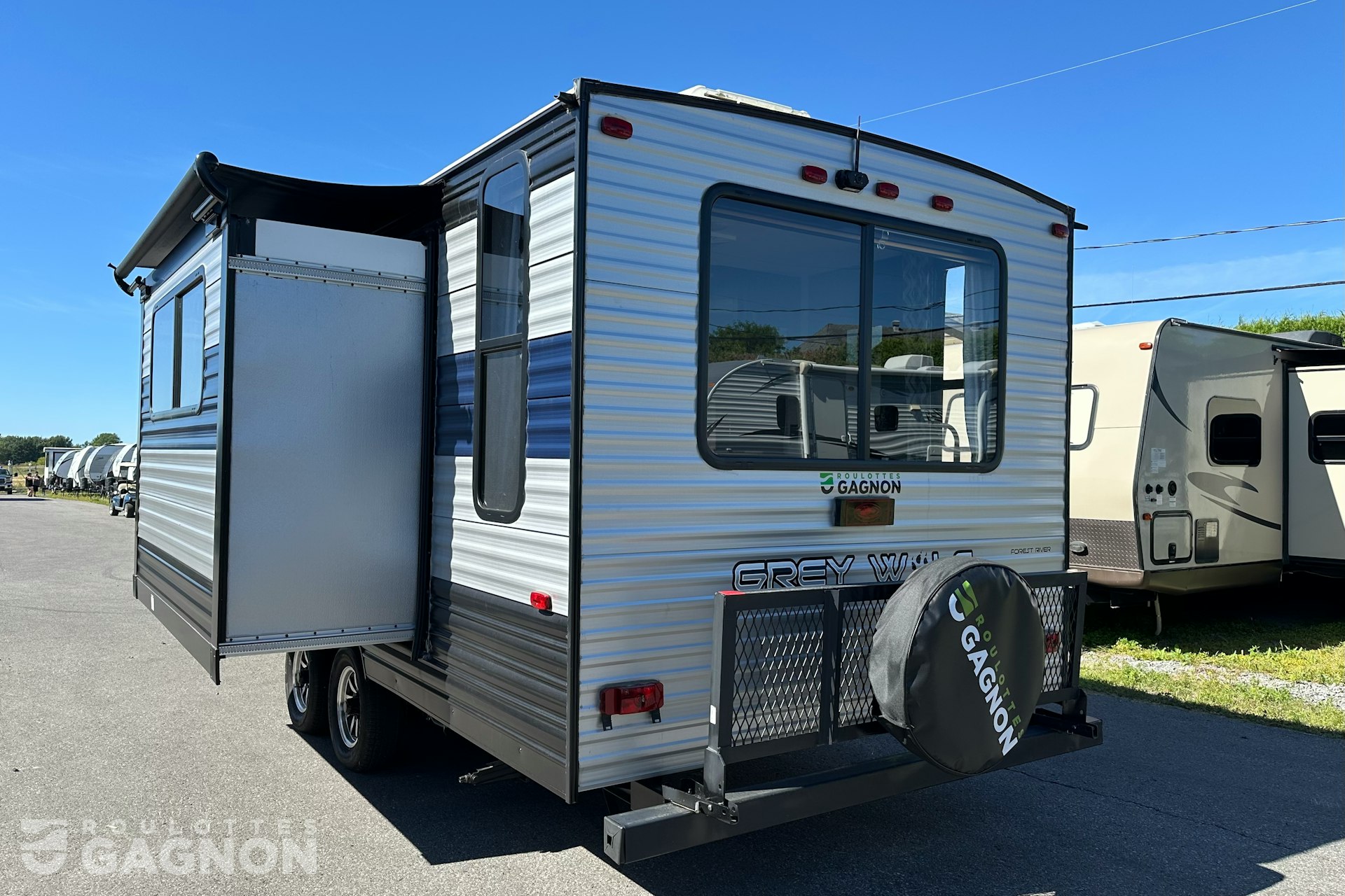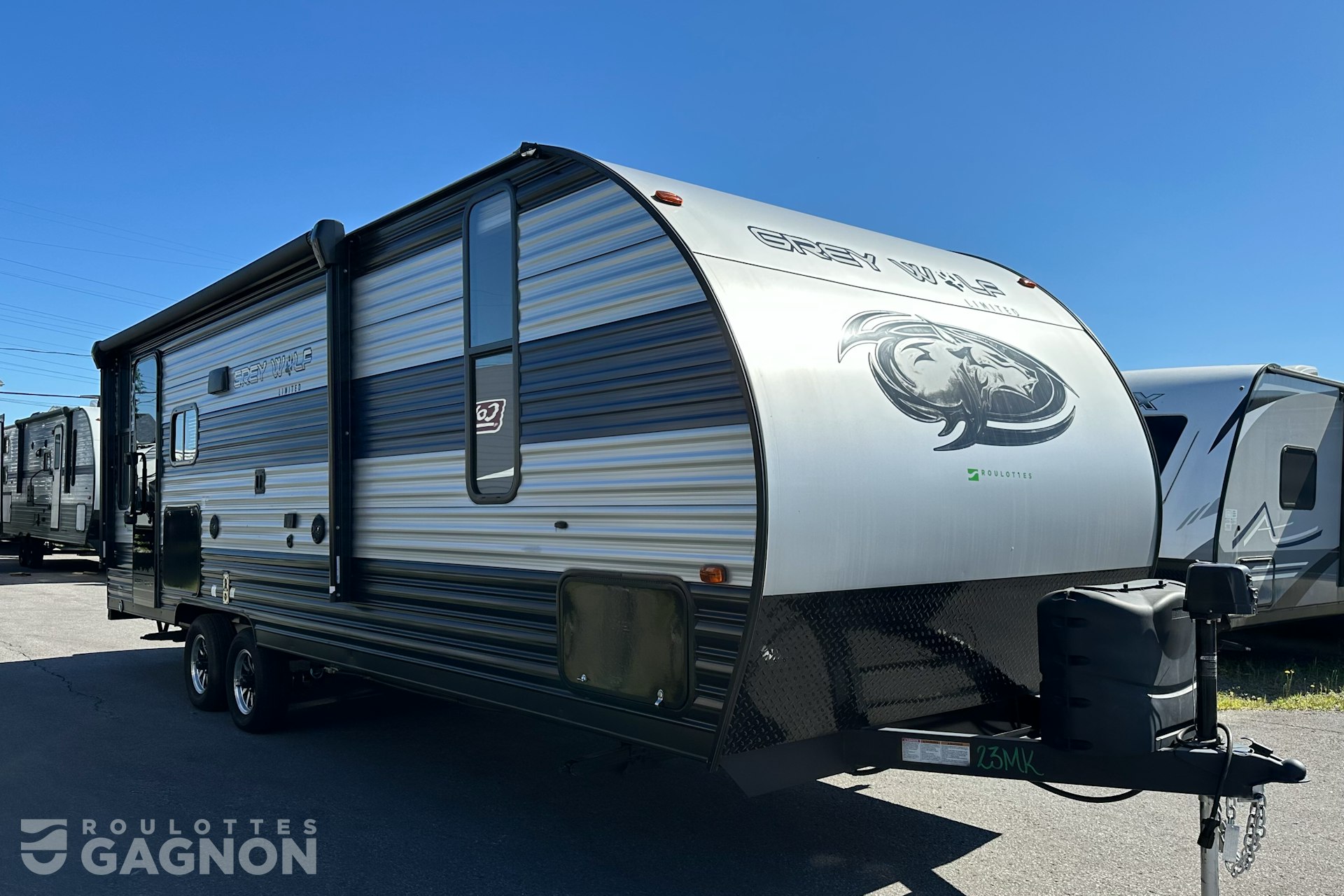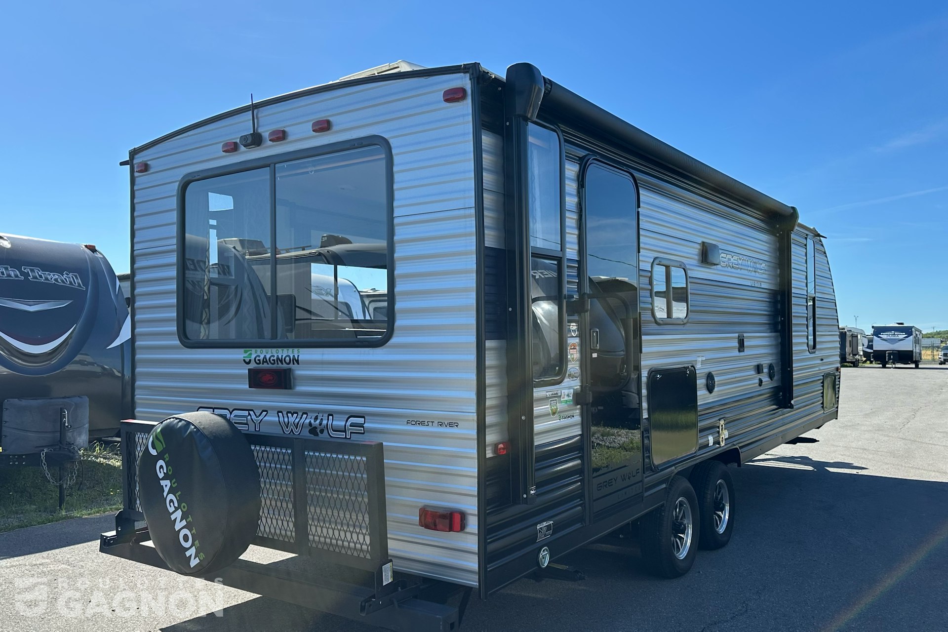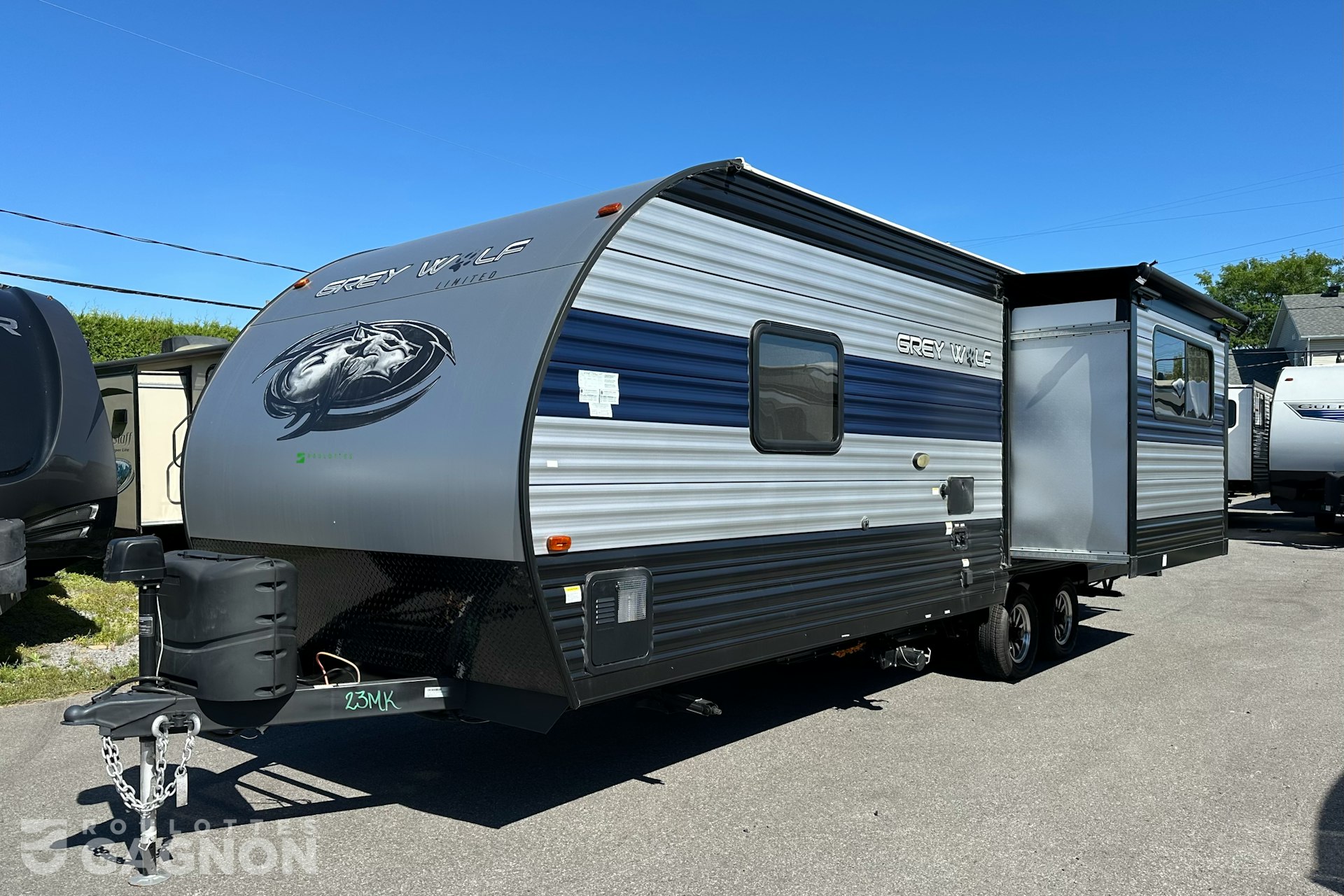 Roulotte Grey Wolf 23 MK 2022 usagée à vendre. Cette roulotte de voyage fabriquée par Forest River est idéale pour un couple et peut coucher jusqu’à 6 personnes. La Grey Wolf 23 MK mesure 28.8 pieds et pèse 5013 lb, son revêtement est en aluminium et les options suivantes sont incluses : jack de pole électrique, vérins stabilisateurs manuels, préparation pour caméra de recul, caméra de recul incluse, plateforme cargo, auvent électrique, marche pied en un bloc (solid step), prise câble ou satellite, bluetooth, prise USB, radio, hauts parleurs extérieurs, éclairage au DEL, climatiseur, puits de lumière, douche extérieure, mags, machine à glaçon et frigo extérieur, panneau solaire, slide topper et foyer électrique.