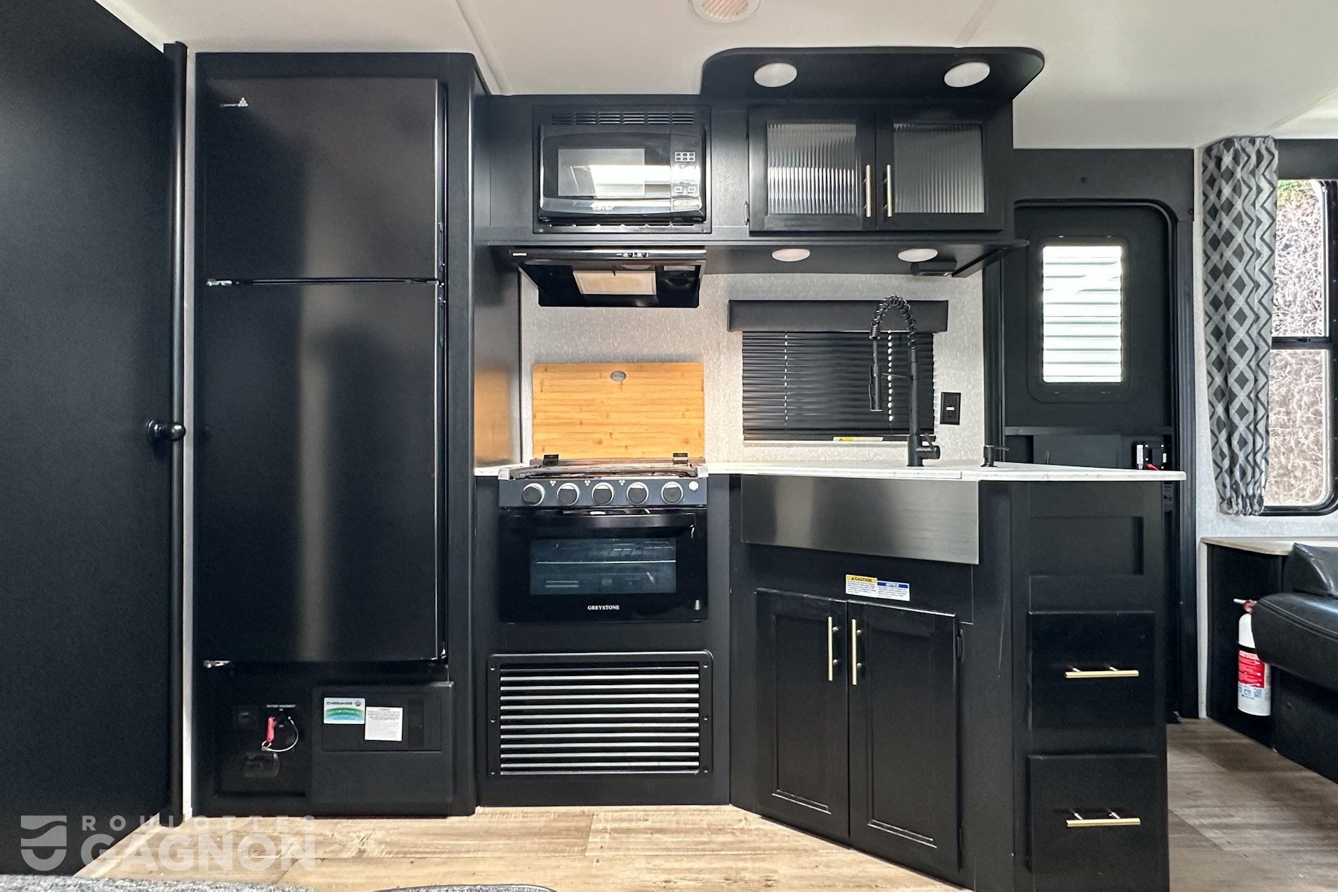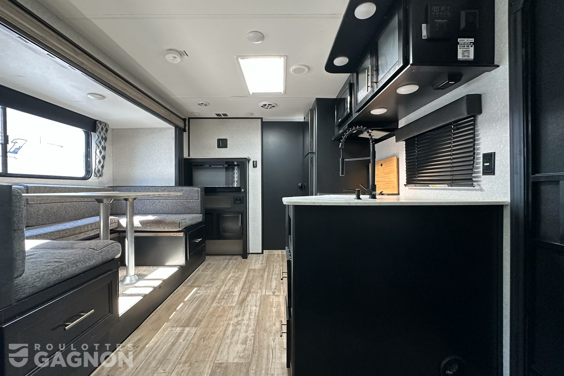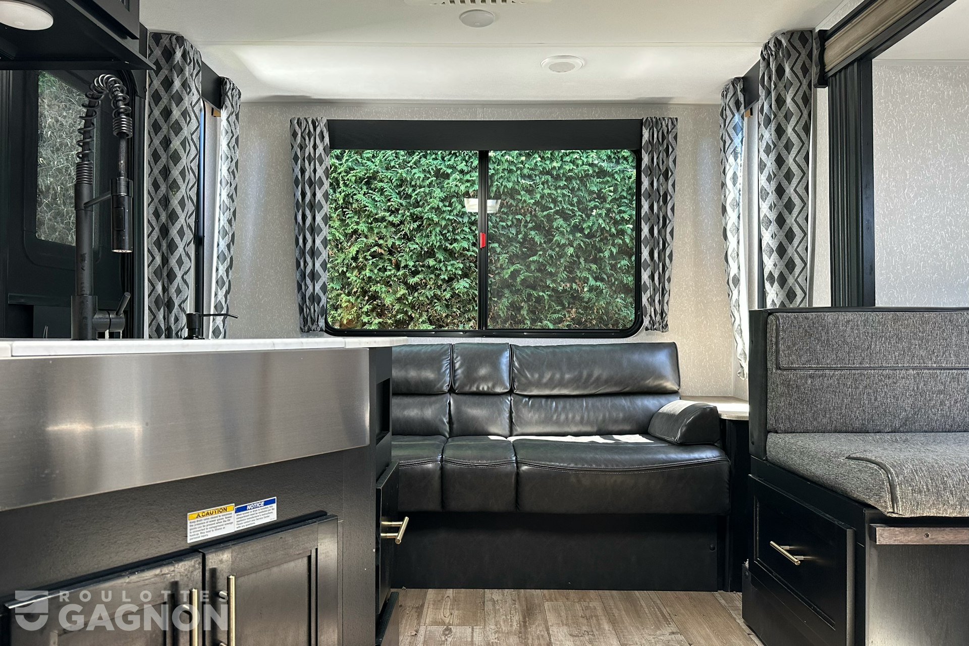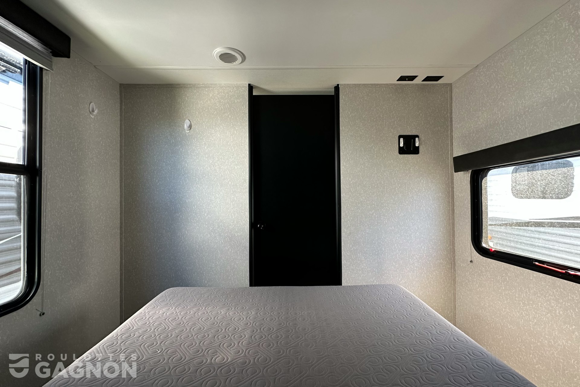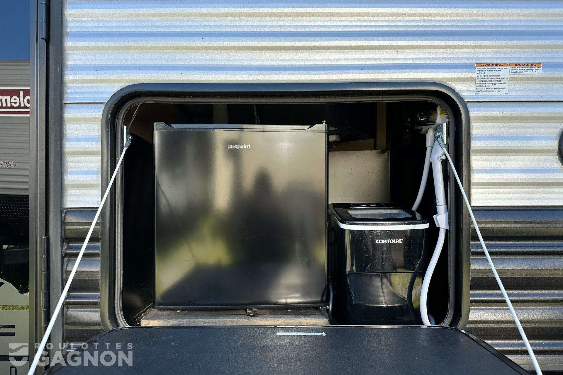 Roulotte Grey Wolf 23 MK 2022 usagée à vendre. Cette roulotte de voyage fabriquée par Forest River est idéale pour un couple et peut coucher jusqu’à 6 personnes. La Grey Wolf 23 MK mesure 28.8 pieds et pèse 5013 lb, son revêtement est en aluminium et les options suivantes sont incluses : jack de pole électrique, vérins stabilisateurs manuels, préparation pour caméra de recul, caméra de recul incluse, plateforme cargo, auvent électrique, marche pied en un bloc (solid step), prise câble ou satellite, bluetooth, prise USB, radio, hauts parleurs extérieurs, éclairage au DEL, climatiseur, puits de lumière, douche extérieure, mags, machine à glaçon et frigo extérieur, panneau solaire, slide topper et foyer électrique.