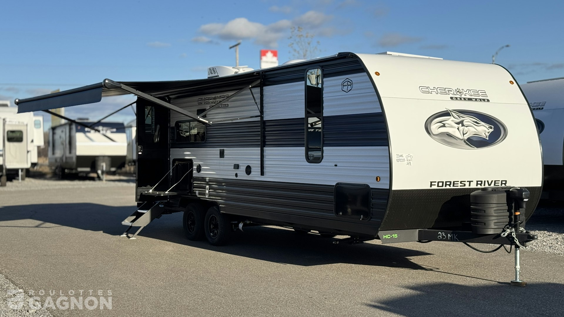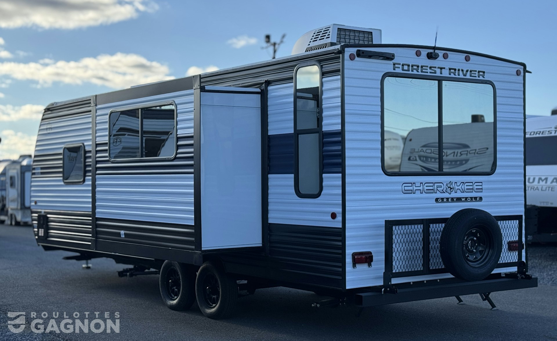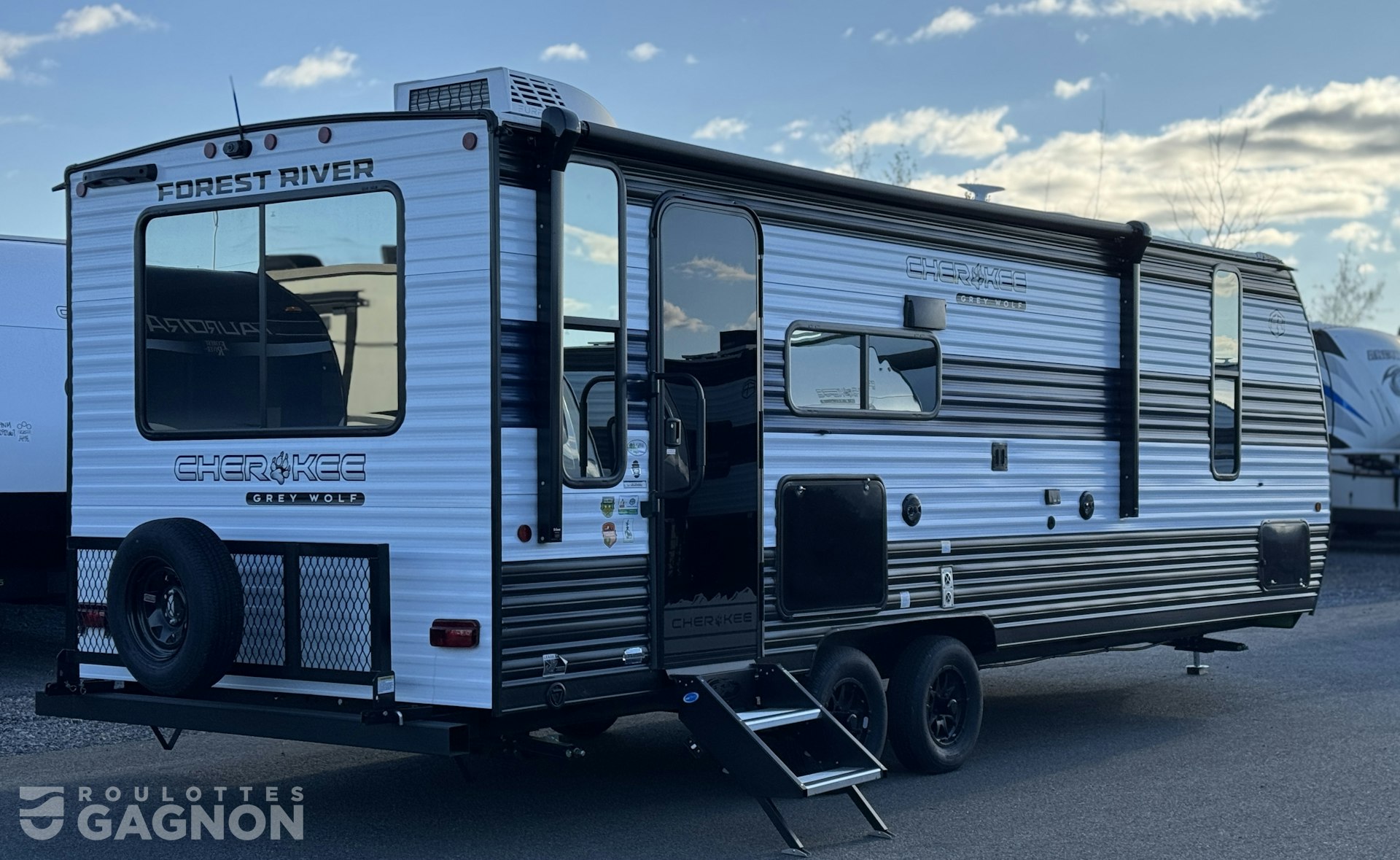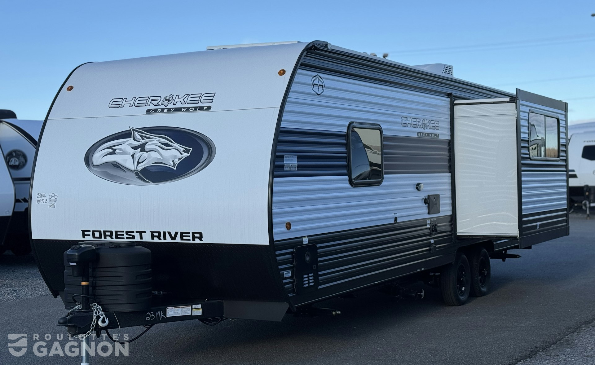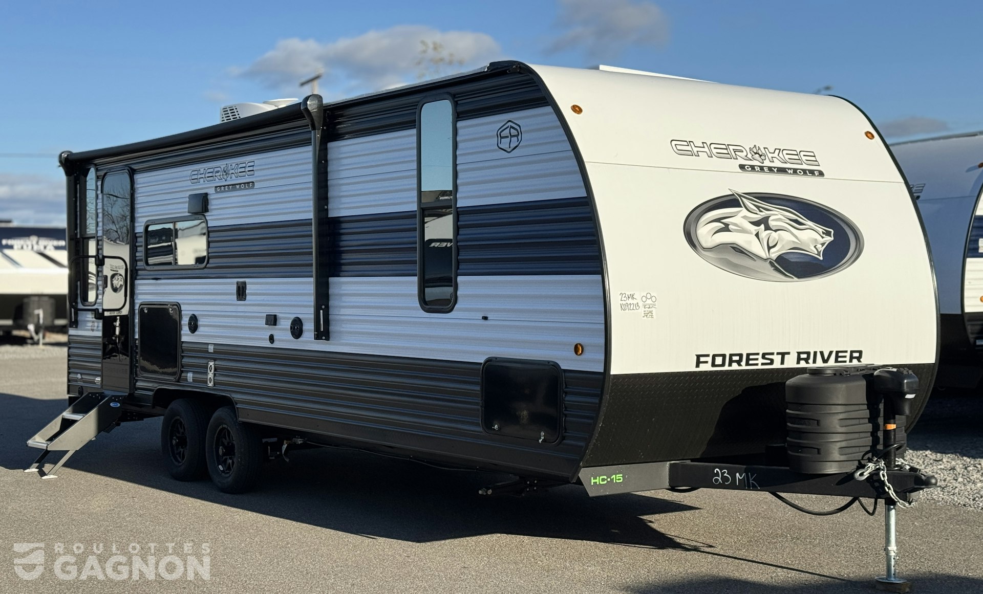 Roulotte Grey Wolf 23 MK 2026 neuve à vendre. Cette roulotte de voyage fabriquée par Forest River est idéale pour un couple et peut coucher jusqu’à 5 personnes. La Grey Wolf 23 MK mesure 29 pieds et pèse 5 025 lb, son revêtement est en aluminium et les options suivantes sont incluses : jack de pole électrique, vérins stabilisateurs manuels, préparation pour caméra de recul, caméra de recul incluse, plateforme cargo, auvent électrique, marche pied en un bloc (solid step), prise câble ou satellite, bluetooth, prise USB, radio, hauts parleurs extérieurs, éclairage au DEL, climatiseur, puits de lumière, douche extérieure, mags, panneau solaire 200 w, chauffe-eau instantané, prises usb c, fenêtres à verre énergétique réfléchissant, machine à glaçon et frigo extérieur, ondulateur 150w près du lit et foyer électrique.