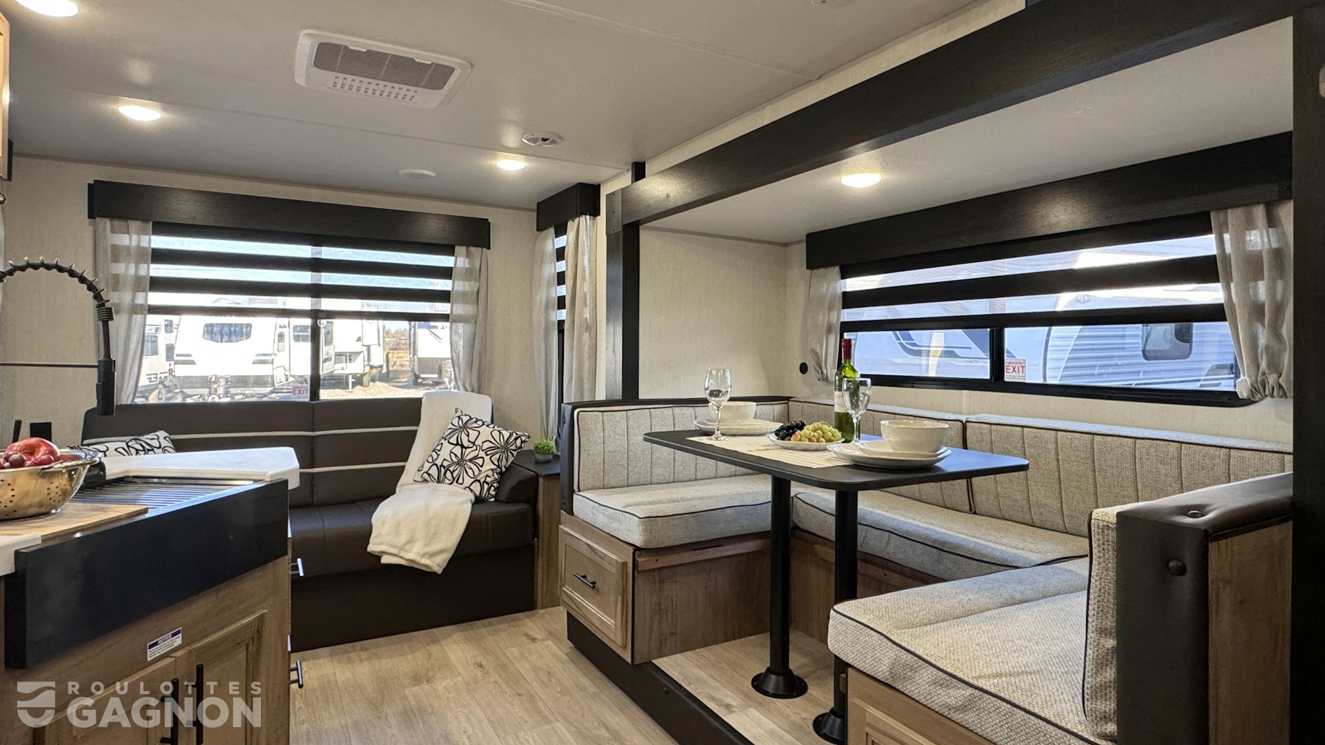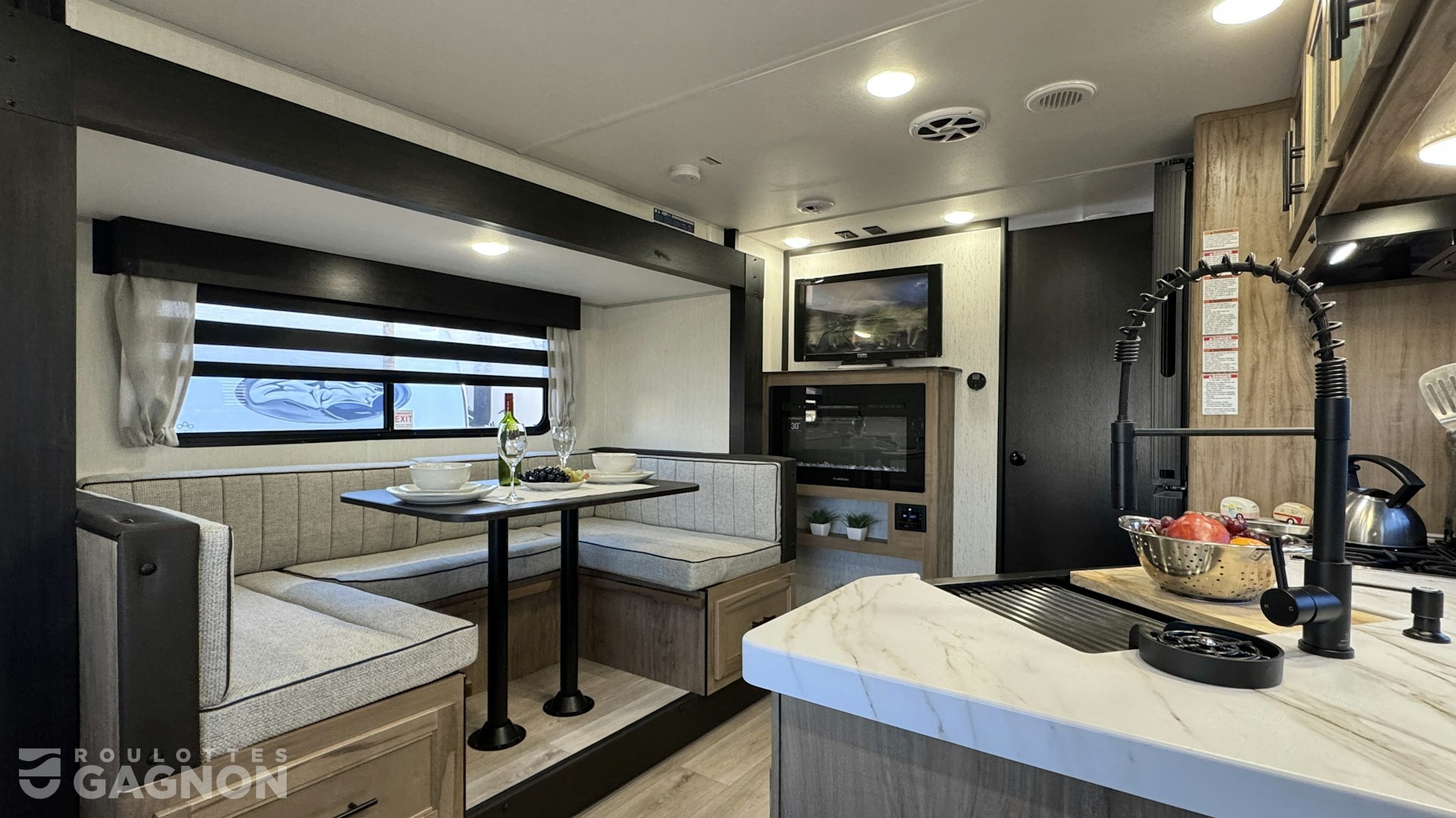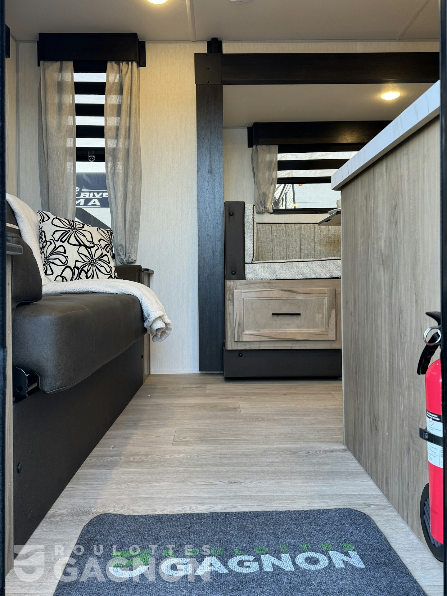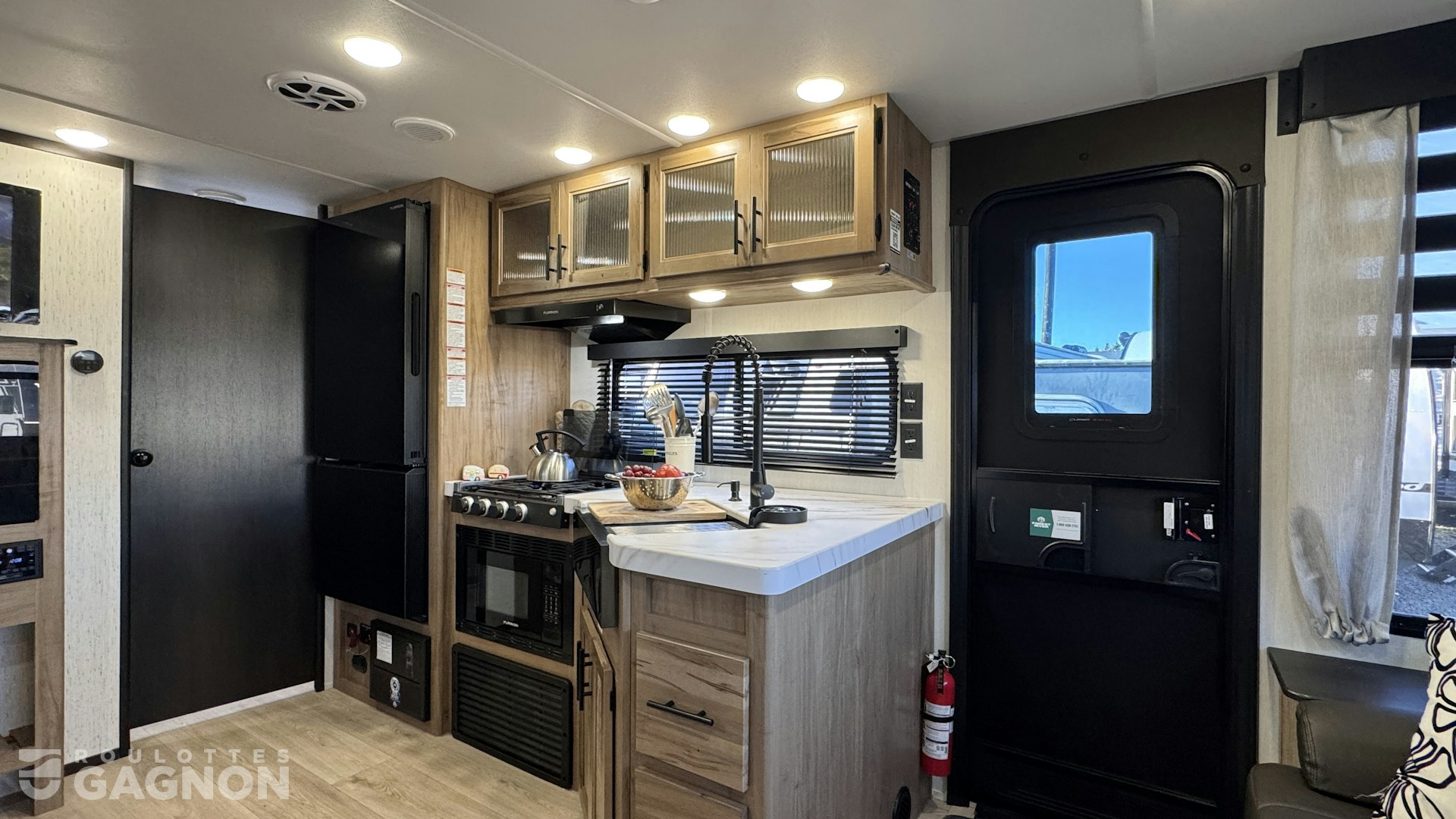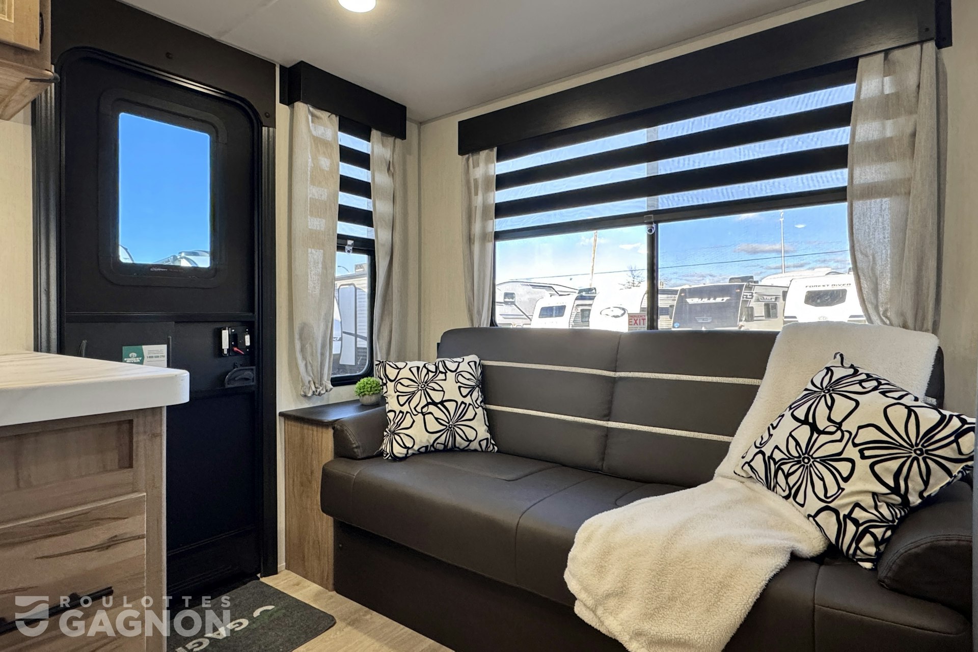 Roulotte Grey Wolf 23 MK 2026 neuve à vendre. Cette roulotte de voyage fabriquée par Forest River est idéale pour un couple et peut coucher jusqu’à 5 personnes. La Grey Wolf 23 MK mesure 29 pieds et pèse 5 025 lb, son revêtement est en aluminium et les options suivantes sont incluses : jack de pole électrique, vérins stabilisateurs manuels, préparation pour caméra de recul, caméra de recul incluse, plateforme cargo, auvent électrique, marche pied en un bloc (solid step), prise câble ou satellite, bluetooth, prise USB, radio, hauts parleurs extérieurs, éclairage au DEL, climatiseur, puits de lumière, douche extérieure, mags, panneau solaire 200 w, chauffe-eau instantané, prises usb c, fenêtres à verre énergétique réfléchissant, machine à glaçon et frigo extérieur, ondulateur 150w près du lit et foyer électrique.