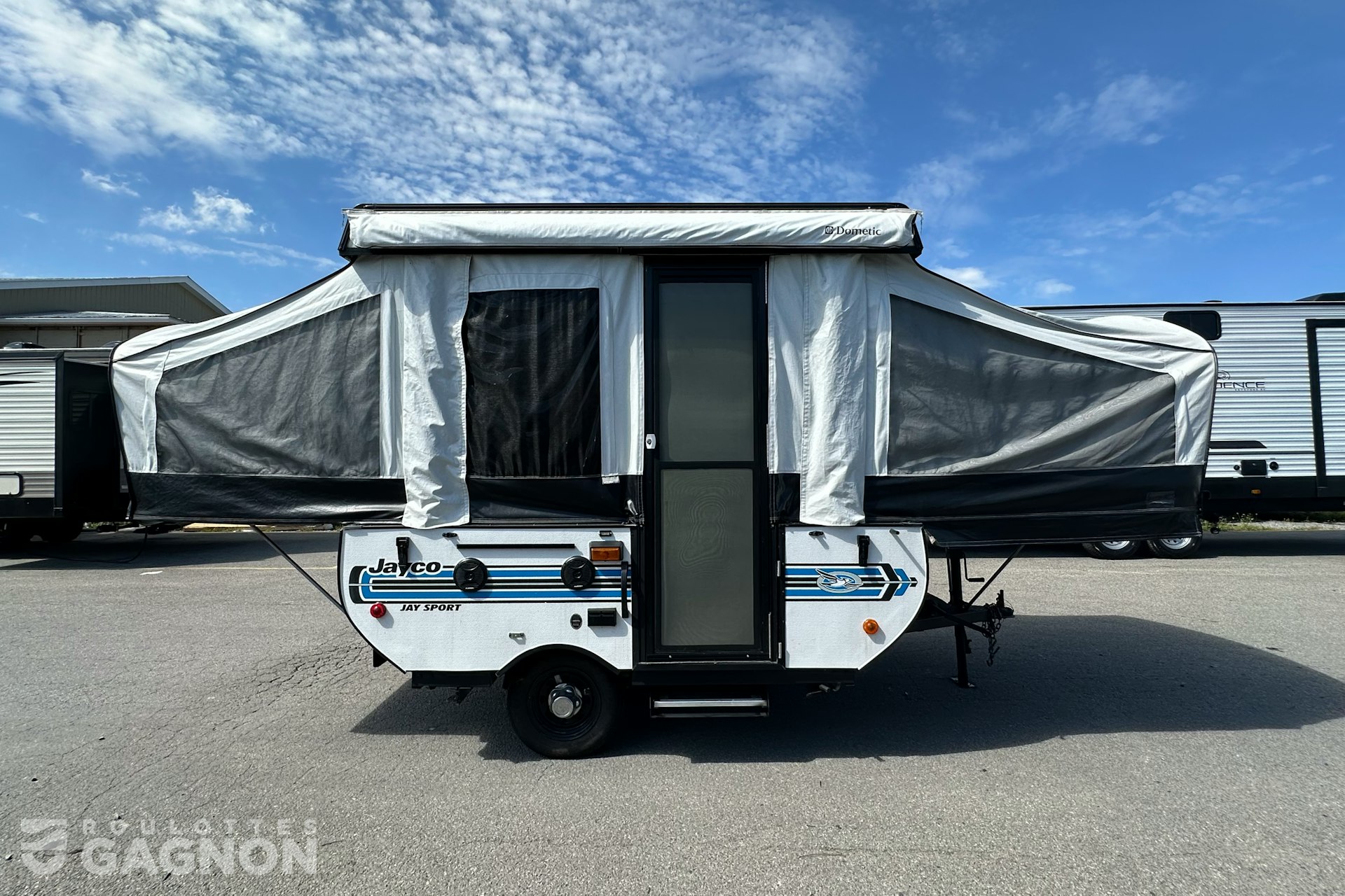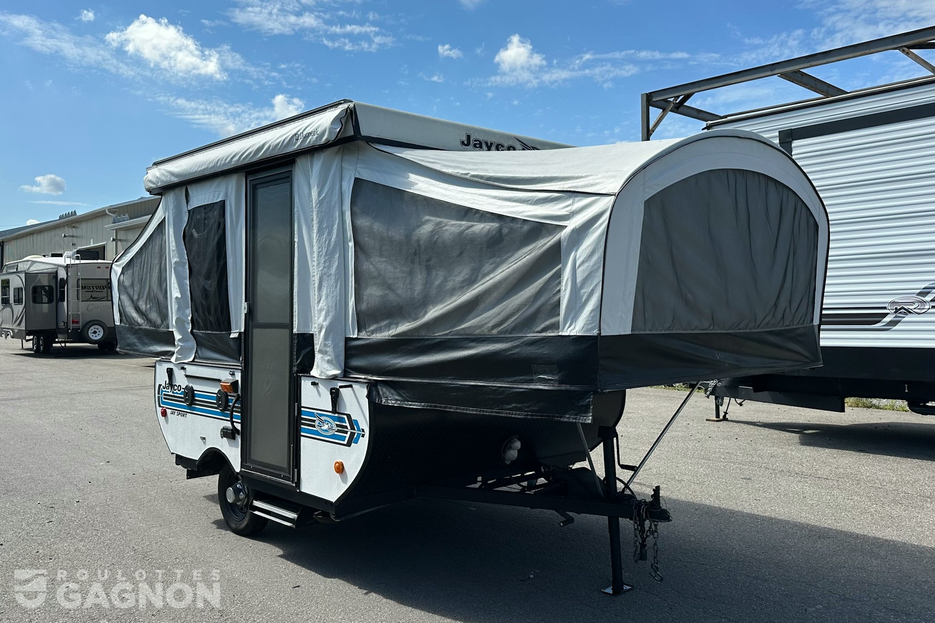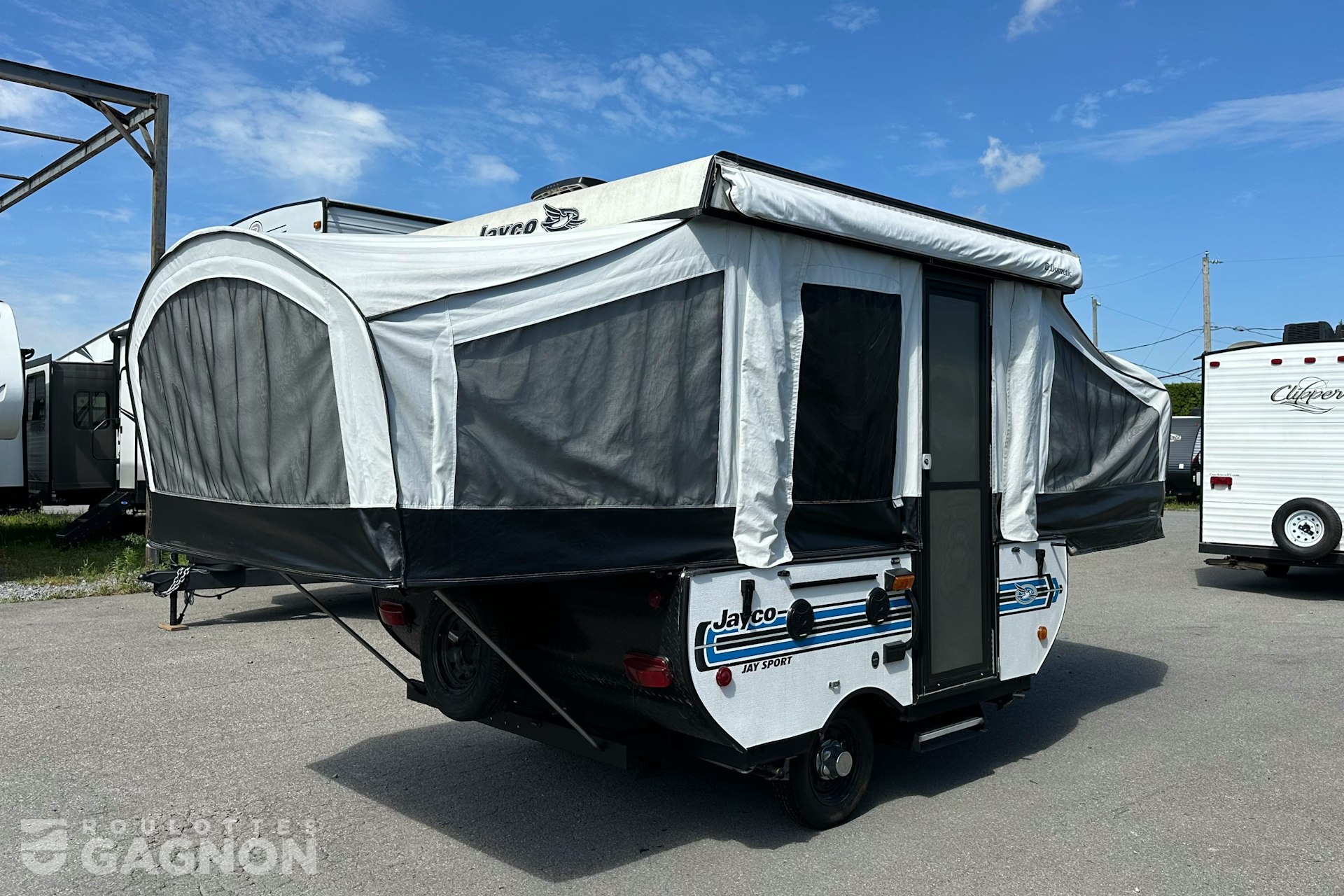 Roulotte Jay Sport 8 SD 2017 usagée à vendre. Cette tente roulotte fabriquée par Jayco peut coucher jusqu’à 6 personnes. La Jay Sport 8 SD mesure 11.6 pieds et pèse 1590 lb, son revêtement est en aluminium et les options suivantes sont incluses : vérins stabilisateurs manuels, auvent manuel, prise câble ou satellite, radio et hauts parleurs extérieurs.