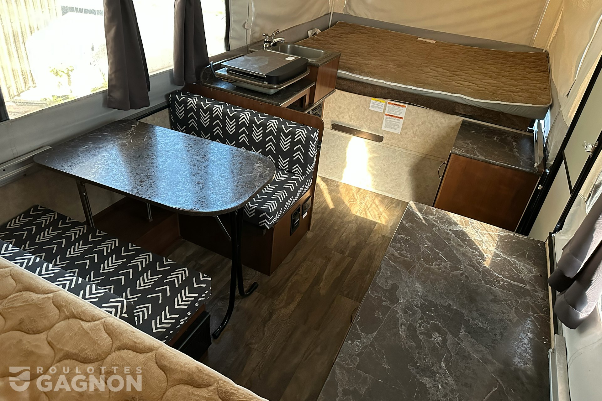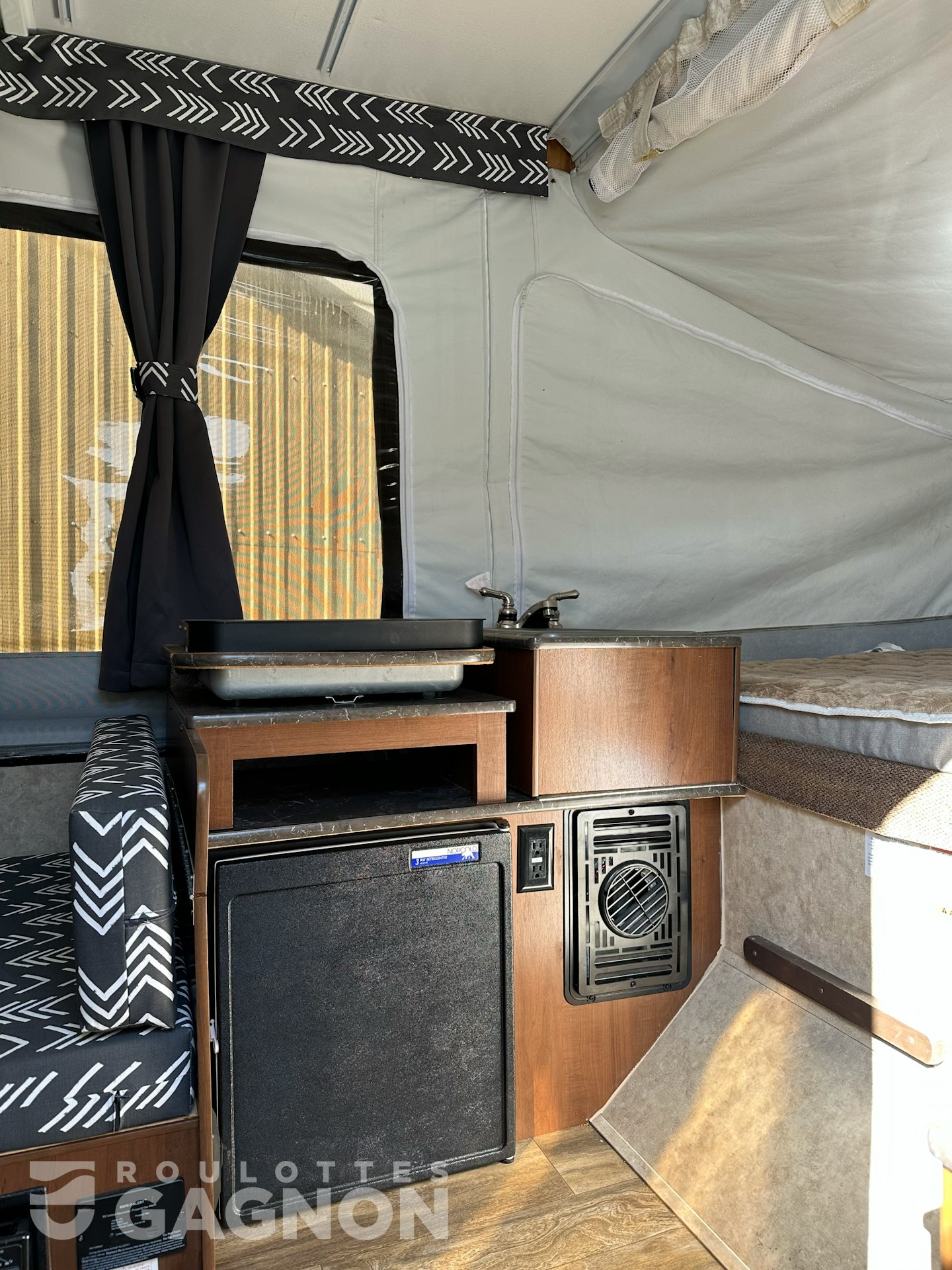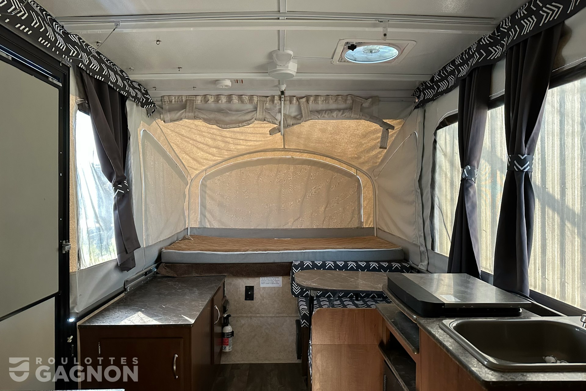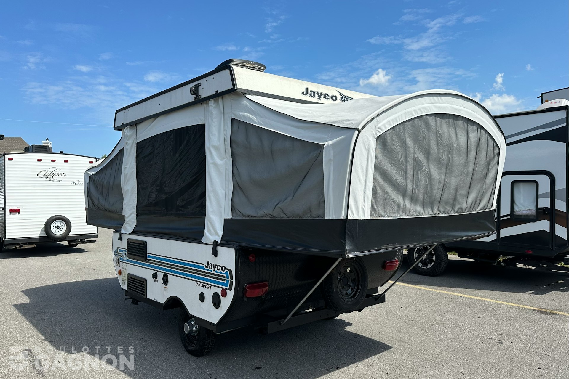 Roulotte Jay Sport 8 SD 2017 usagée à vendre. Cette tente roulotte fabriquée par Jayco peut coucher jusqu’à 6 personnes. La Jay Sport 8 SD mesure 11.6 pieds et pèse 1590 lb, son revêtement est en aluminium et les options suivantes sont incluses : vérins stabilisateurs manuels, auvent manuel, prise câble ou satellite, radio et hauts parleurs extérieurs.