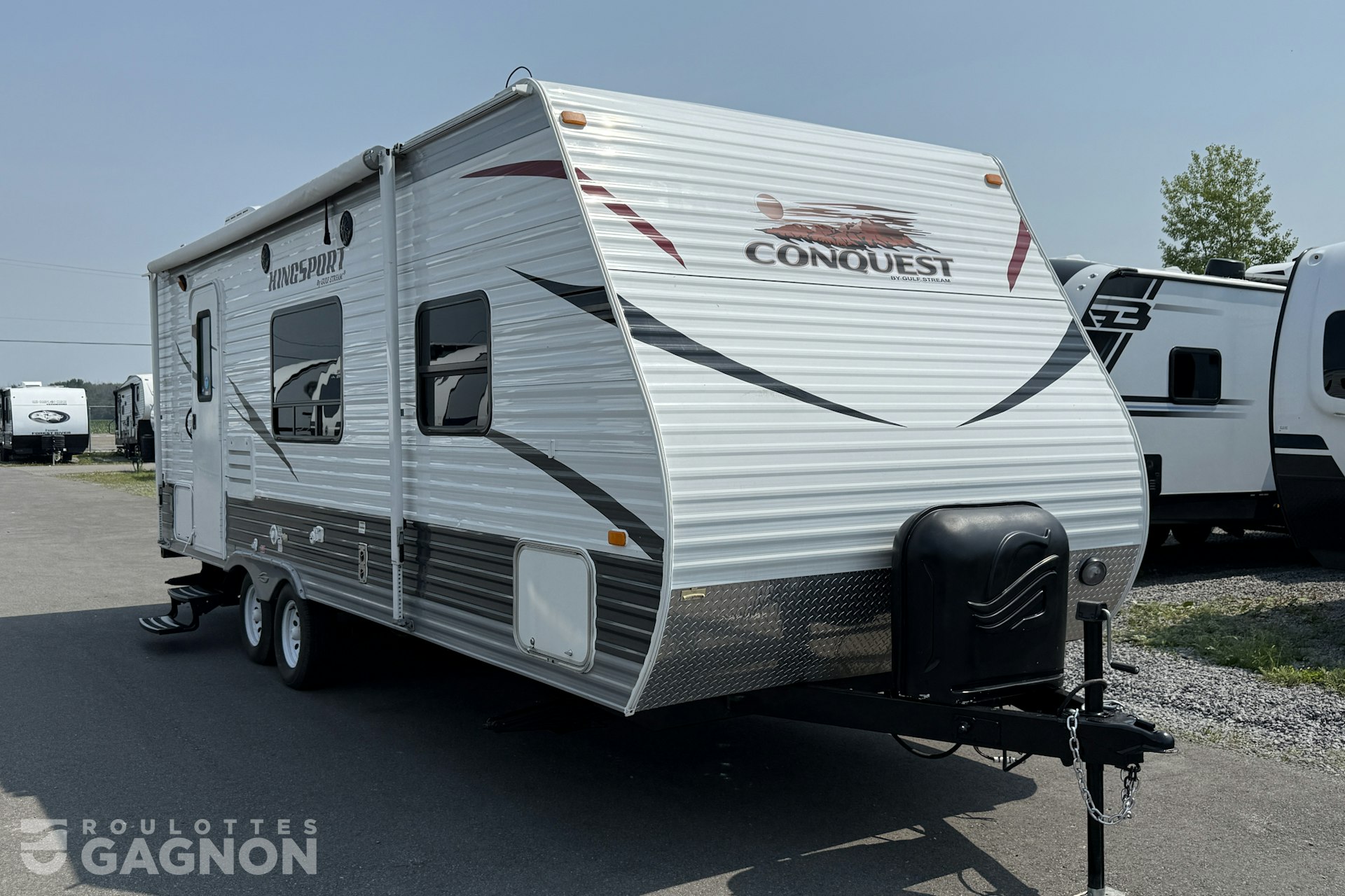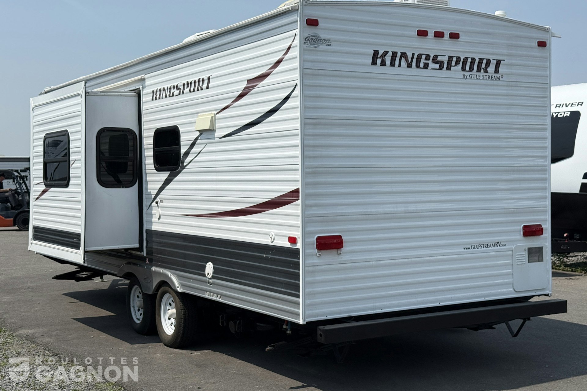 Roulotte Kingsport 23 RBS 2011 usagée à vendre. Cette roulotte de voyage est idéale pour un couple et peut coucher jusqu’à 4 personnes. La Kingsport 23 RBS mesure 24.4 pieds et pèse 4890 lb, son revêtement est en aluminium et les options suivantes sont incluses : vérins stabilisateurs manuels, auvent manuel et climatiseur.