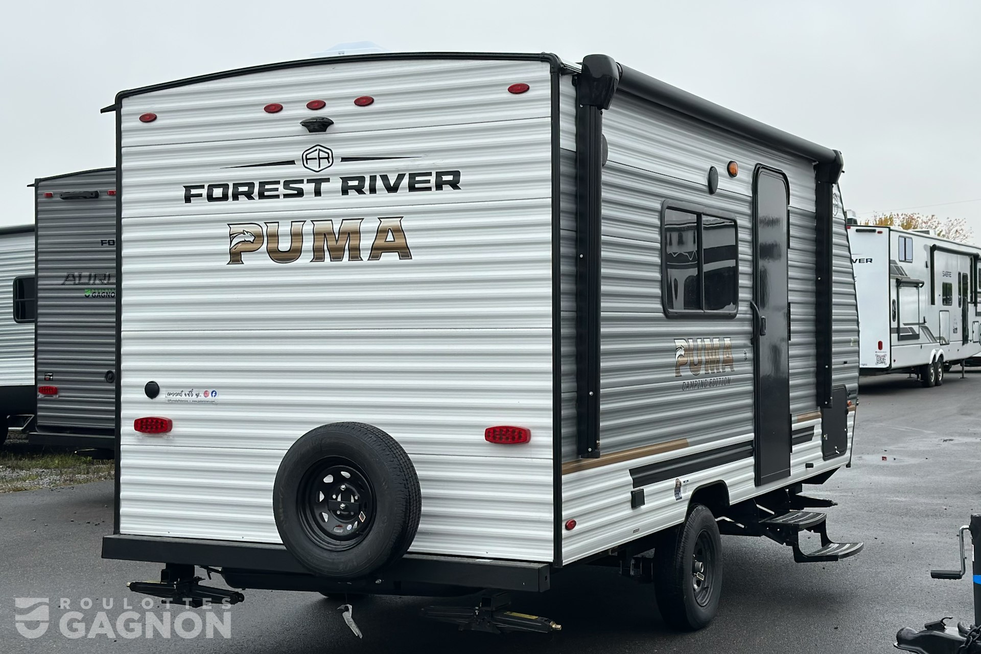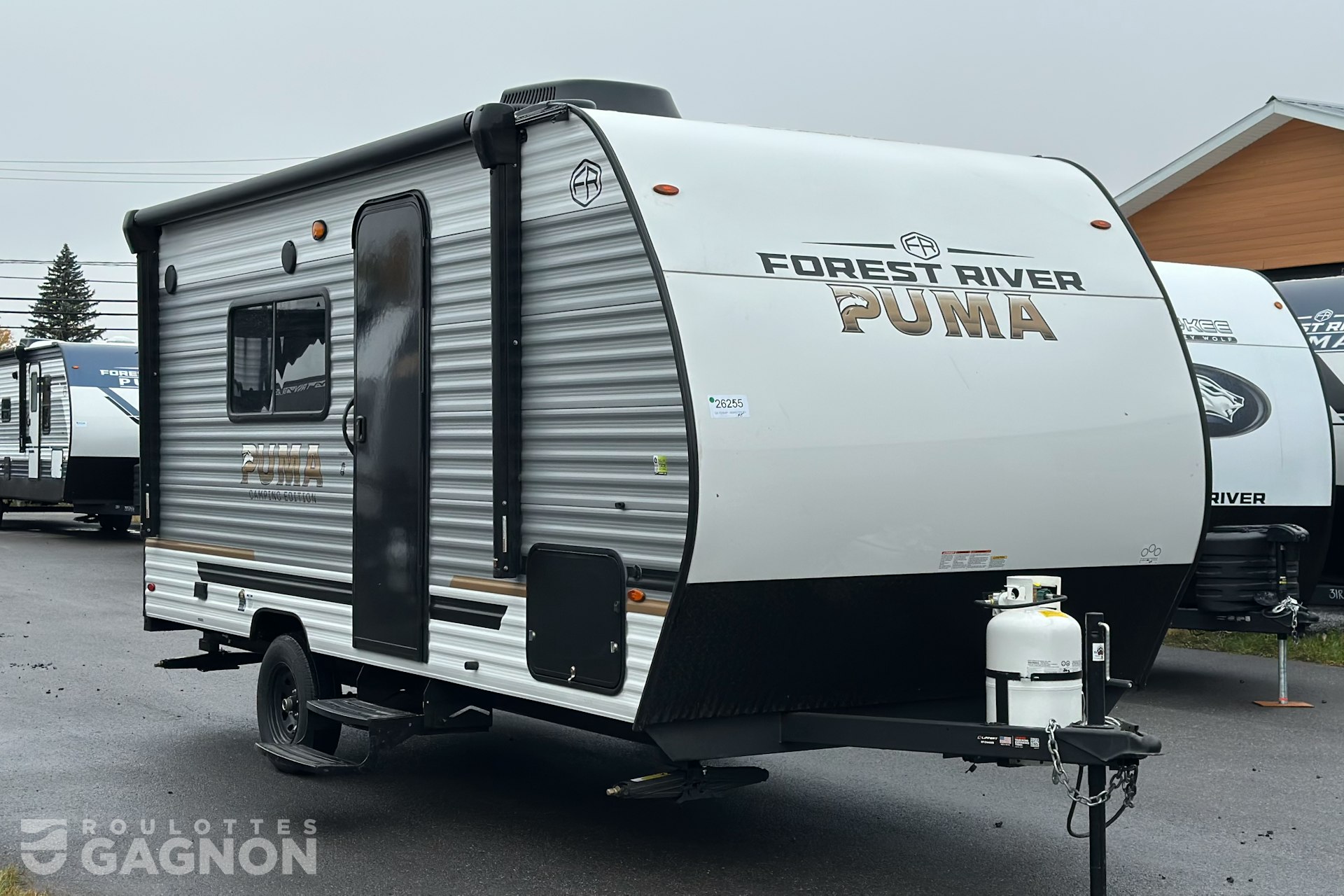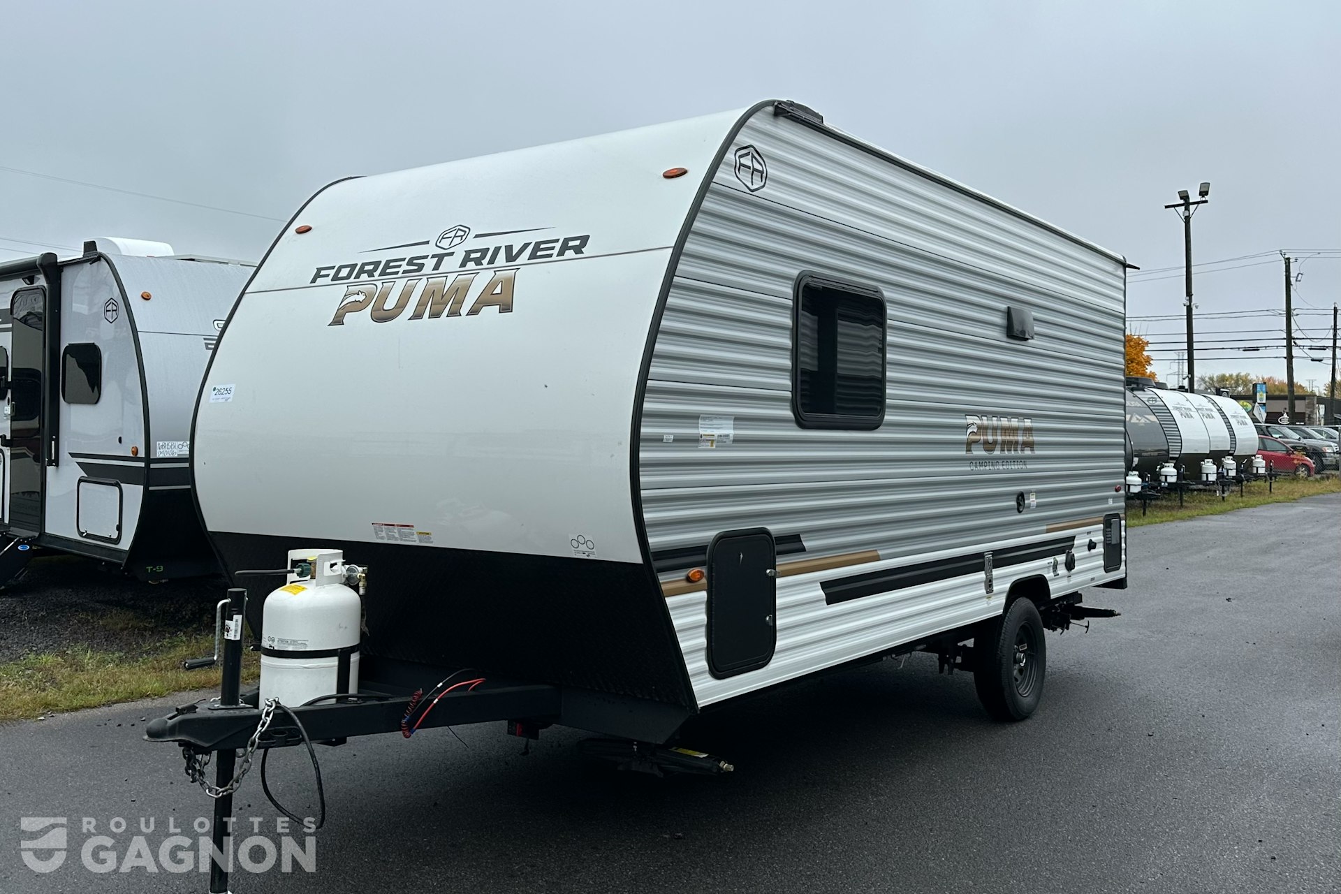 Roulotte Puma 16 QBCE 2026 neuve à vendre. Cette roulotte de voyage fabriquée par Forest River est idéale pour un couple et peut coucher jusqu’à 3 personnes. La Puma 16 QBCE mesure 20,9 pieds et pèse 3 398 lb, son revêtement est en aluminium et les options suivantes sont incluses : vérins stabilisateurs manuels, préparation pour caméra de recul, auvent électrique, prise câble ou satellite, prise pour panneau solaire, bluetooth, prise USB, radio, hauts parleurs extérieurs, éclairage au DEL, climatiseur, prises usb c et panneau solaire.