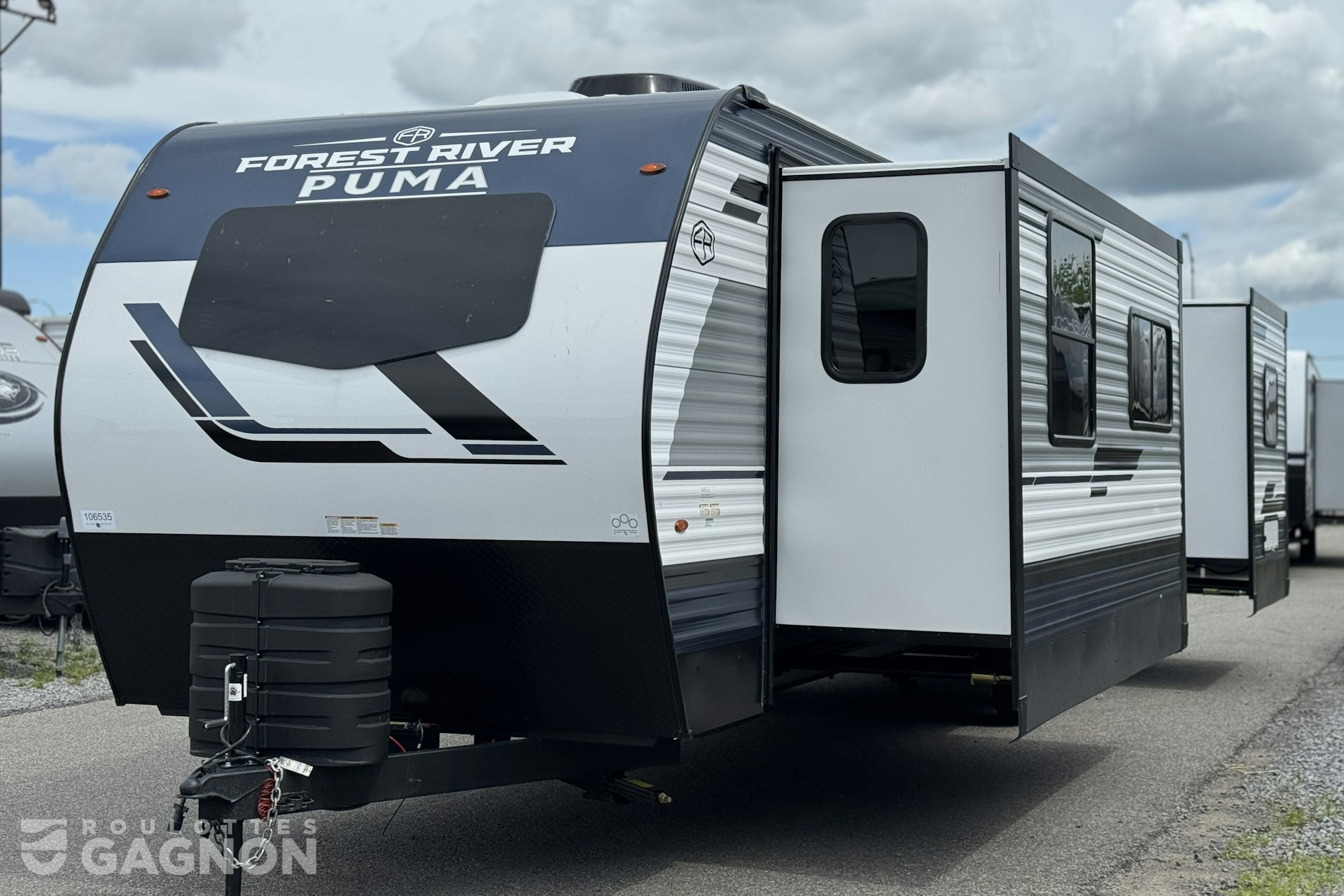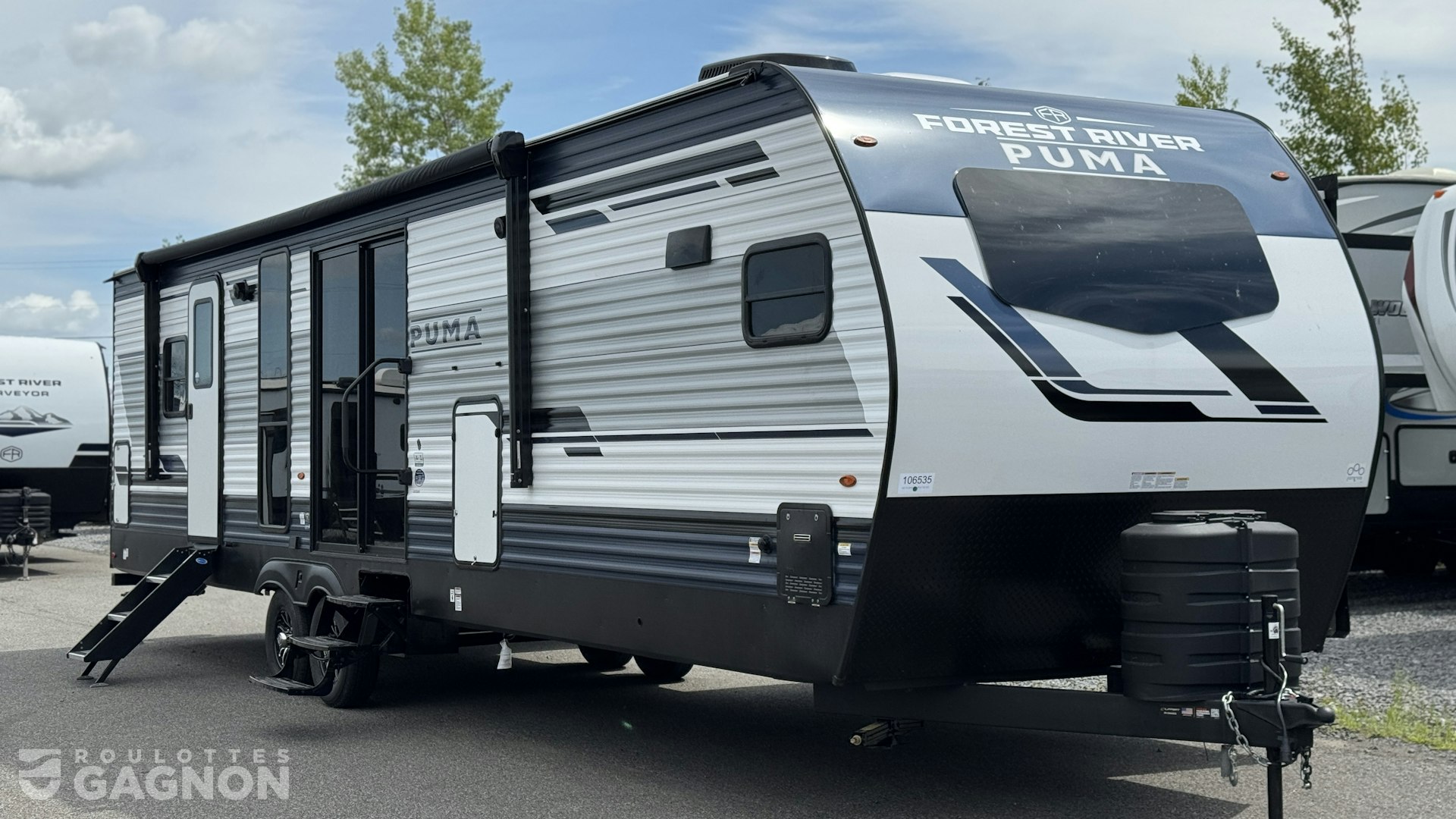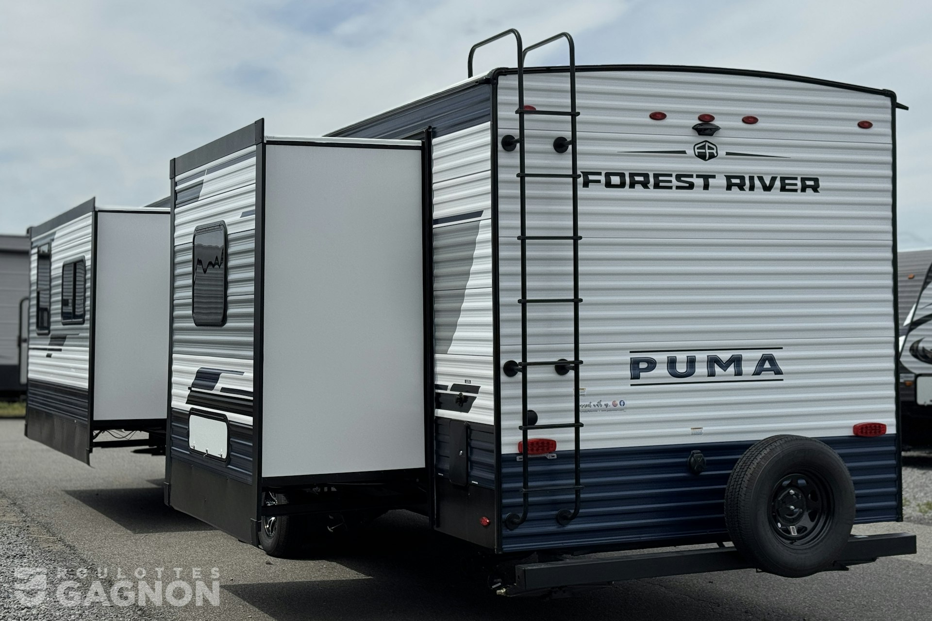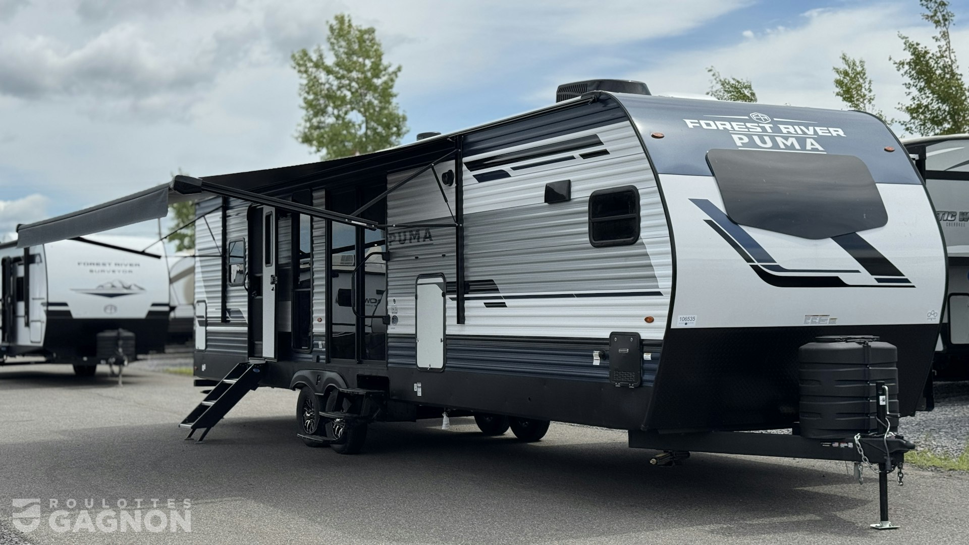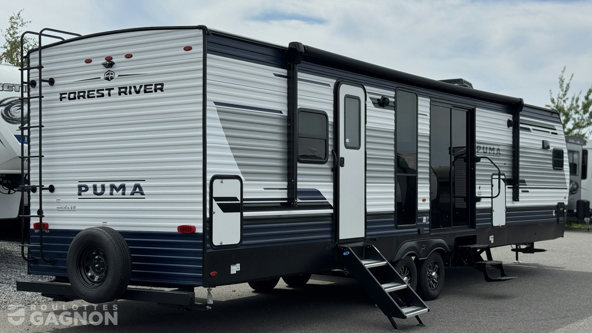 Roulotte Puma 31 FKRK 2026 neuve à vendre. Cette roulotte de parc fabriquée par Forest River est idéale pour un couple et peut coucher jusqu’à 4 personnes. La Puma 31 FKRK mesure 37,1 pieds et pèse 8 295 lb, son revêtement est en aluminium et les options suivantes sont incluses : vérins stabilisateurs manuels, préparation pour caméra de recul, échelle, auvent électrique, marche pied en un bloc (solid step), prise câble ou satellite, prise pour panneau solaire, bluetooth, prise USB, radio, hauts parleurs extérieurs, éclairage au DEL, climatiseur, puits de lumière, douche extérieure, mags, foyer électrique, prises usb c, chauffe-eau instantané et préparation pour laveuse et sécheuse.
