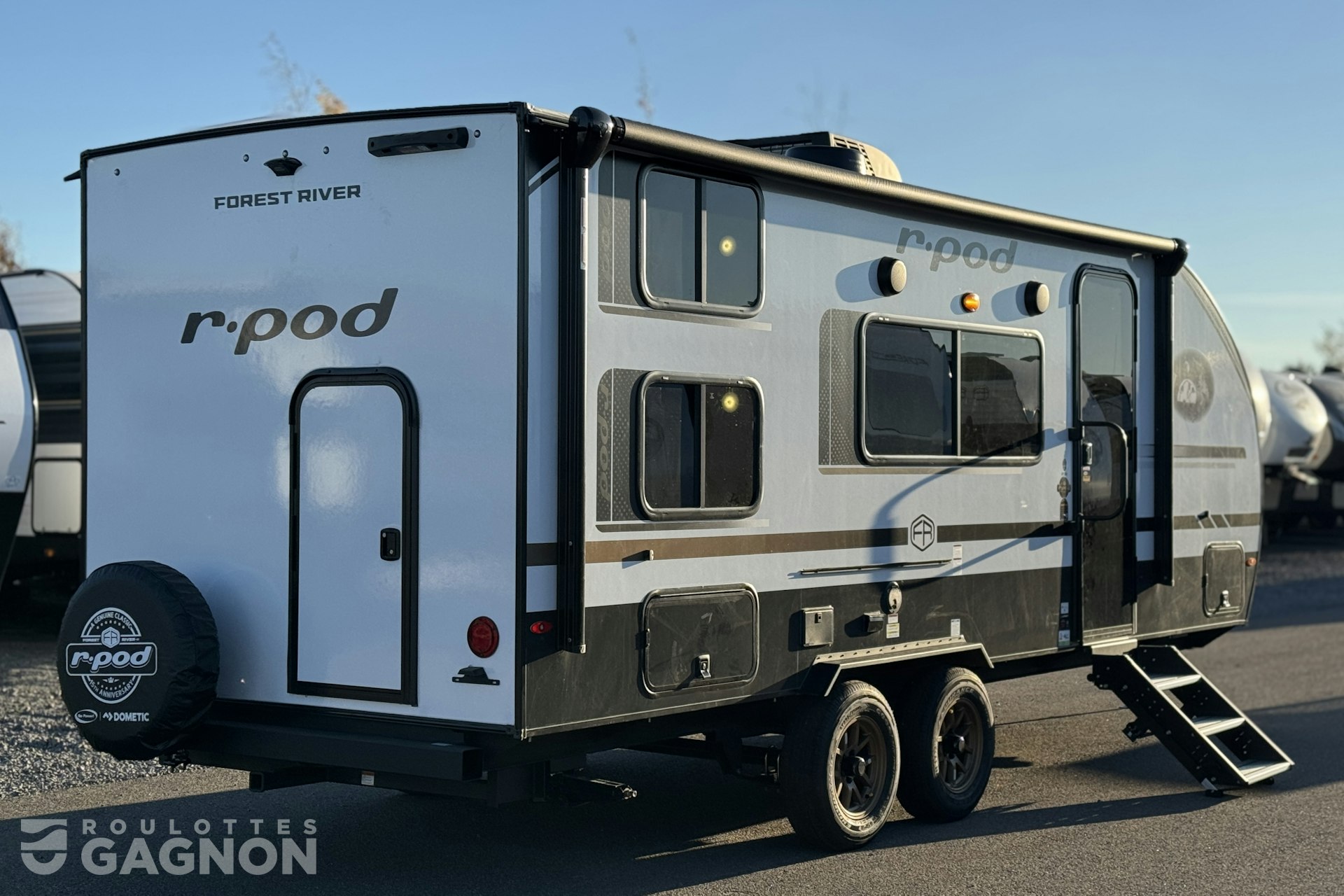 Roulotte R-Pod RPT 200 2025 neuve à vendre. Cette roulotte de voyage fabriquée par Forest River est idéale pour une famille et peut coucher jusqu’à 8 personnes. La R-Pod RPT 200 mesure 25 pieds et pèse 4544 lb, son revêtement est en fibre de verre et les options suivantes sont incluses : jack de pole électrique, vérins stabilisateurs manuels, préparation pour caméra de recul, auvent électrique, marche pied en un bloc (solid step), prise câble ou satellite, bluetooth, prise USB, téléviseur, radio, hauts parleurs extérieurs, éclairage au DEL, climatiseur, puits de lumière, douche extérieure, mags, moniteur de pression des pneus, panneau solaire, hitch arrière, porte cargo arrière, plaque de cuisson extérieure, murphy bed, chauffe-eau instantané, balayeuse centrale et prises usb c.