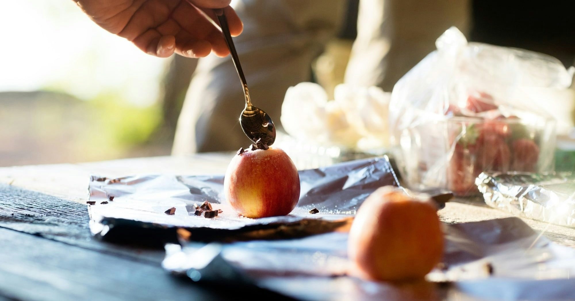 Cuire sur les braises environ 20 à 30 minutes. Vous pouvez servir à même la papillote et garnir de crème fouettée ou de crème glacée, si vous en avez sous la main.