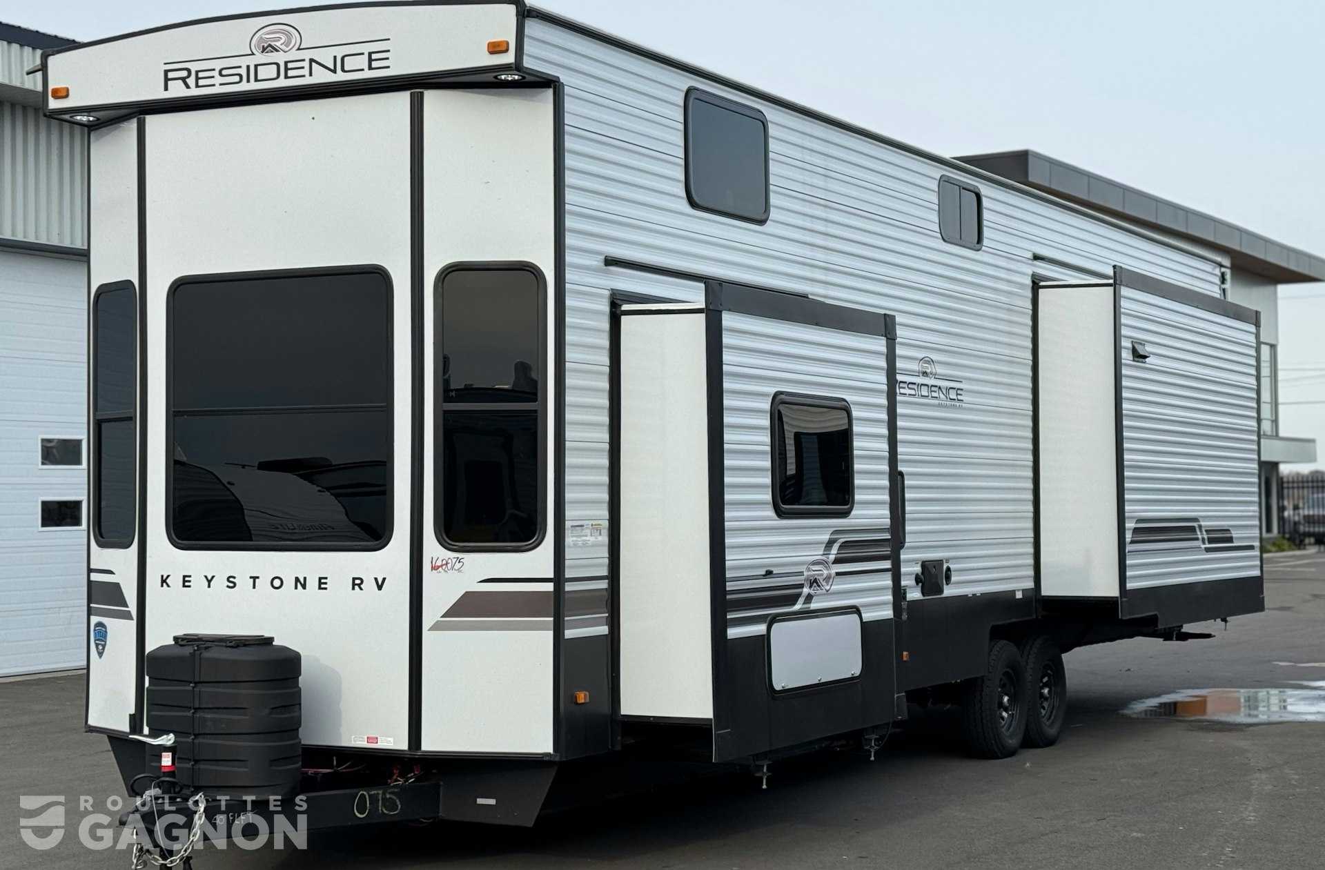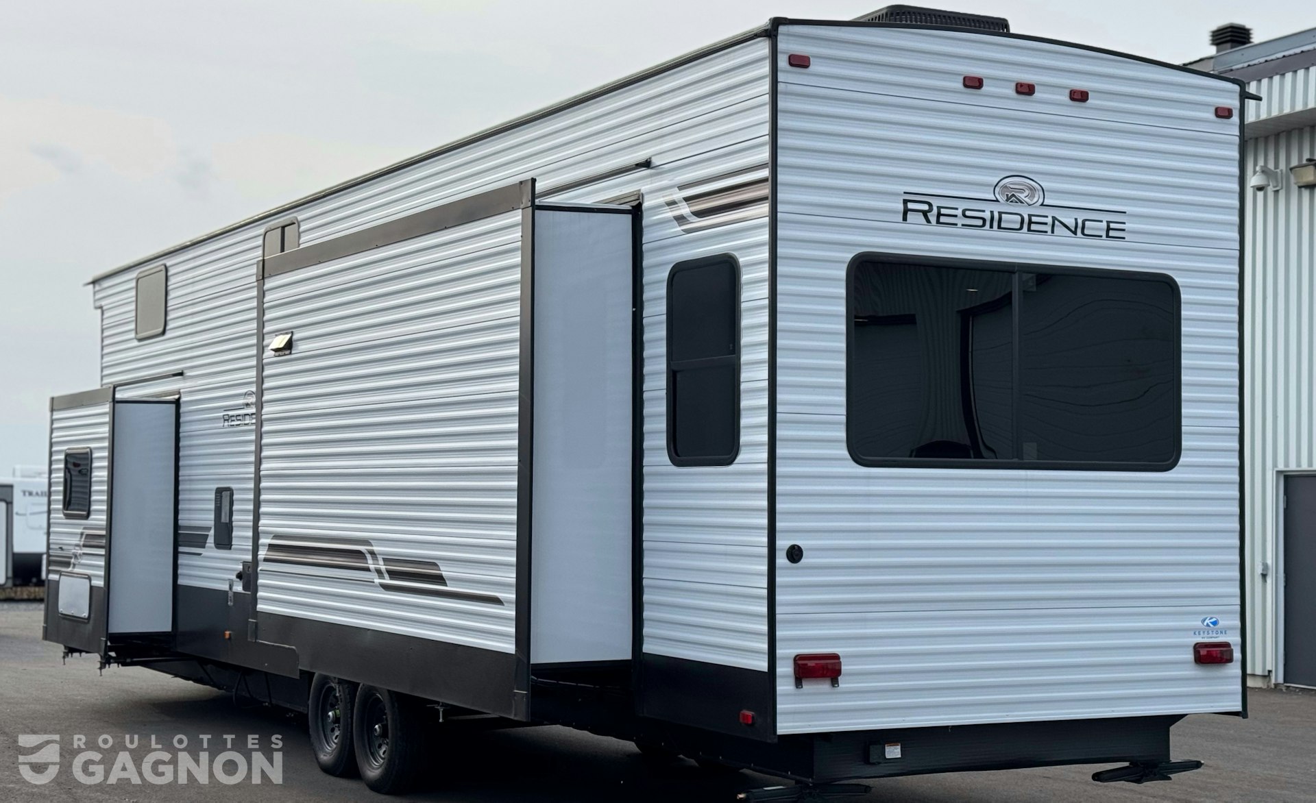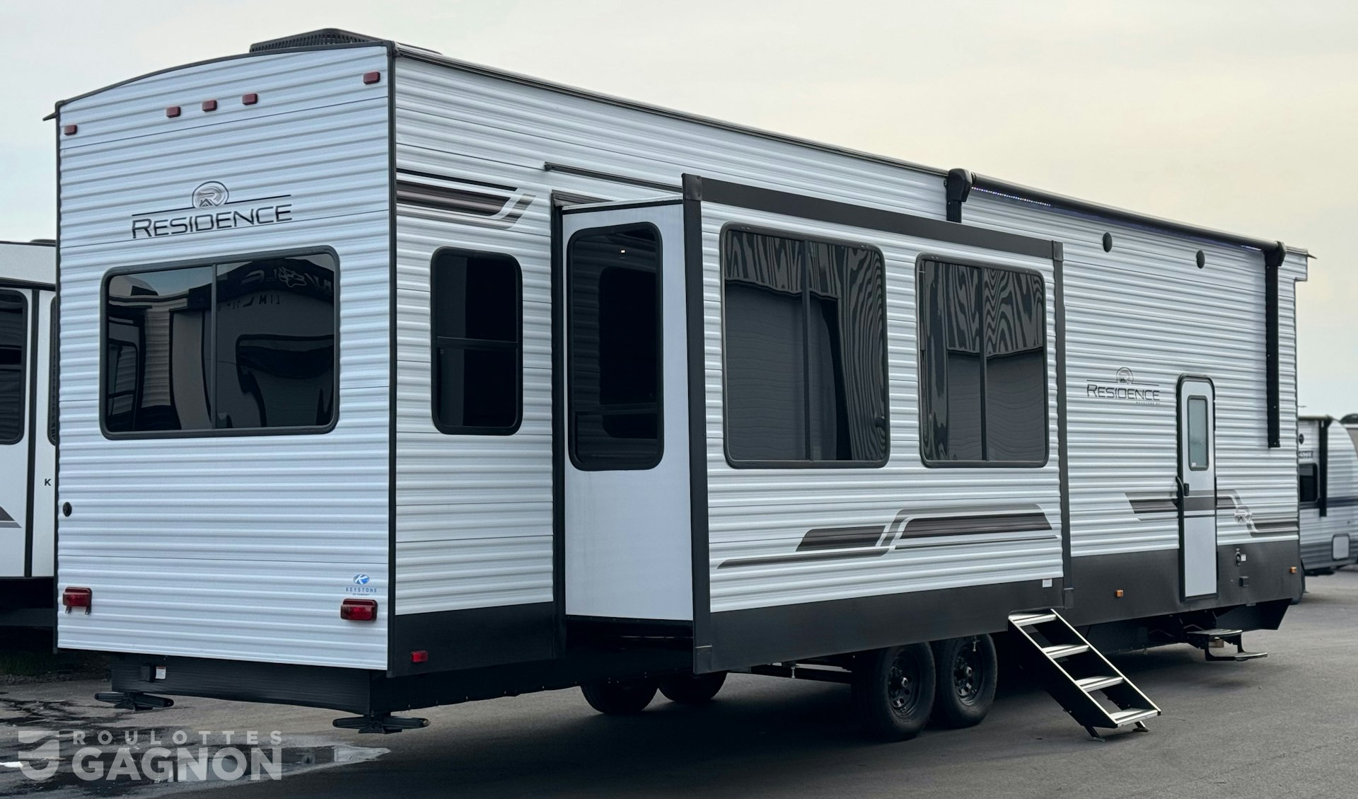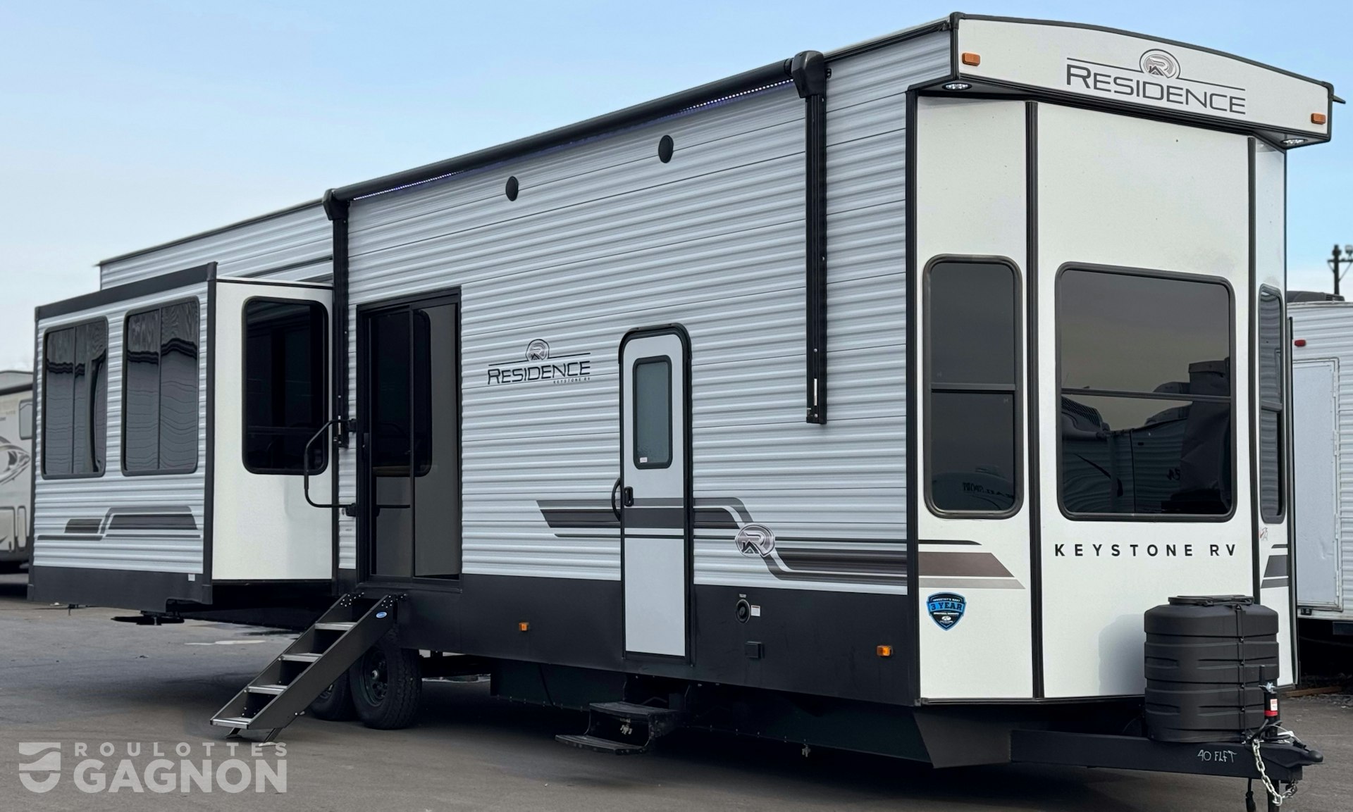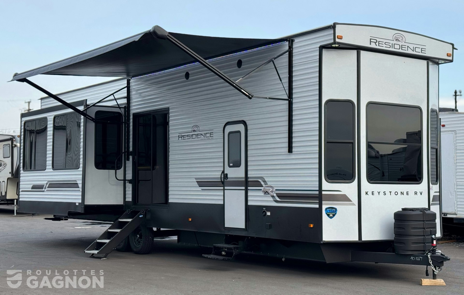 Roulotte ResidenceResidence 40 FLFT40 FLFT 20252025 neuve à vendre. Cette roulotte de parc fabriquée par KeystoneKeystone est idéale pour une famille et peut coucher jusqu’à 7 personnes. La ResidenceResidence 40 FLFT40 FLFT mesure 40,1 pieds et pèse 13 013 lb, son revêtement est en aluminium et les options suivantes sont incluses : auvent électrique, marche pied en un bloc (solid step), prise câble ou satellite, bluetooth, prise USB, téléviseur, radio, hauts parleurs extérieurs, éclairage au DEL, climatiseur, ventilateur de plafond, puits de lumière et douche extérieure.