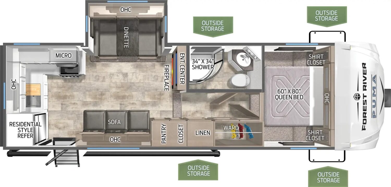 Roulotte Puma 255RKS 2019 usagée à vendre. Cette roulotte Fifth Wheel fabriquée par Forest River est idéale pour un couple et peut coucher jusqu’à 6 personnes. La Puma 255RKS 2019 mesure 28.5 pieds et pèse 6692 lb, son revêtement est en aluminium et les options suivantes sont incluses : auvent électrique, caméra de recul incluse, climatiseur, douche extérieure, échelle, préparation pour caméra de recul, prise câble ou satellite, prise USB, puits de lumière, radio et vérins stabilisateurs électriques.