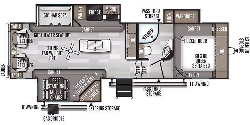 Note: Nous nous efforçons pour décrire les spécifications et les options des roulottes affichées sur notre site le plus précisément possible, toutefois, des erreurs peuvent se glisser. Nous sommes désolés si tel était le cas. Les photos sont à titre indicatif seulement. Les couleurs et les options peuvent varier selon les derniers changements apportés par le fabricant.