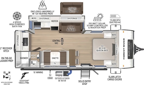 Roulotte Surveyor 204MKLE 2026 neuve à vendre. Cette roulotte de voyage fabriquée par Forest River est idéale pour un couple et peut coucher jusqu’à 4 personnes. La Surveyor 204MKLE 2026 mesure 27 pieds et pèse 5493 lb, son revêtement est en fibre de verre sur azdel et les options suivantes sont incluses : aspirateur central, auvent électrique, bluetooth, chauffe-eau instantané, climatiseur, douche extérieure, éclairage au DEL, hauts parleurs extérieurs, jack de pole électrique, marche pied en un bloc (solid step), moniteur de pression des pneus, panneau solaire, préparation pour caméra de recul, prise câble ou satellite, prise pour panneau solaire, prise USB, puits de lumière, radio, téléviseur et vérins stabilisateurs manuels.