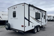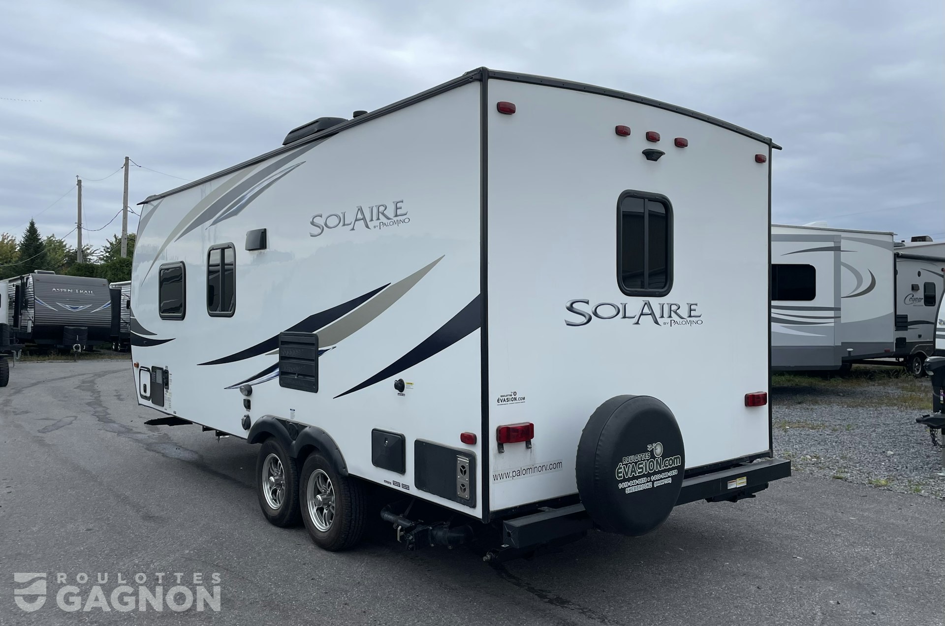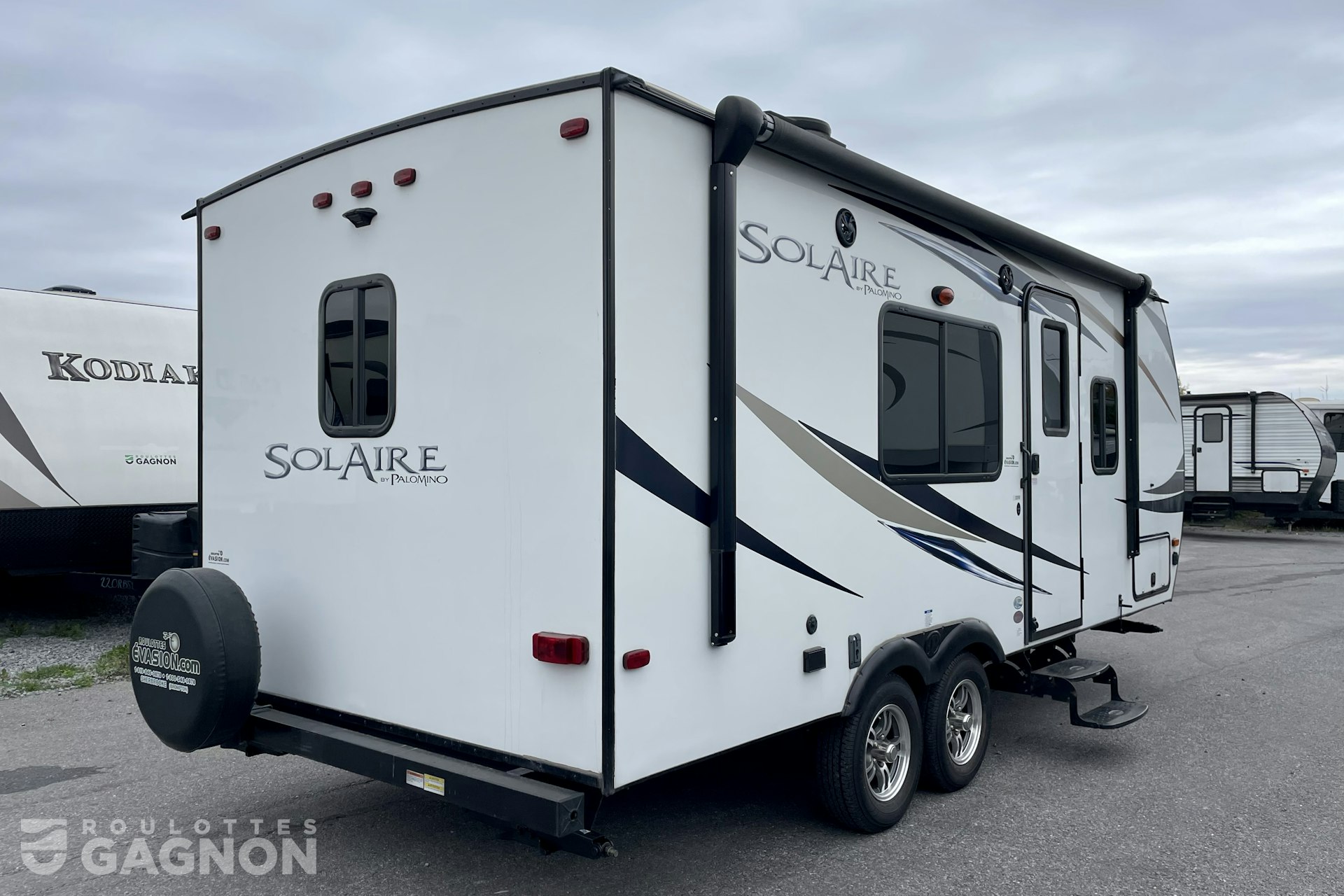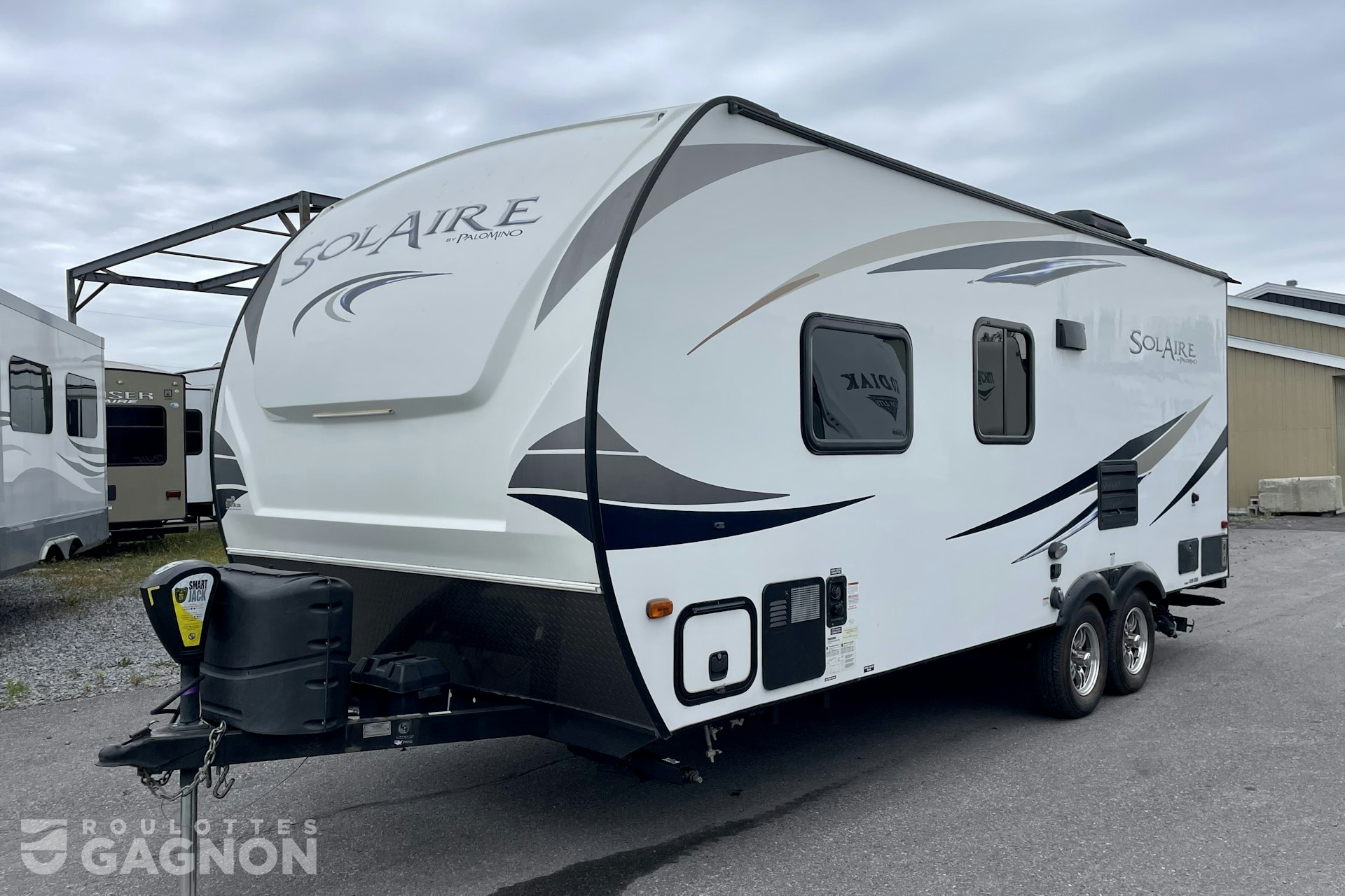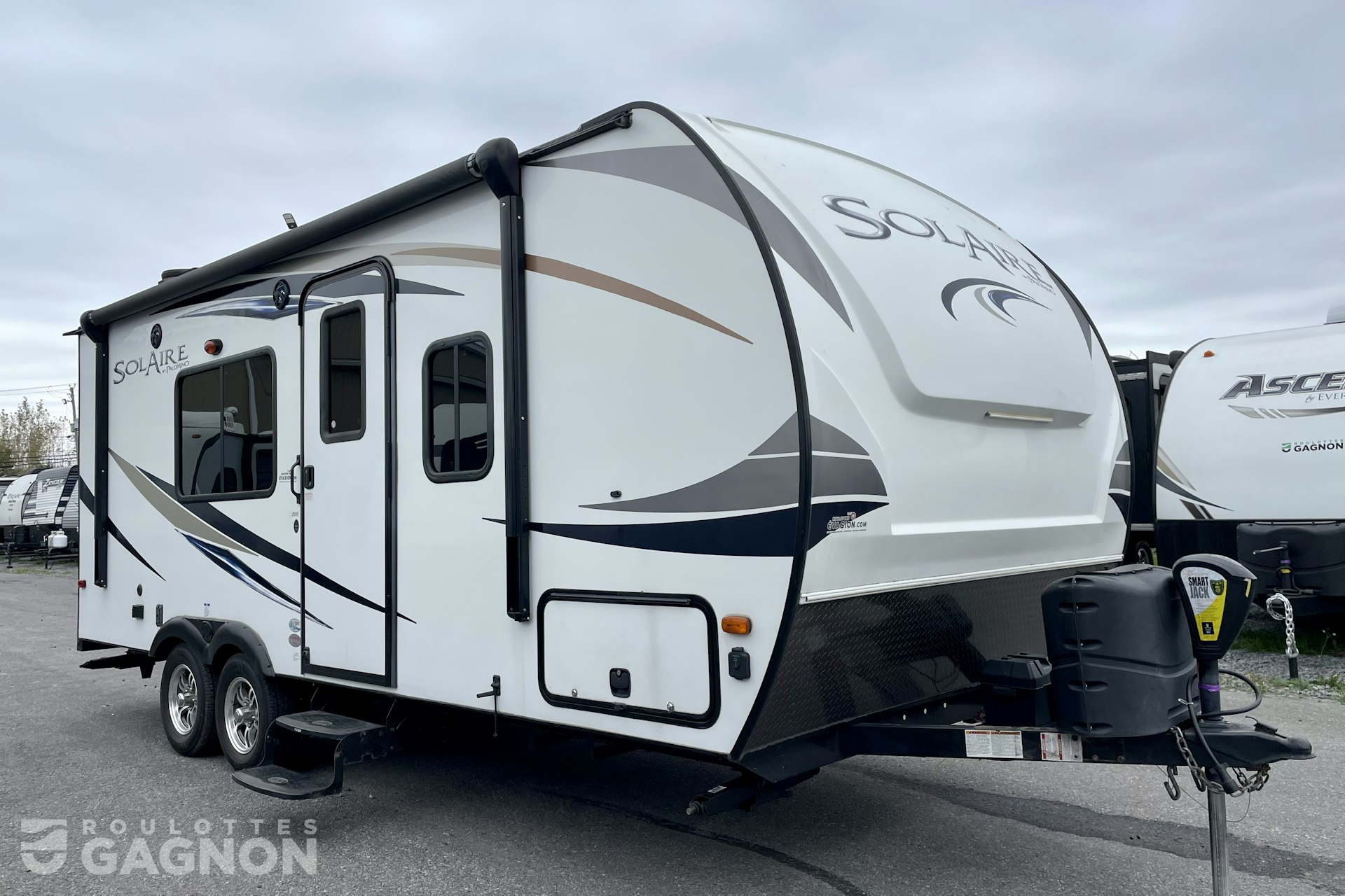 Roulotte Solaire 202 RB 2017 usagée à vendre. Cette roulotte de voyage fabriquée par Forest River est idéale pour un couple et peut coucher jusqu’à 4 personnes. La Solaire 202 RB mesure 23,4 pieds et pèse 4 000 lb, son revêtement est en gel coat et les options suivantes sont incluses : jack de pole électrique, vérins stabilisateurs manuels, préparation pour caméra de recul, auvent électrique, prise câble ou satellite, prise pour panneau solaire, bluetooth, prise USB, radio, hauts parleurs extérieurs, éclairage au DEL, climatiseur, puits de lumière, douche extérieure et mags.