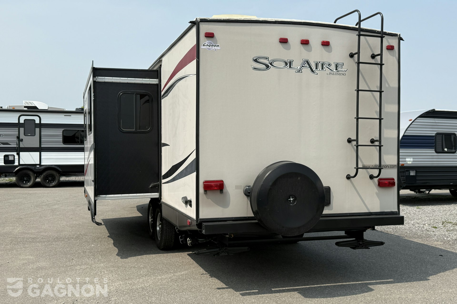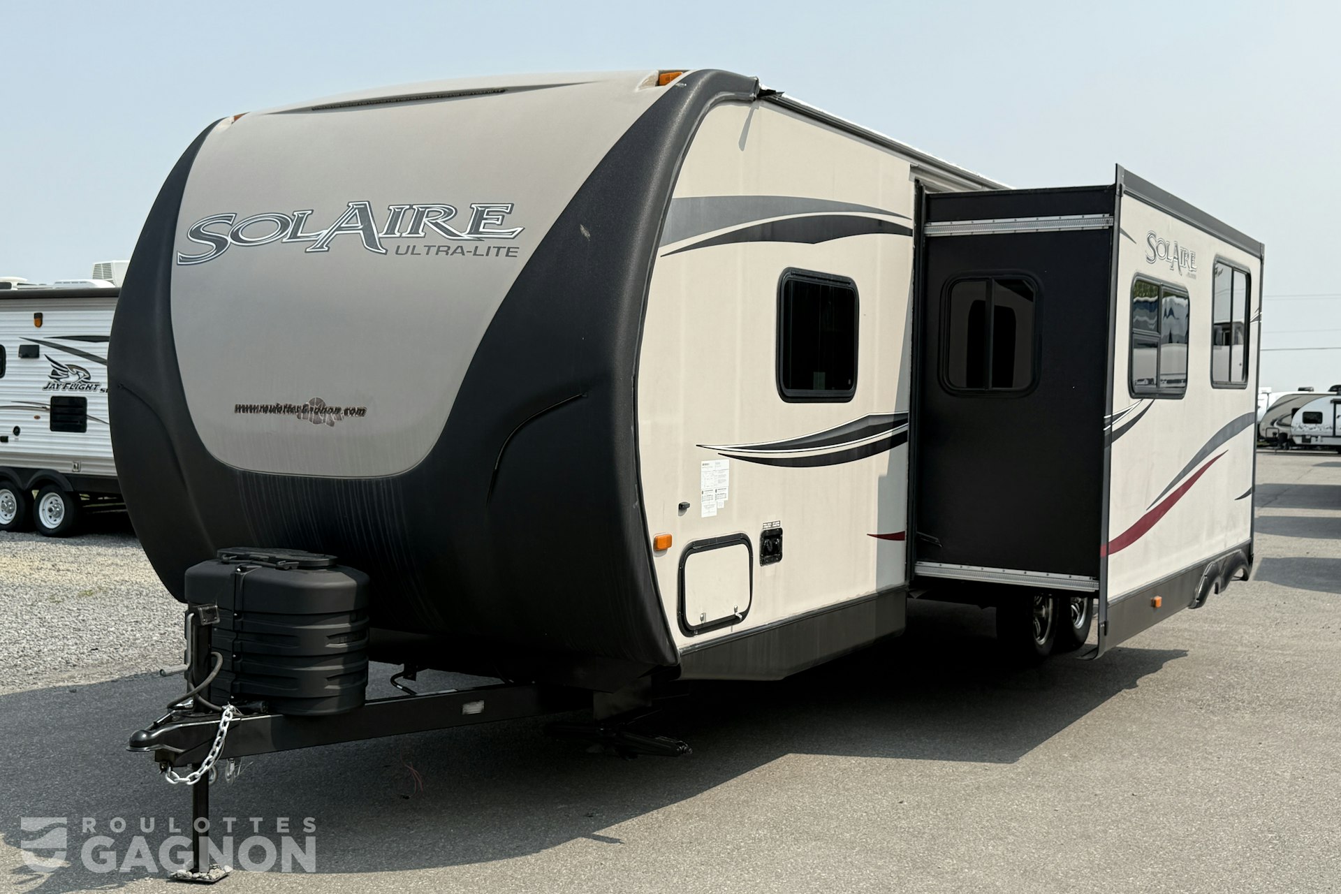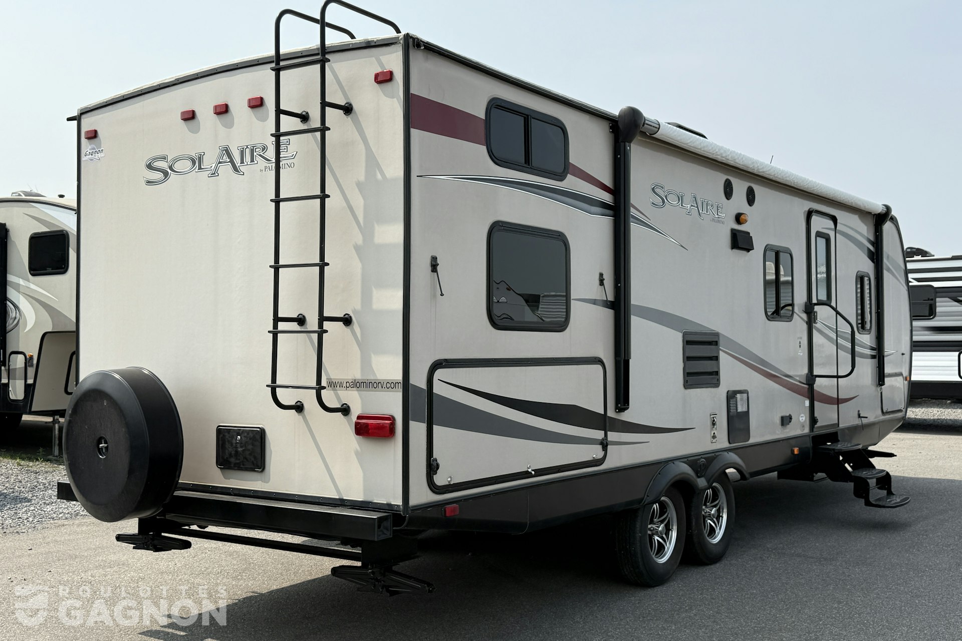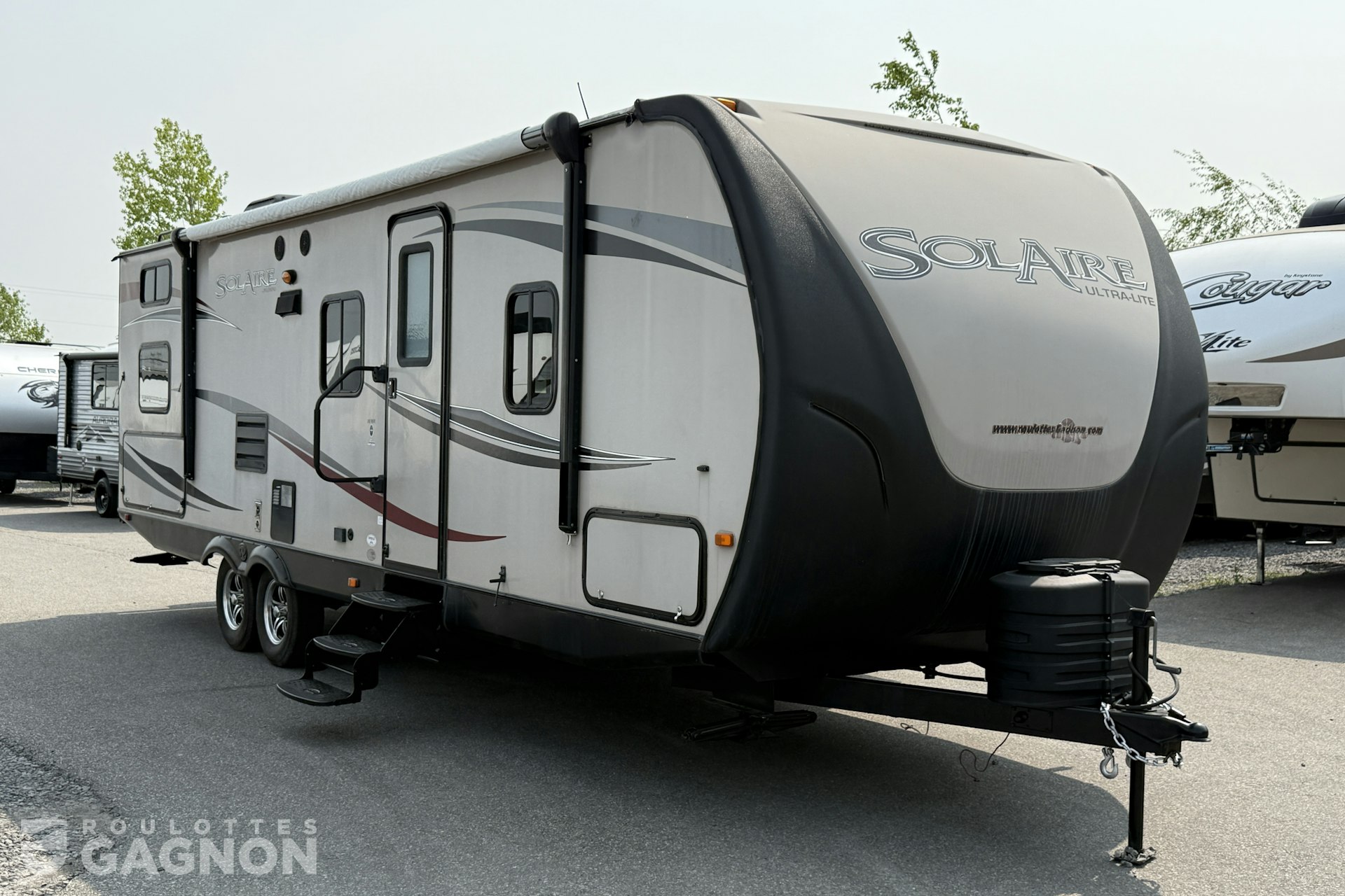Roulotte Solaire 267 BHSK 2014 usagée à vendre. Cette roulotte de voyage fabriquée par Forest River est idéale pour une famille et peut coucher jusqu’à 8 personnes. La Solaire 267 BHSK mesure 30.9 pieds et pèse 5290 lb, son revêtement est en fibre de verre et les options suivantes sont incluses : vérins stabilisateurs manuels, échelle, auvent électrique, prise câble ou satellite, radio, hauts parleurs extérieurs, éclairage au DEL, cuisinette extérieure, climatiseur, puits de lumière, douche extérieure et mags.
