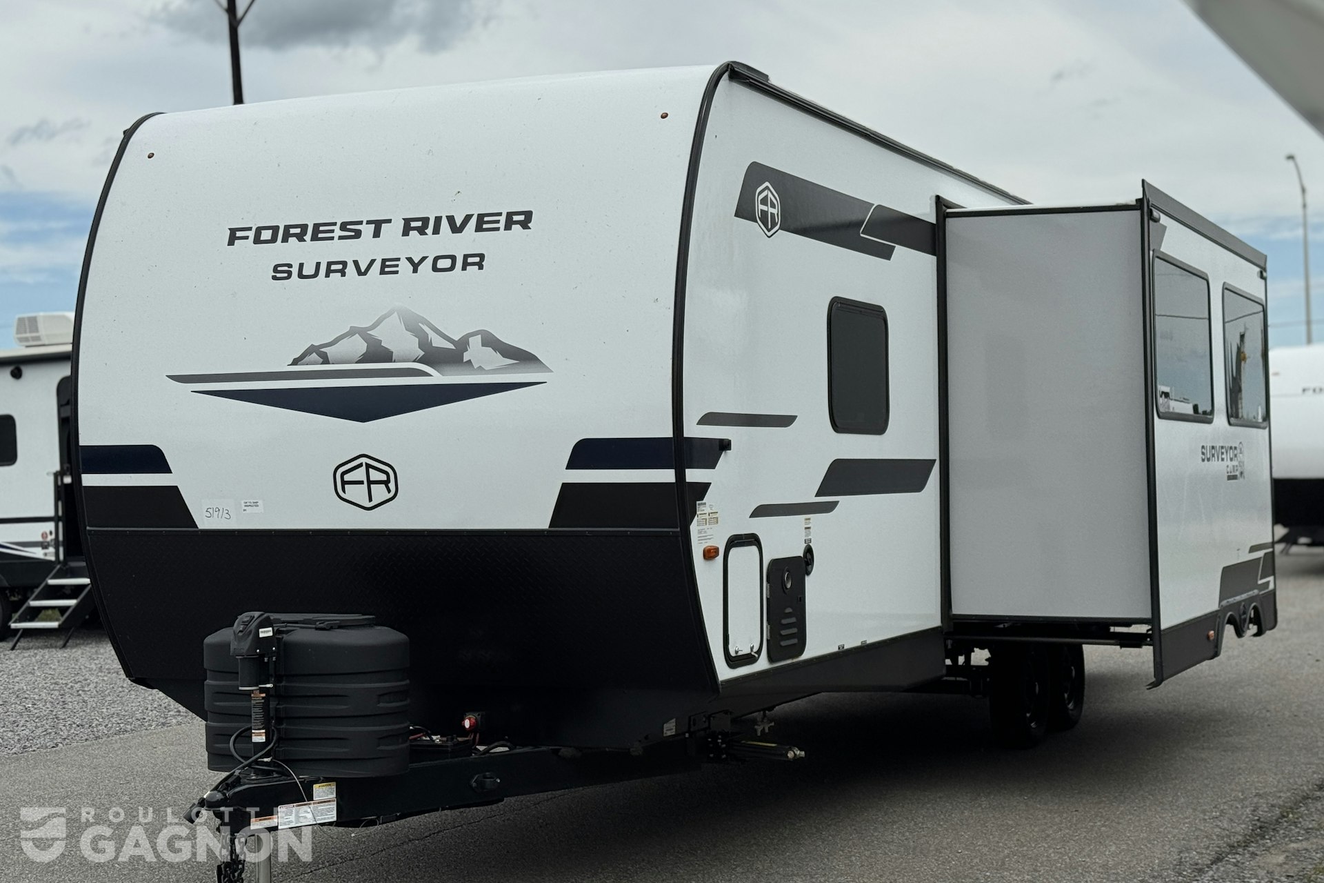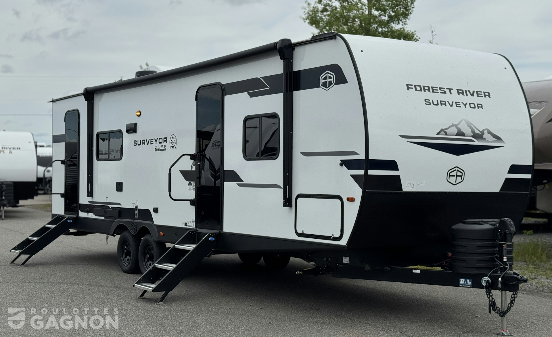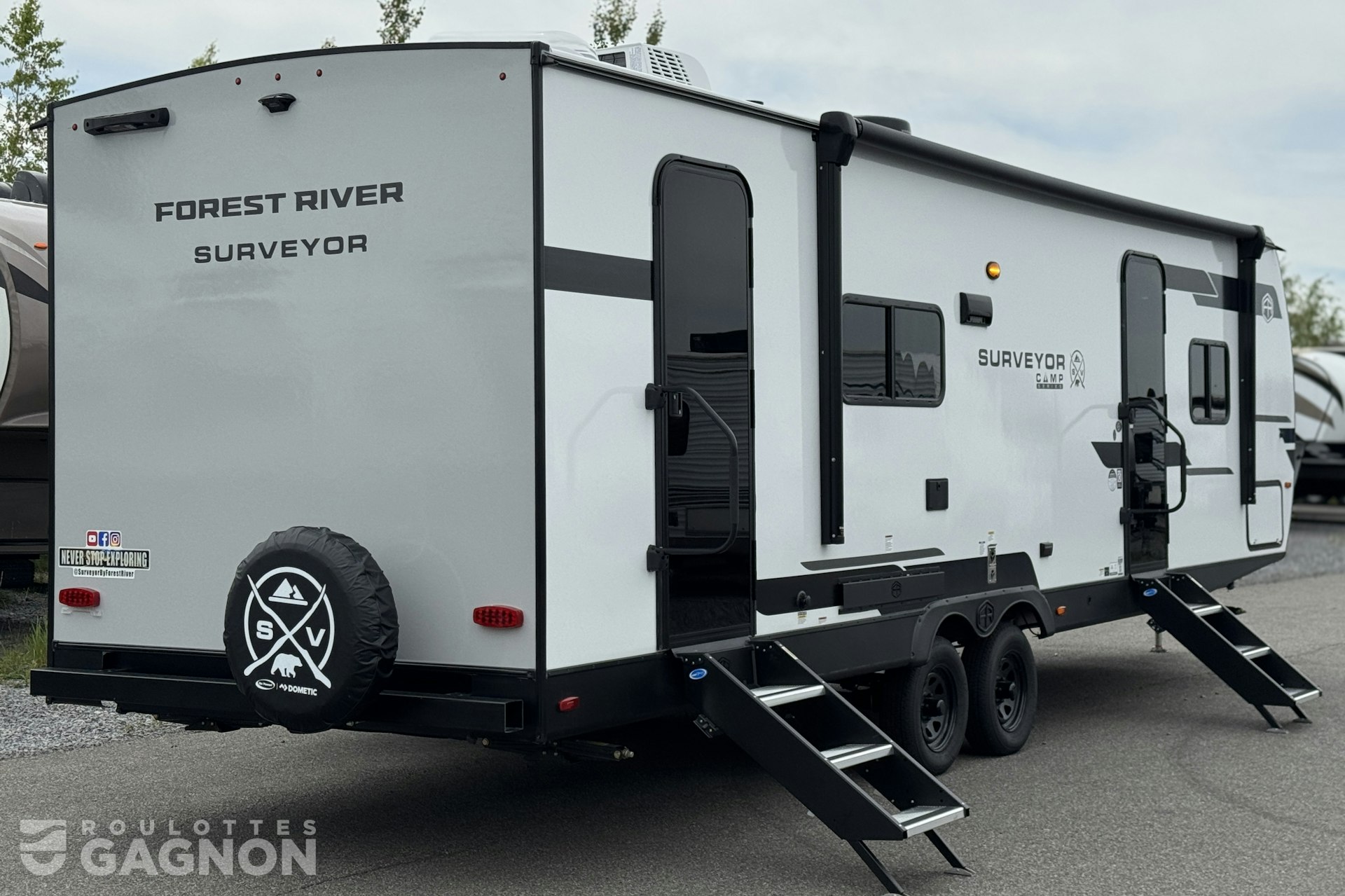 Roulotte Surveyor 27 CAMP 2026 neuve à vendre. Cette roulotte de voyage fabriquée par Forest River est idéale pour une famille et peut coucher jusqu’à 10 personnes. La Surveyor 27 CAMP mesure 33,4 pieds et pèse 6 308 lb, son revêtement est en fibre de verre et les options suivantes sont incluses : jack de pole électrique, vérins stabilisateurs électriques, préparation pour caméra de recul, auvent électrique, marche pied en un bloc (solid step), prise câble ou satellite, bluetooth, prise USB, éclairage au DEL, douche extérieure, panneau solaire 400, prises usb c, chauffe-eau instantané, préparation pour laveuse et sécheuse et foyer électrique.