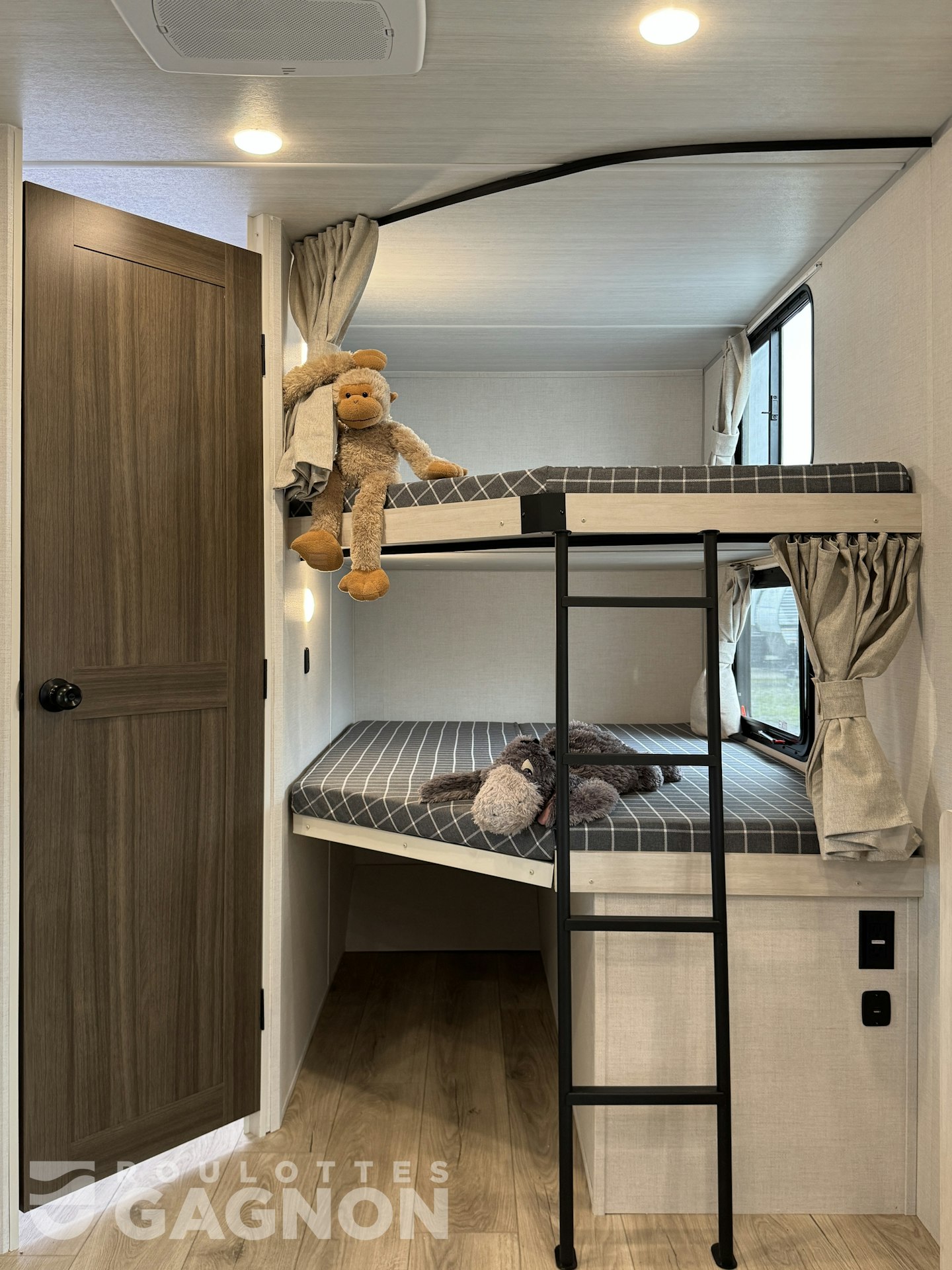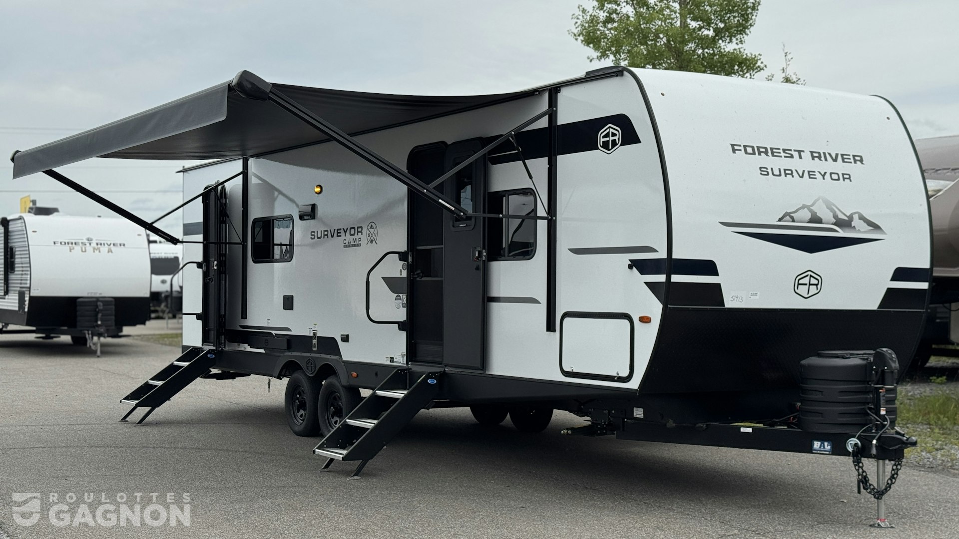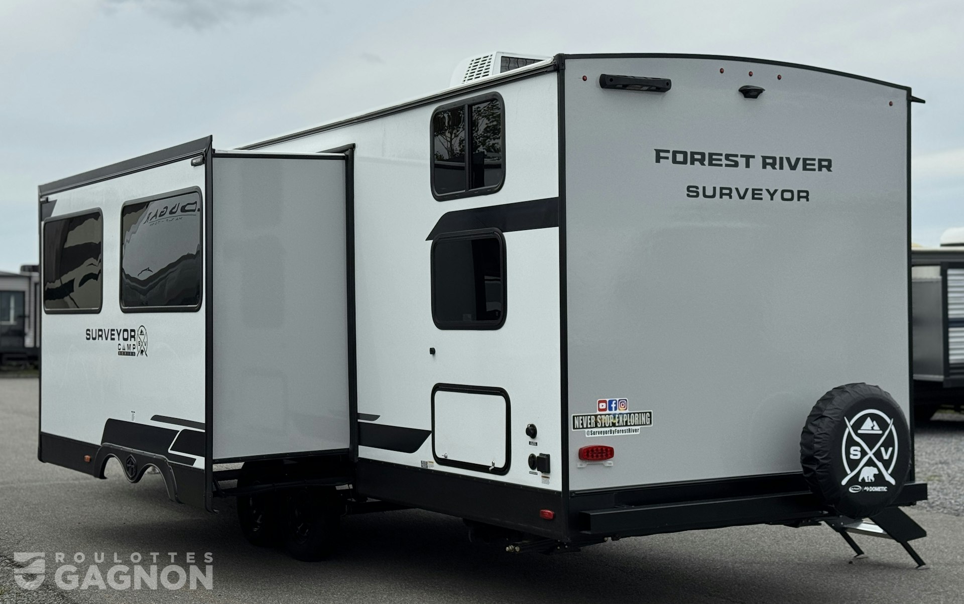 Roulotte Surveyor 27 CAMP 2026 neuve à vendre. Cette roulotte de voyage fabriquée par Forest River est idéale pour une famille et peut coucher jusqu’à 10 personnes. La Surveyor 27 CAMP mesure 33,4 pieds et pèse 6 308 lb, son revêtement est en fibre de verre et les options suivantes sont incluses : jack de pole électrique, vérins stabilisateurs électriques, préparation pour caméra de recul, auvent électrique, marche pied en un bloc (solid step), prise câble ou satellite, bluetooth, prise USB, éclairage au DEL, douche extérieure, panneau solaire 400, prises usb c, chauffe-eau instantané, préparation pour laveuse et sécheuse et foyer électrique.