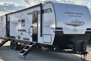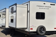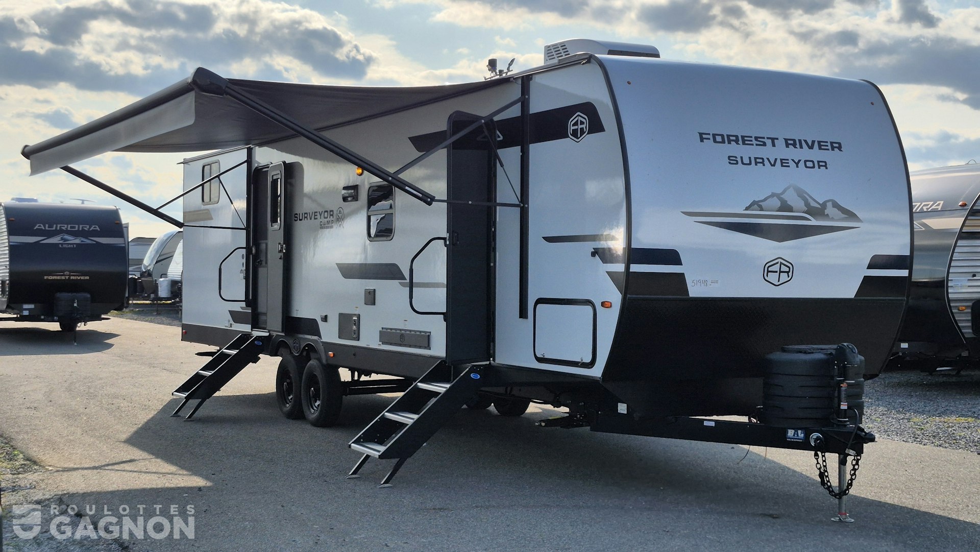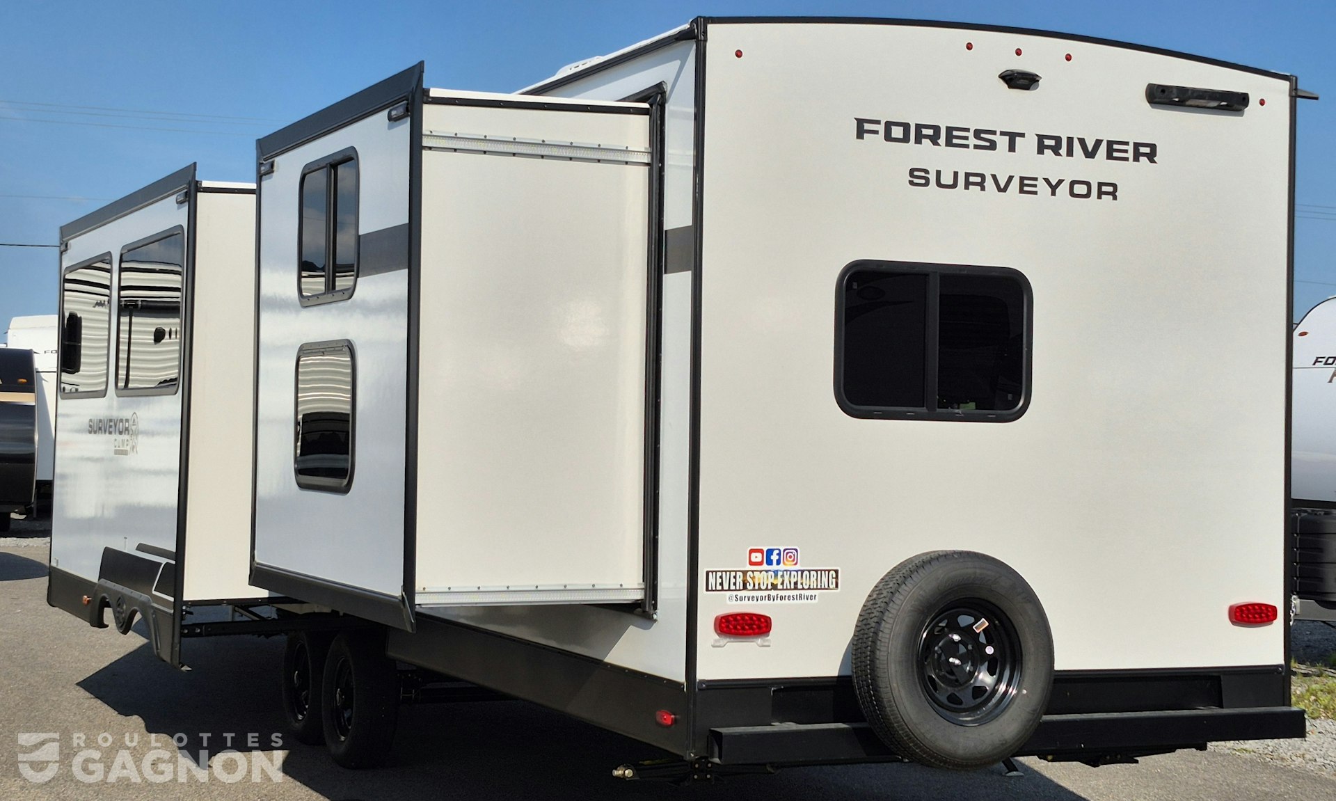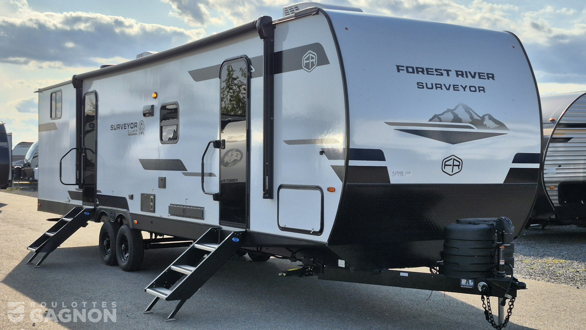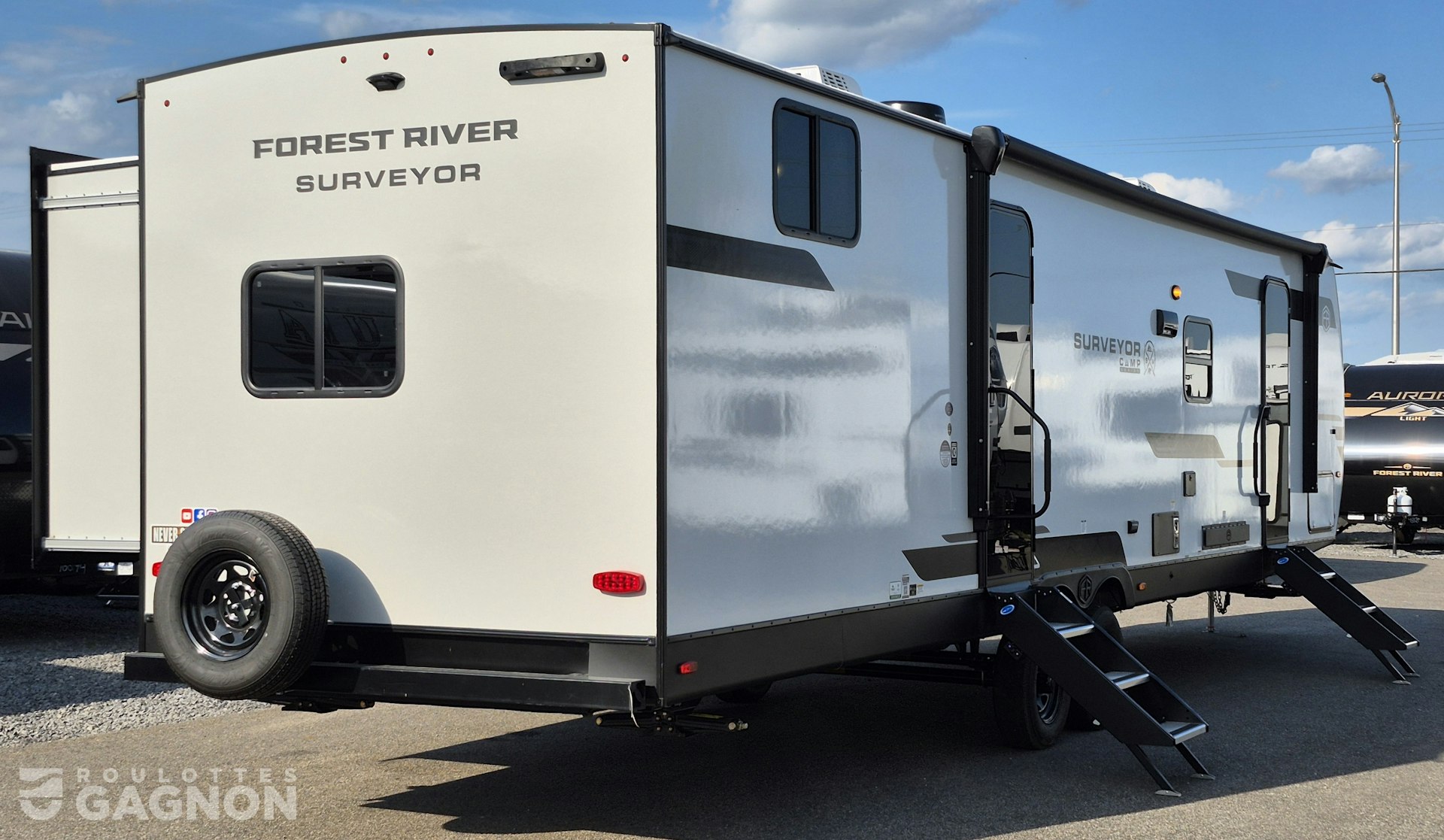 Roulotte Surveyor 32 CAMP 2026 neuve à vendre. Cette roulotte de voyage fabriquée par Forest River est idéale pour une famille et peut coucher jusqu’à 9 personnes. La Surveyor 32 CAMP mesure 37,9 pieds et pèse 7 295 lb, son revêtement est en fibre de verre sur Azdel et les options suivantes sont incluses : jack de pole électrique, vérins stabilisateurs manuels, préparation pour caméra de recul, auvent électrique, marche pied en un bloc (solid step), prise câble ou satellite, prise USB, éclairage au DEL, climatiseur, puits de lumière, douche extérieure, panneau solaire 400 w, préparation pour laveuse et sécheuse, foyer électrique, prises usb c et chauffe-eau instantané.