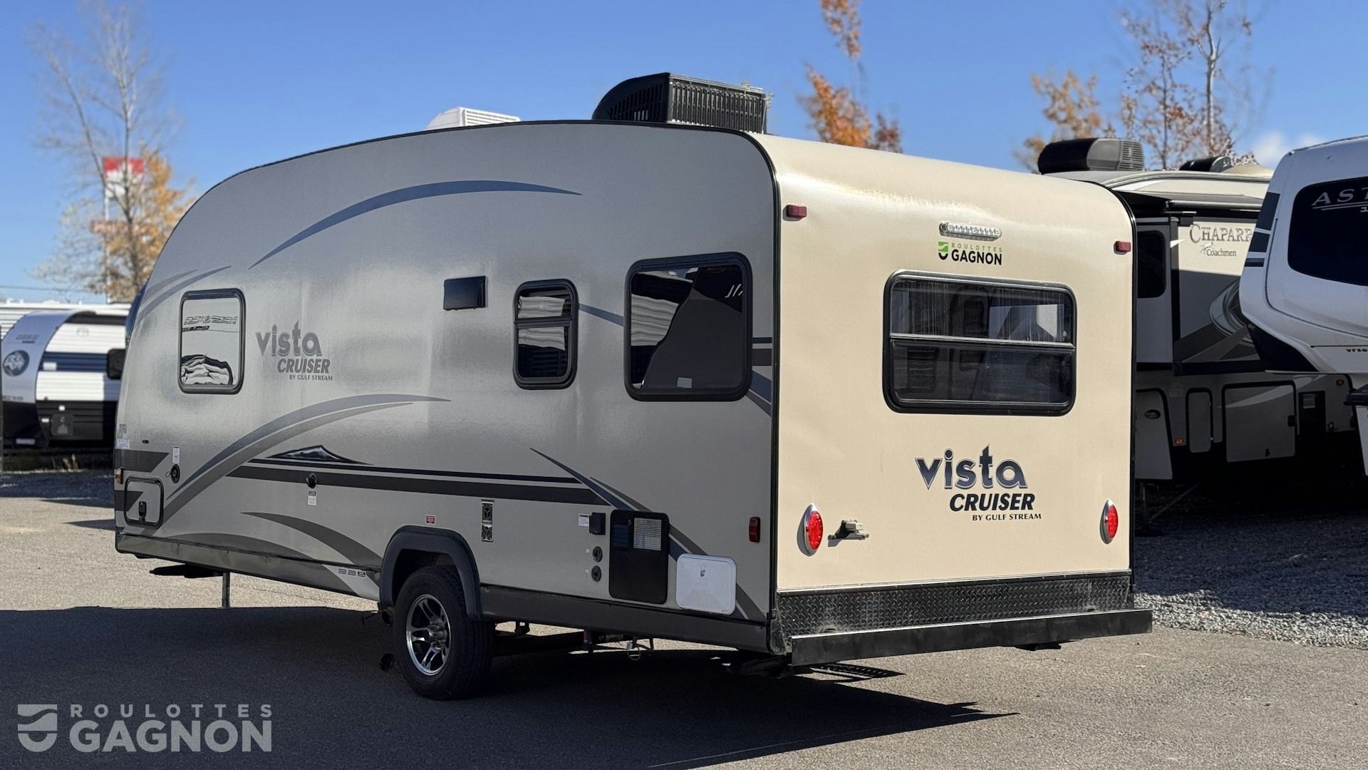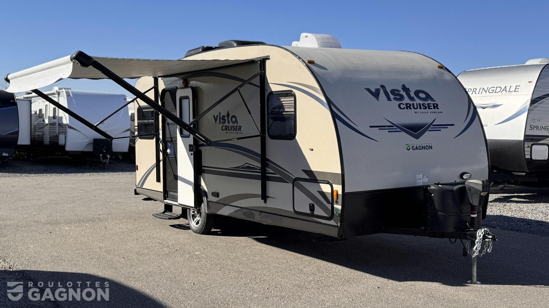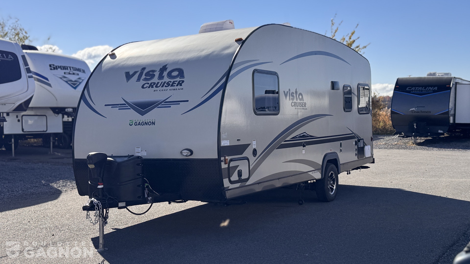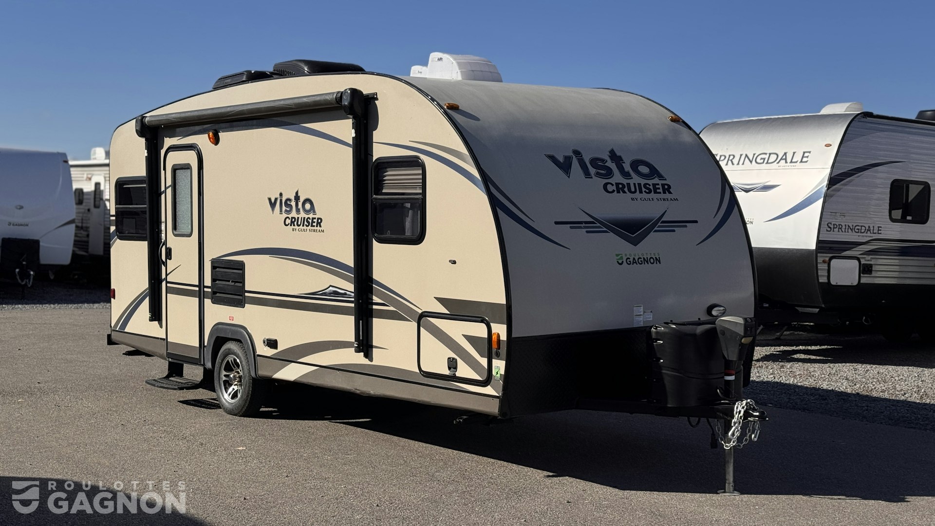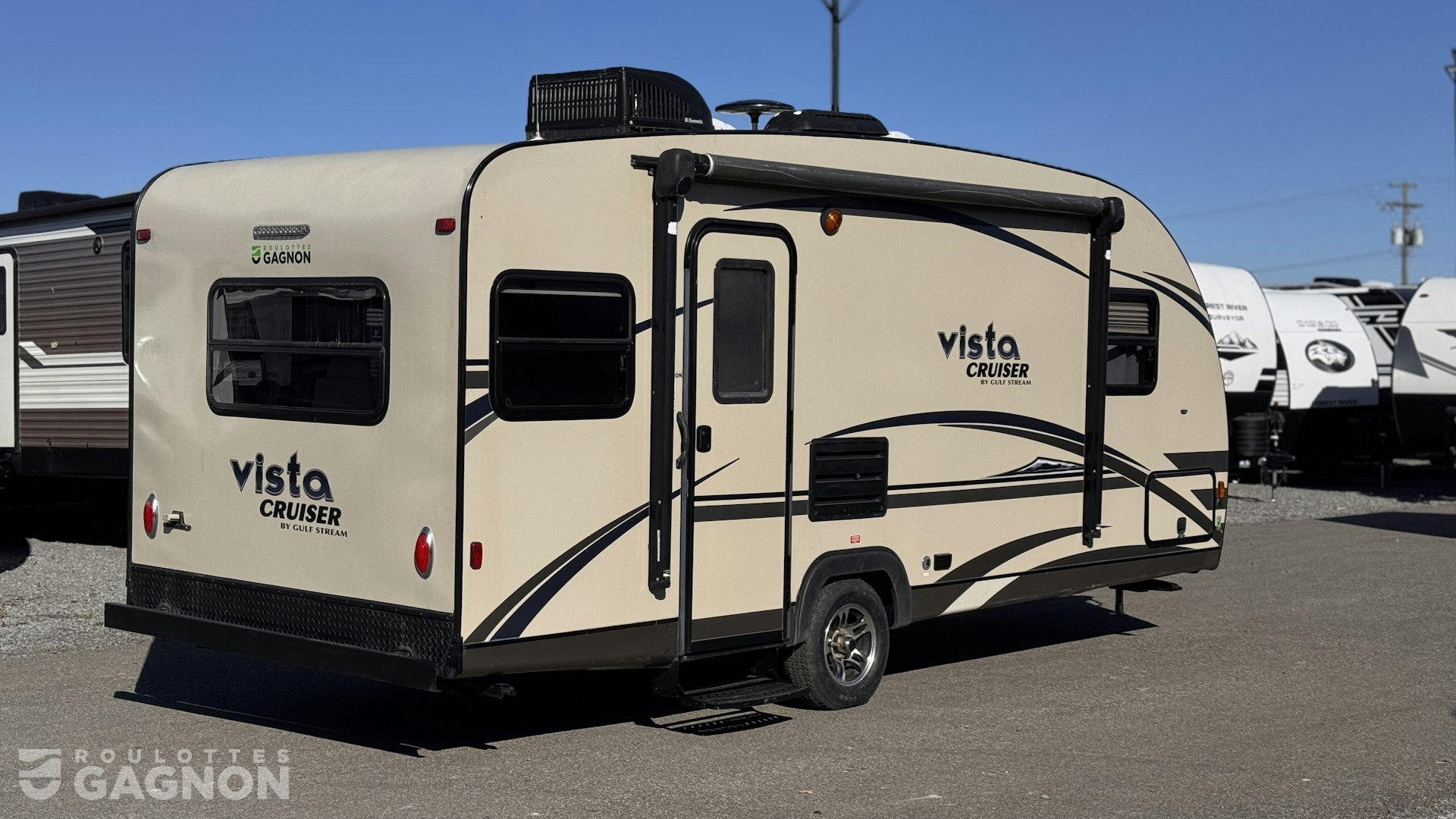 Roulotte Vista Cruiser 19 ERD 2017 usagée à vendre. Cette roulotte de voyage fabriquée par Gulfstream peut coucher jusqu’à 4 personnes. La Vista Cruiser 19 ERD mesure 23 pieds et pèse 2 847 lb, son revêtement est en fibre de verre et les options suivantes sont incluses : vérins stabilisateurs électriques, auvent électrique, prise câble ou satellite, prise USB, radio, hauts parleurs extérieurs, éclairage au DEL, climatiseur, puits de lumière, douche extérieure et mags.