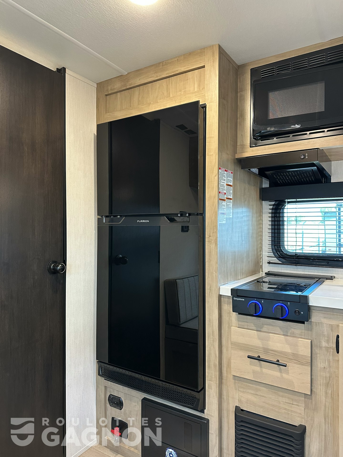 Roulotte Wolf Pup 16 FQBL-W 2026 Black Label usagée à vendre. Cette roulotte de voyage fabriquée par Forest River est idéale pour un couple et peut coucher jusqu’à 3 personnes. La Wolf Pup 16 FQBL-W mesure 21.1 pieds et pèse 3842 lb, son revêtement est en fibre de verre et les options suivantes sont incluses : jack de pole électrique, vérins stabilisateurs manuels, préparation pour caméra de recul, caméra de recul incluse, auvent électrique, marche pied en un bloc (solid step), prise câble ou satellite, bluetooth, prise USB, radio, hauts parleurs extérieurs, éclairage au DEL, climatiseur, douche extérieure, mags, panneau solaire, ondulateur 150w près du lit, chauffe-eau instantané et frigo extérieur.