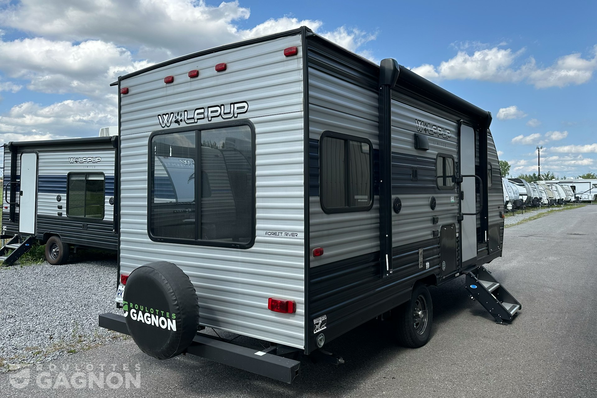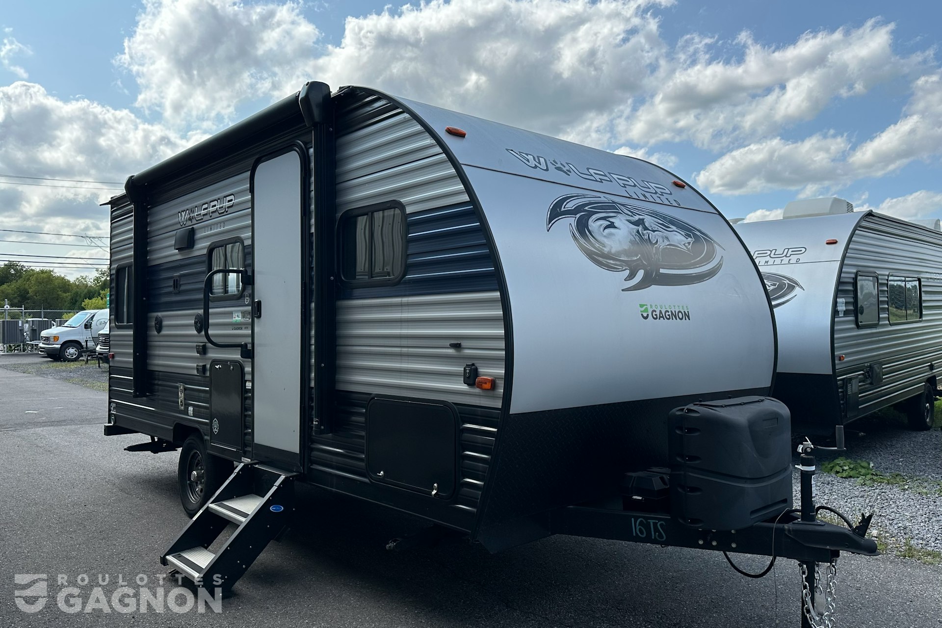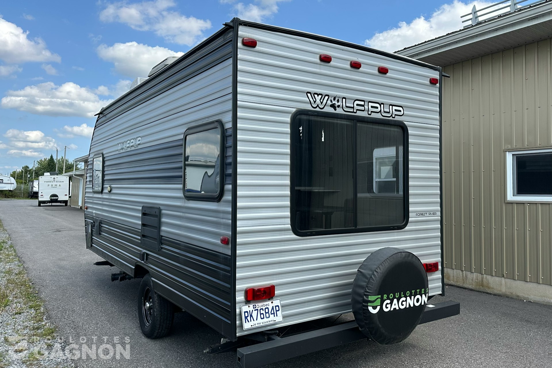 Roulotte Wolf Pup 16 TS 2021 usagée à vendre. Cette roulotte de voyage fabriquée par Forest River est idéale pour un couple et peut coucher jusqu’à 4 personnes. La Wolf Pup 16 TS mesure 21.6 pieds et pèse 3175 lb, son revêtement est en aluminium et les options suivantes sont incluses : vérins stabilisateurs manuels, préparation pour caméra de recul, auvent électrique, marche pied en un bloc (solid step), prise câble ou satellite, prise pour panneau solaire, bluetooth, prise USB, téléviseur, radio, hauts parleurs extérieurs, éclairage au DEL, climatiseur, douche extérieure et frigo extérieur.